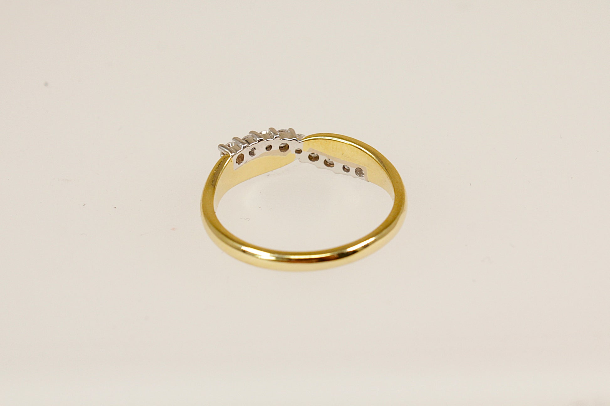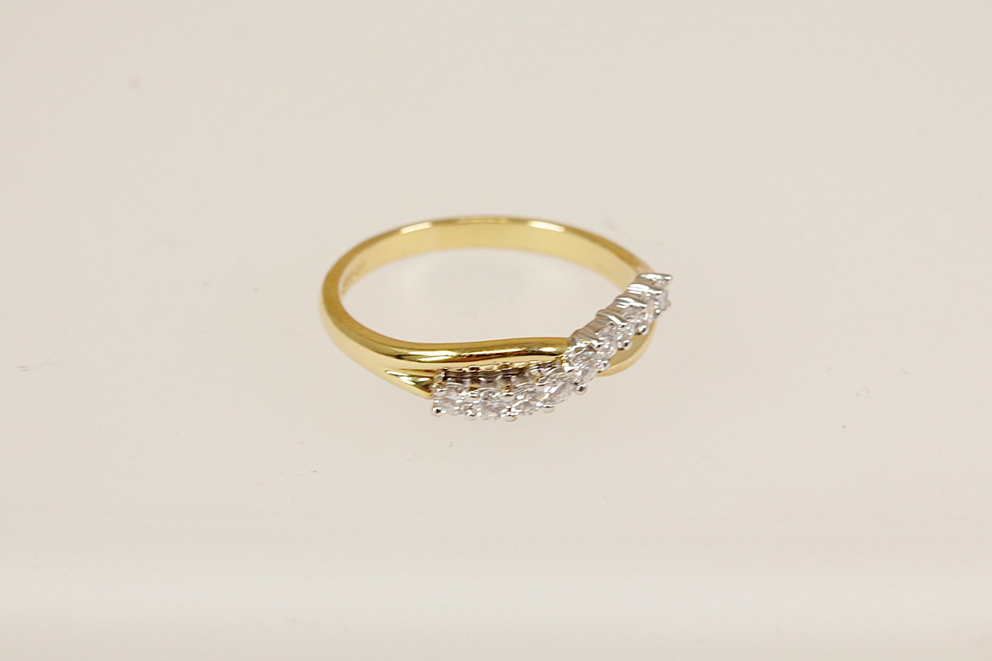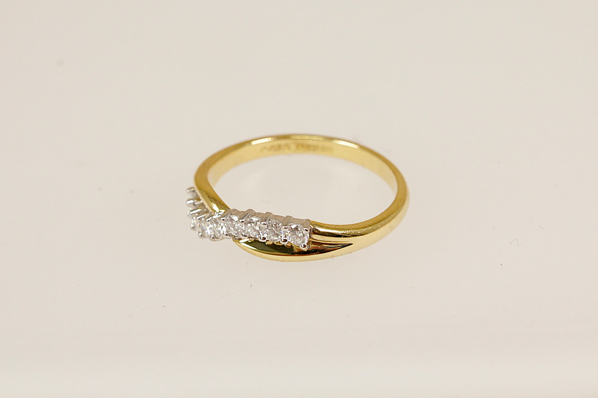This beautifully crafted 18ct gold half eternity ring features a graceful crossover design, forming a soft wave or 'S' shape that flows elegantly across the finger. Set with nine round brilliant-cut diamonds.