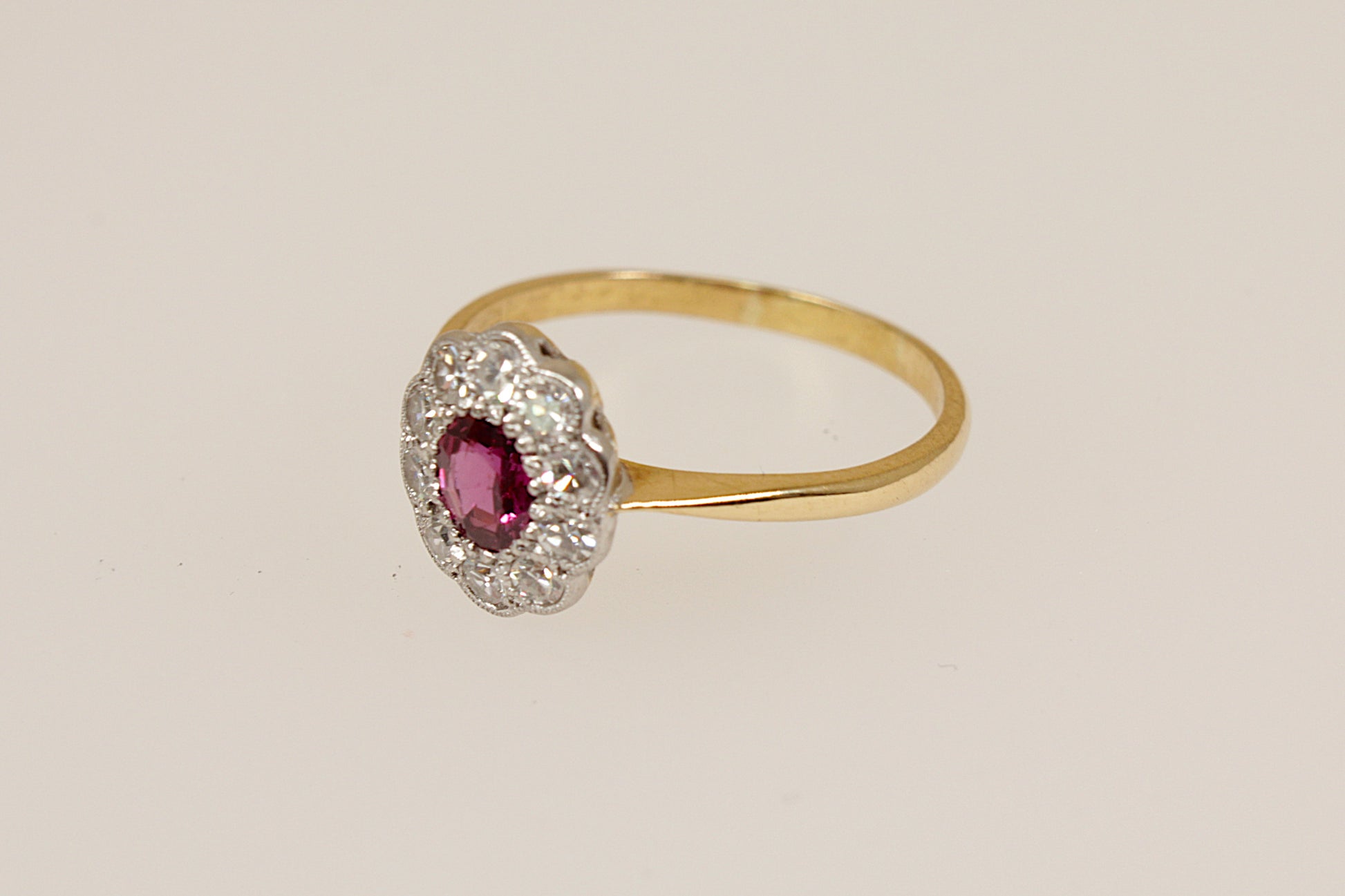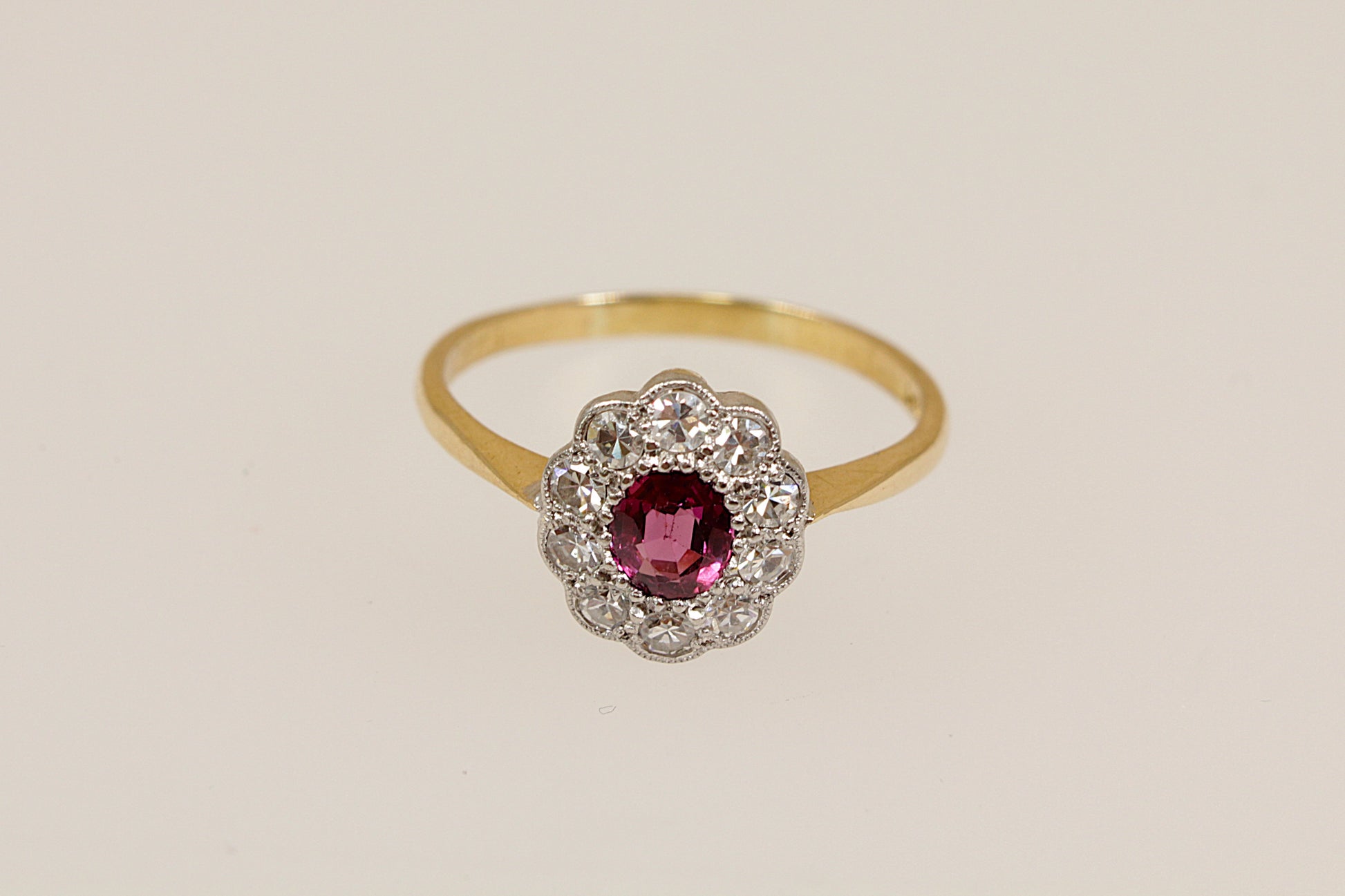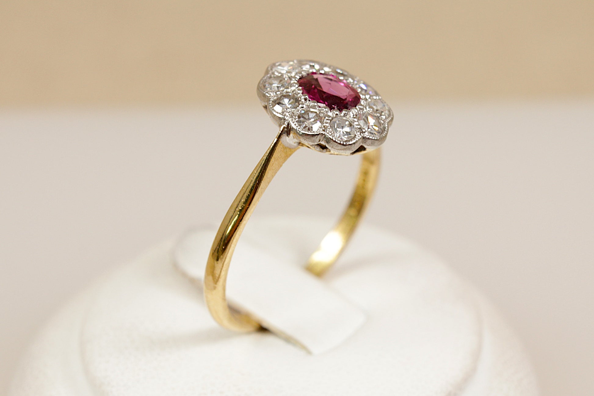 A truly stunning vintage Ruby cluster ring, crafted in 18ct yellow Gold with a Platinum setting. At its heart sits a vibrant oval faceted Ruby surrounded by a halo of 10 sparkling Diamonds. This creates a timeless and elegant display of colour and brilliance.