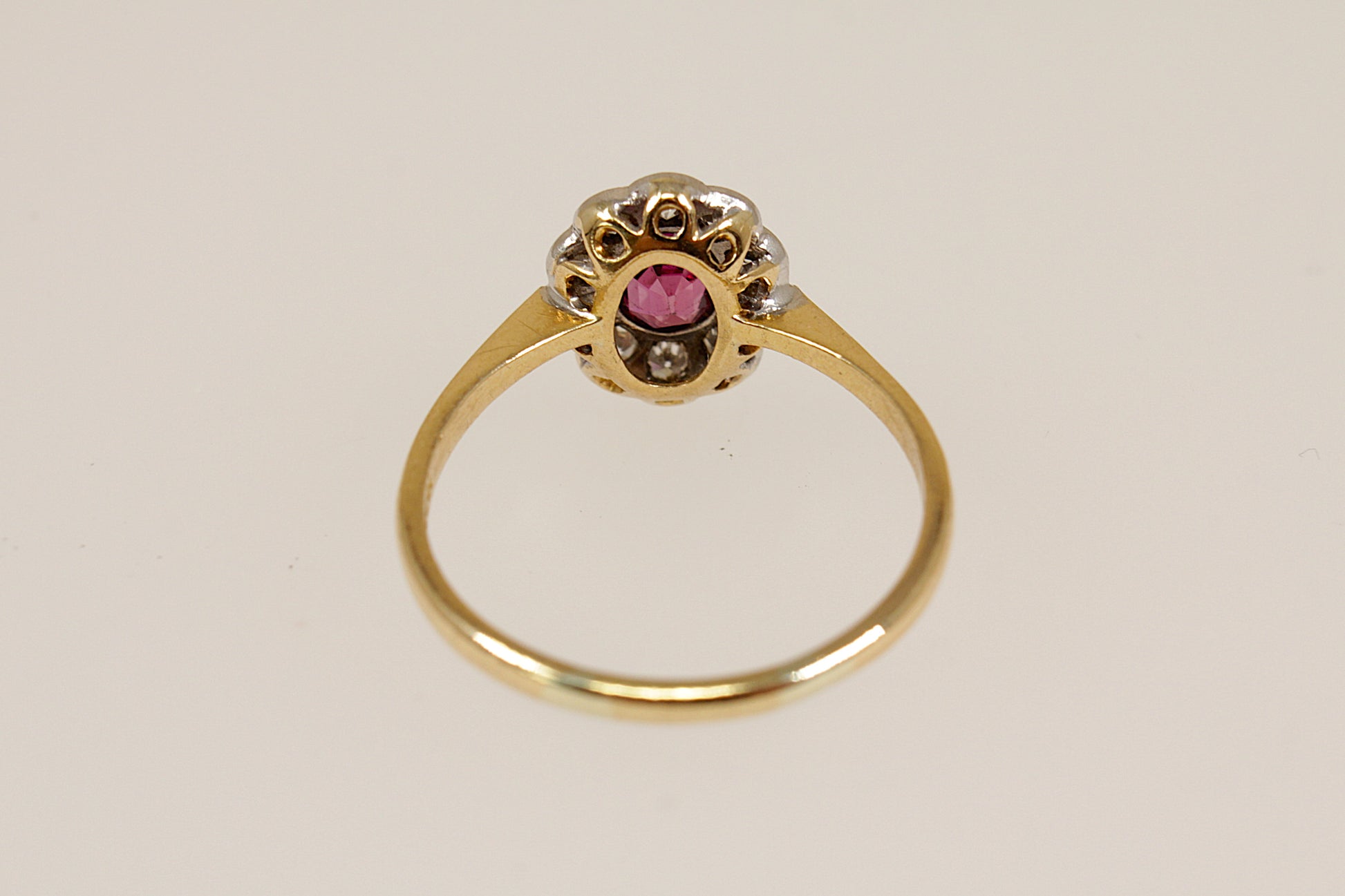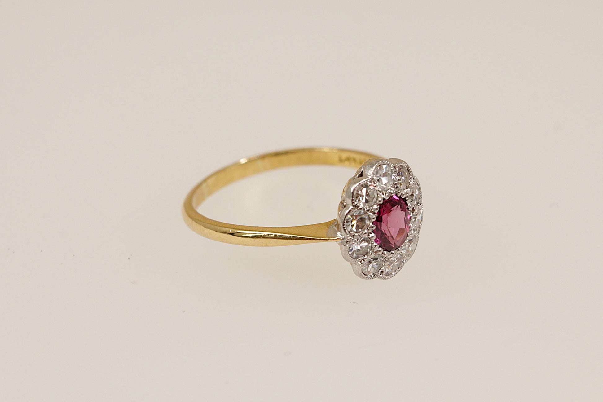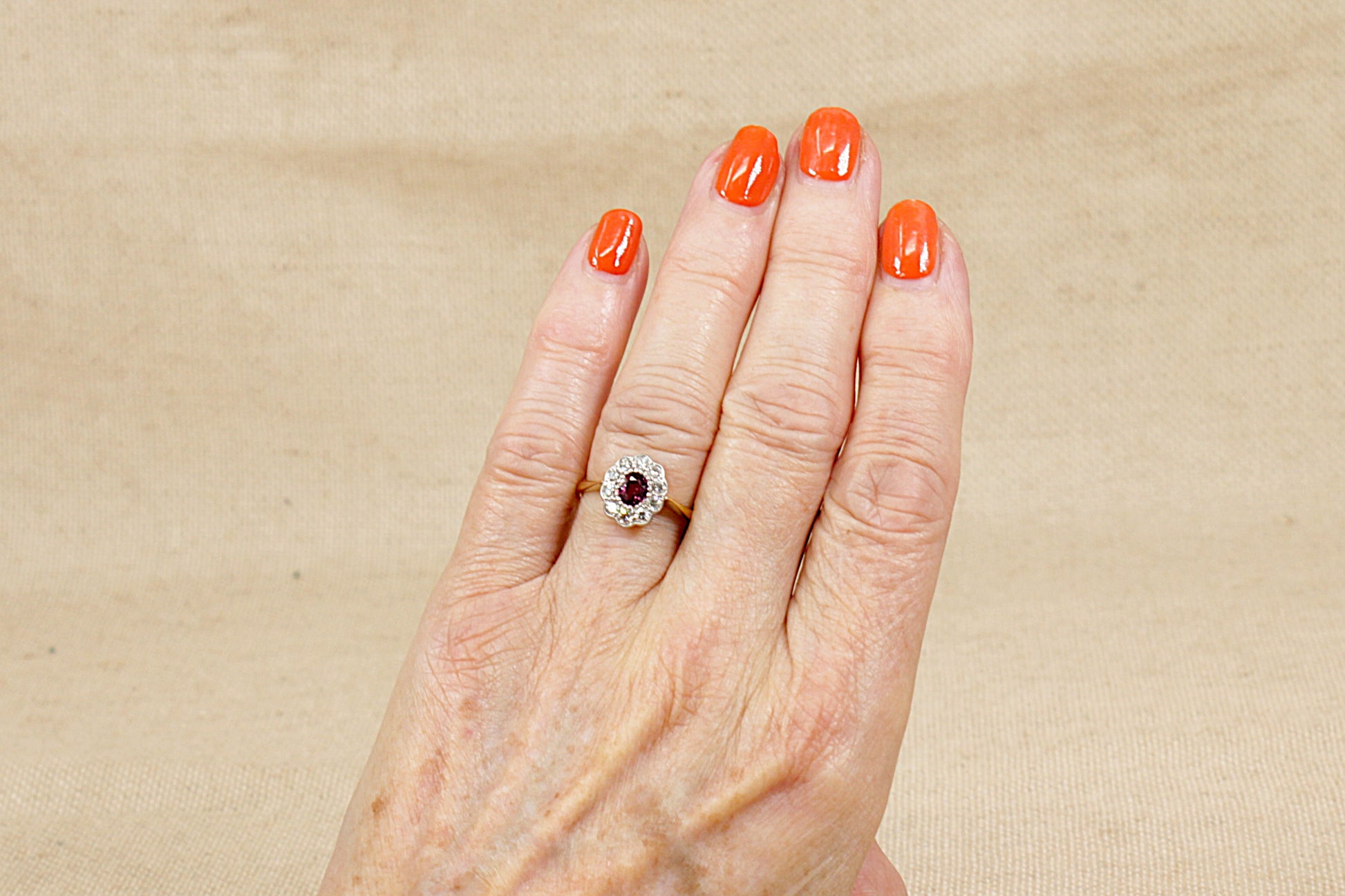 A truly stunning vintage Ruby cluster ring, crafted in 18ct yellow Gold with a Platinum setting. At its heart sits a vibrant oval faceted Ruby surrounded by a halo of 10 sparkling Diamonds. This creates a timeless and elegant display of colour and brilliance.