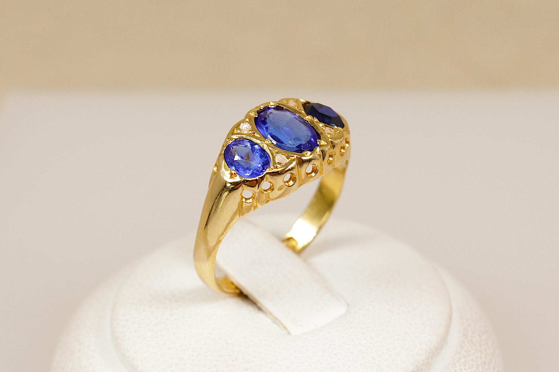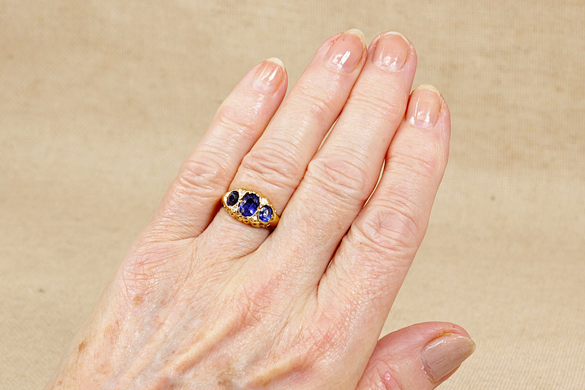 The ring features three oval deep blue stones of graduating size, arranged in a classic trilogy design.