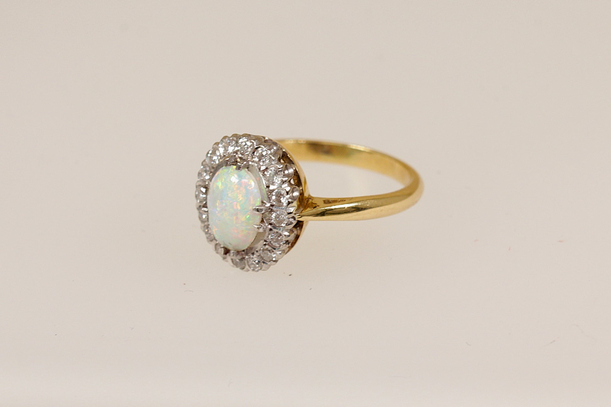 This exquisite 18ct Gold ring features an oval fire opal, displaying vibrant flashes of green, orange, and blue, claw set as the centrepiece.