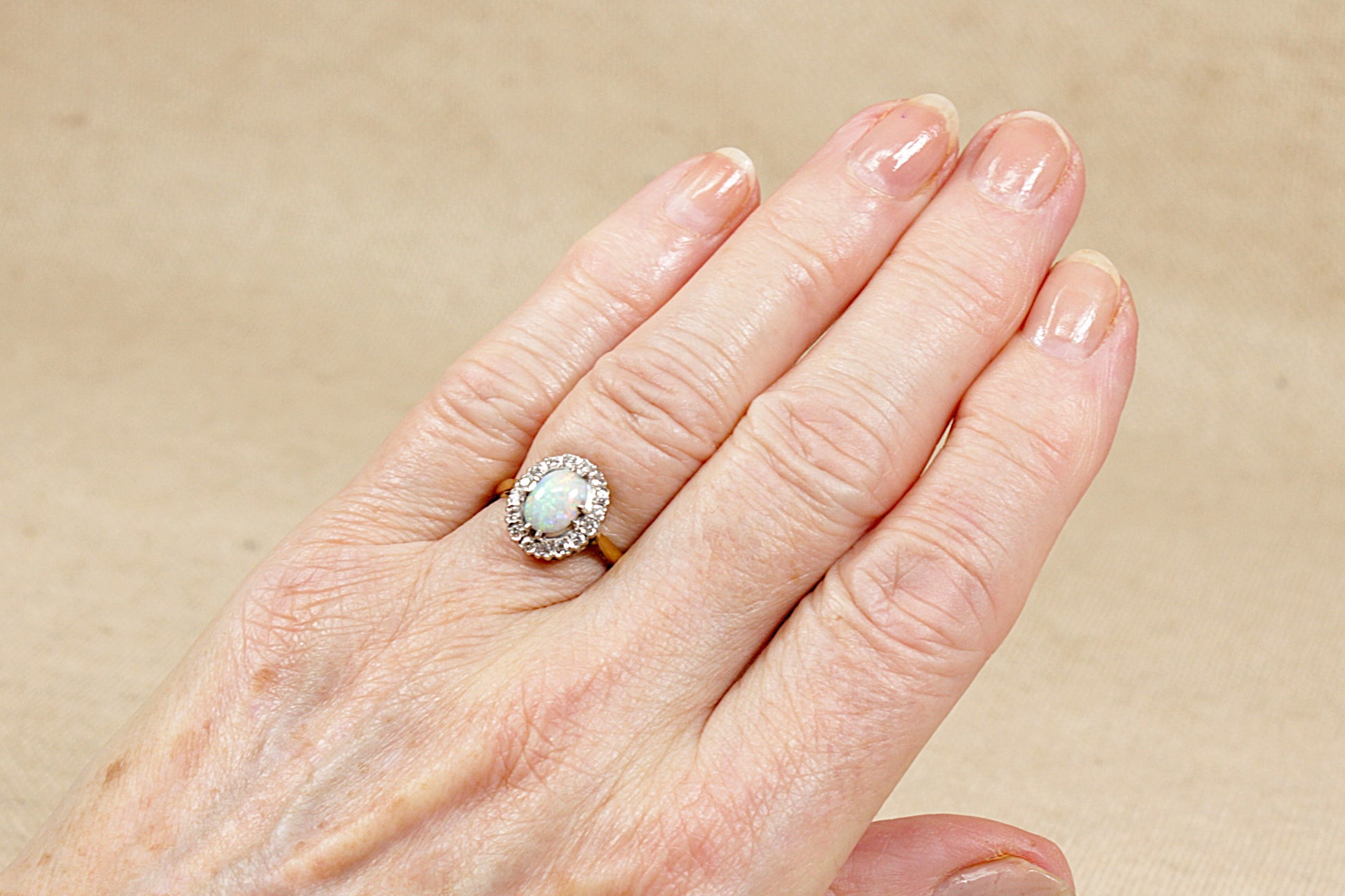 Surrounding the opal is a halo of 16 brilliant diamonds, enhancing the fiery brilliance of the central stone.