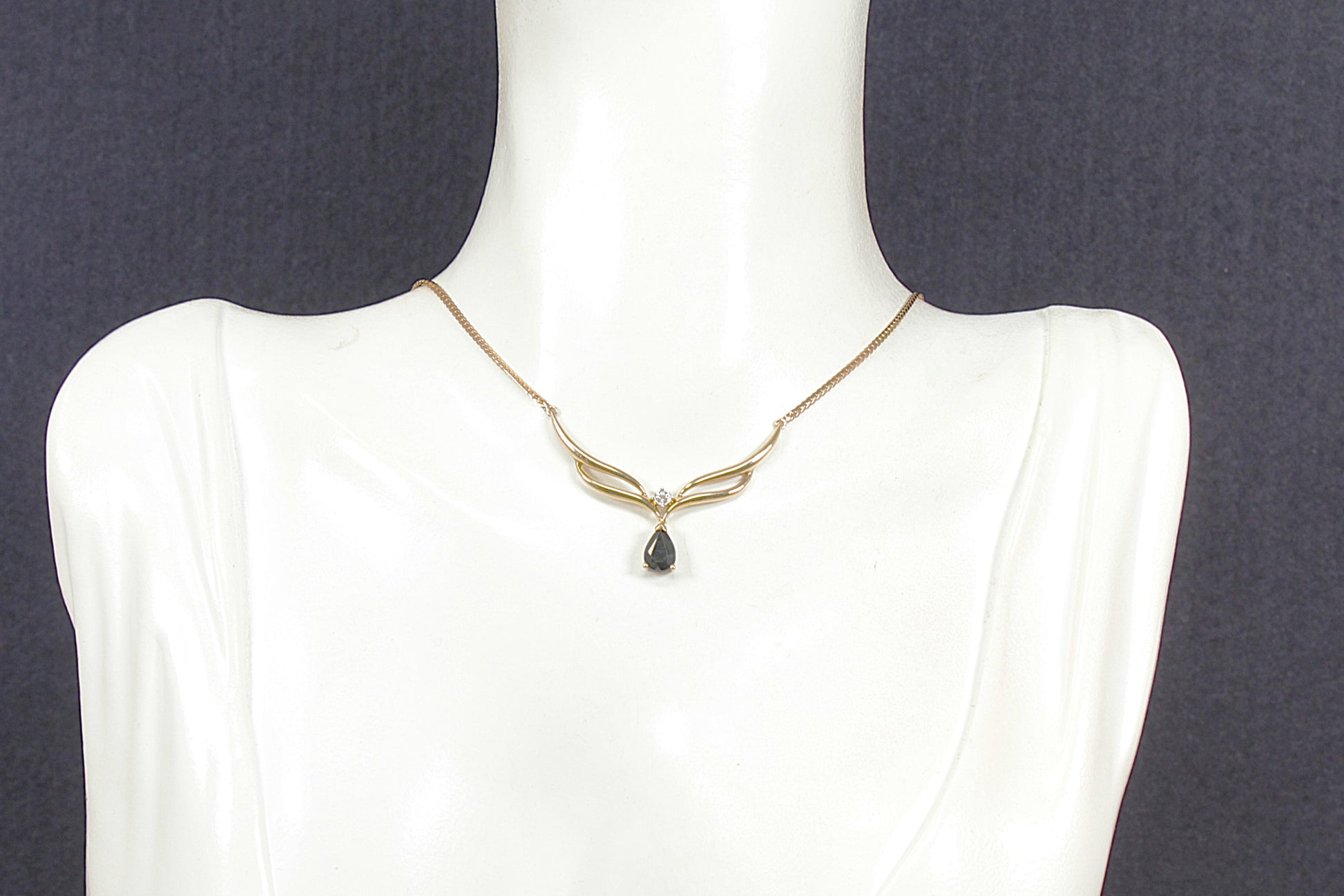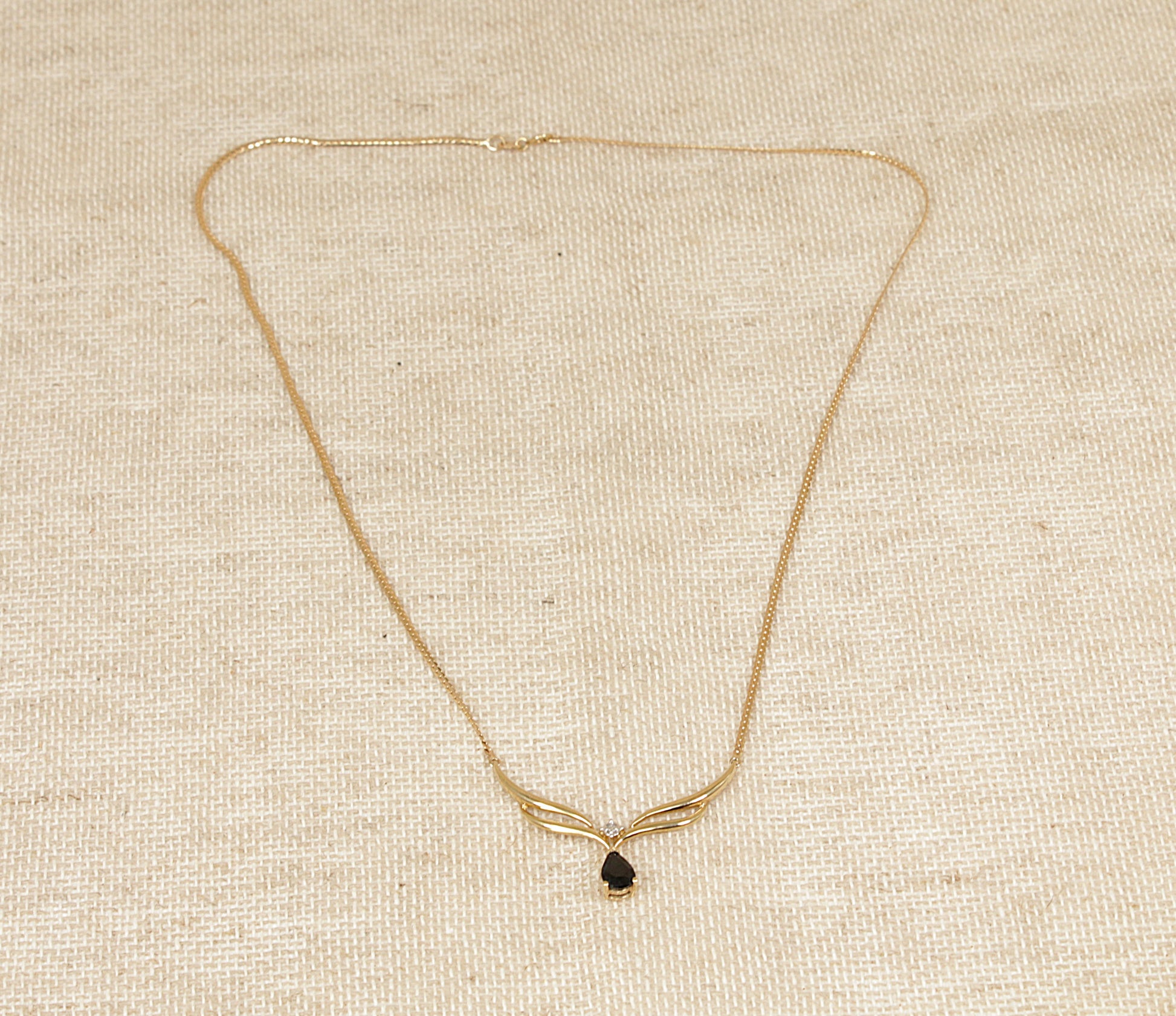A beautiful and elegant 9ct Gold necklet featuring a graceful 1.5-inch wing-shaped pendant. At its centre, a sparkling diamond sits in a claw setting, suspending a pear-shaped Blue Sapphire dropper that moves delicately with the wearer.
