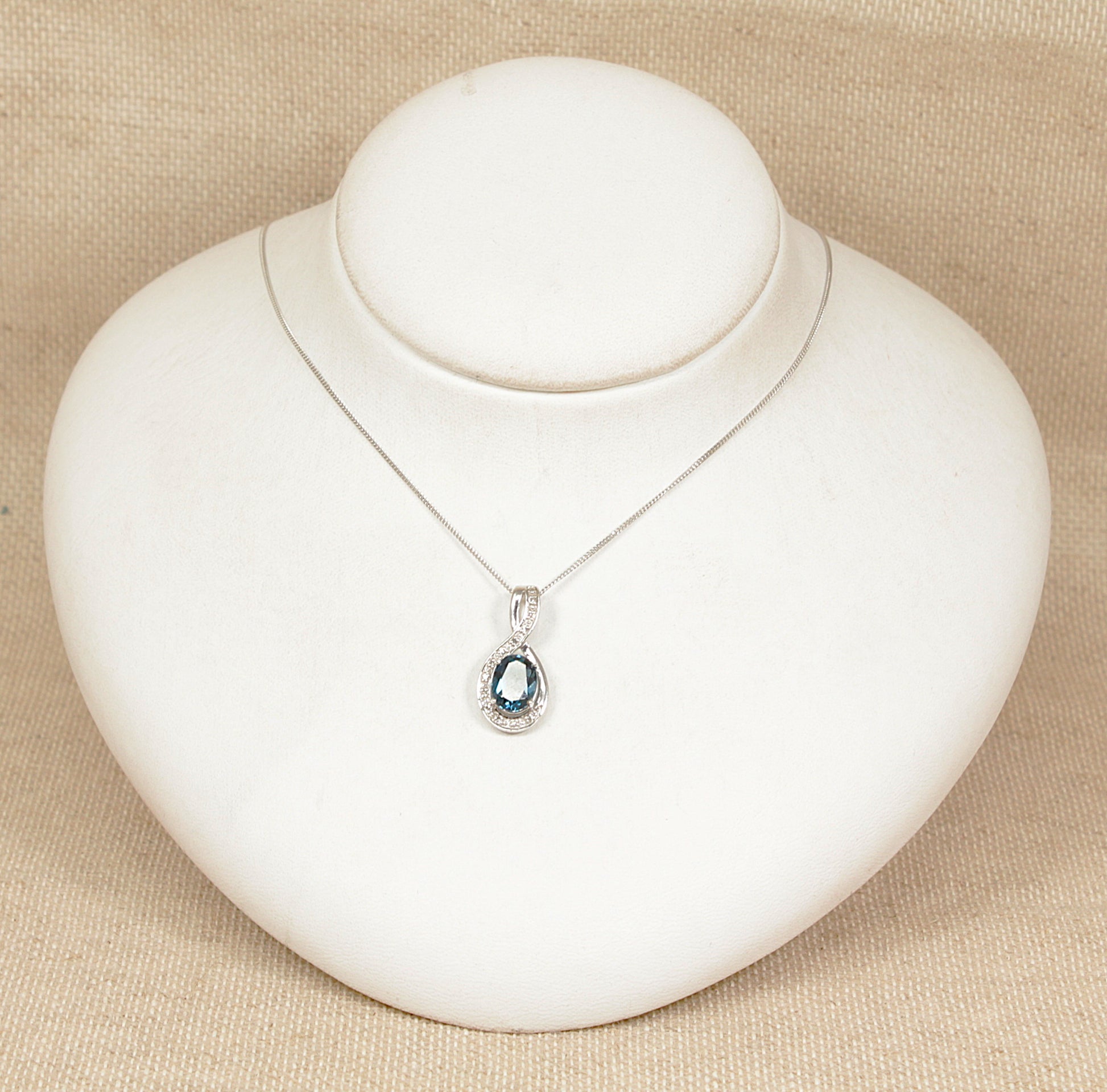 9ct White Gold Blue Topaz & Diamond Pendant & Chain Necklace