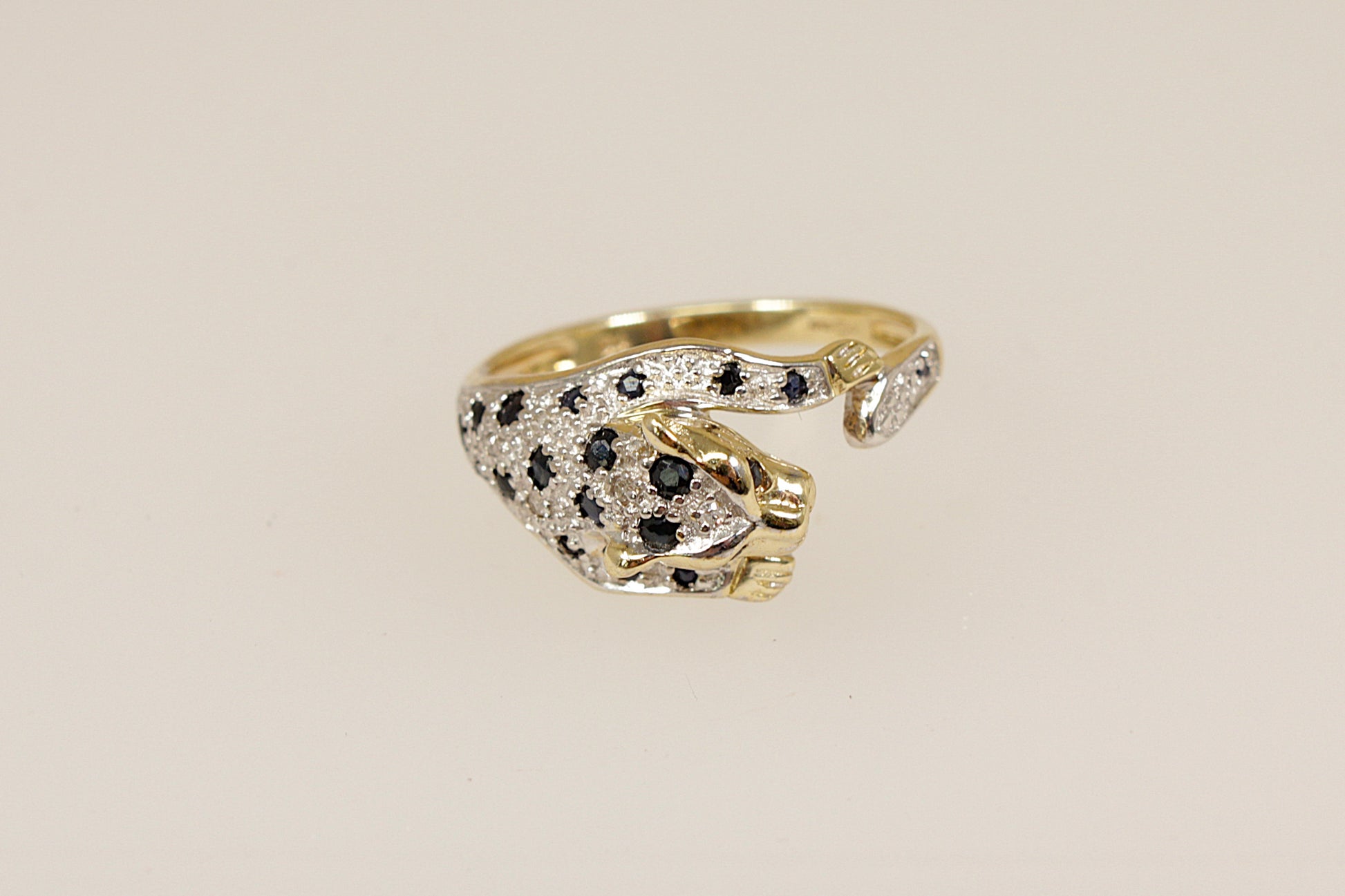 The leopard’s body and head are adorned with 17 milgrain-set Blue Sapphires, while 6 diamond accents are scattered across the design, adding subtle sparkle.