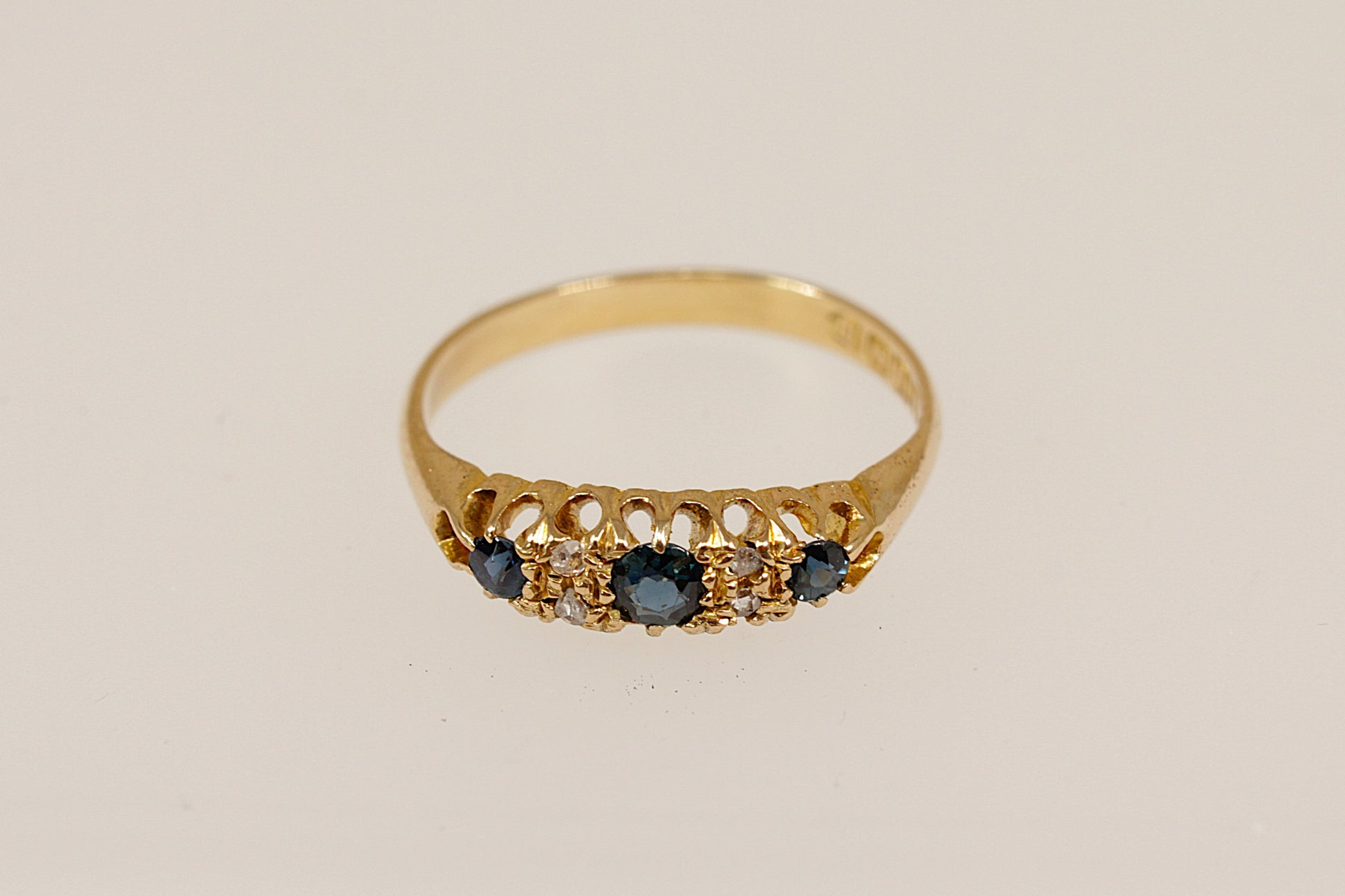 A fine and classic Antique Edwardian boat-shaped ring, beautifully crafted in 18ct yellow Gold and set with a trio of sparkling round faceted Sapphires, totalling approximately 0.15ct. The central sapphire is around 0.10ct, flanked by two outer sapphires of approx. 0.025ct each. The sapphires are of excellent quality, displaying vivid flashes of deep and light blue.