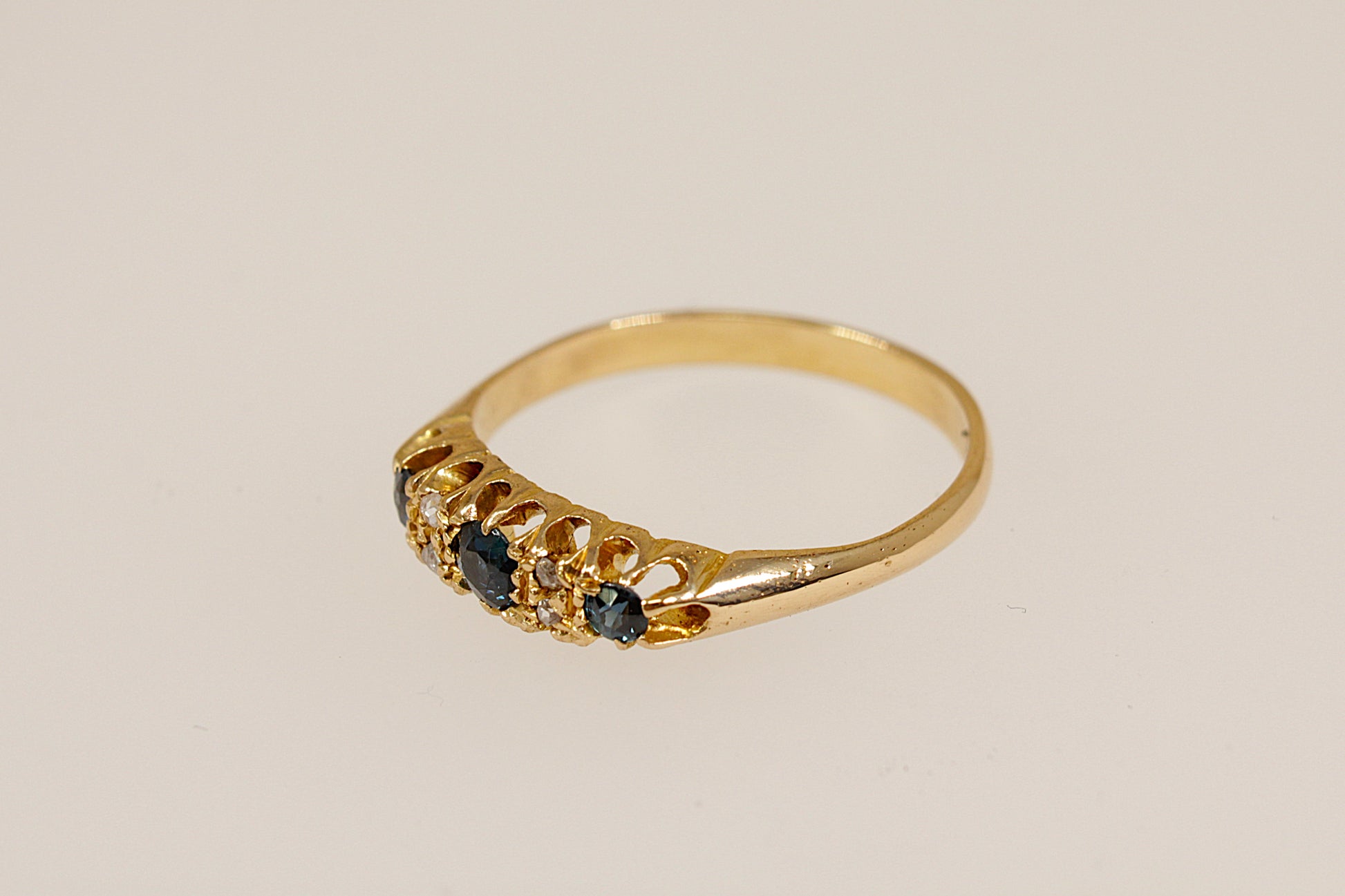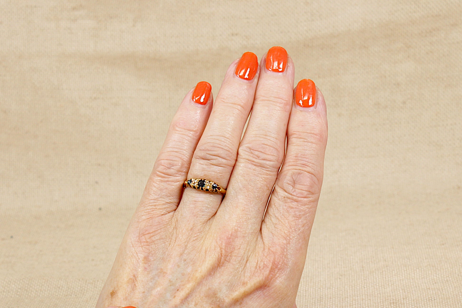 Between the sapphires sit four old-cut diamonds, adding subtle sparkle and elegance to the design. The low boat setting and smooth tapered shoulders give the ring a distinctive and timeless Edwardian charm.