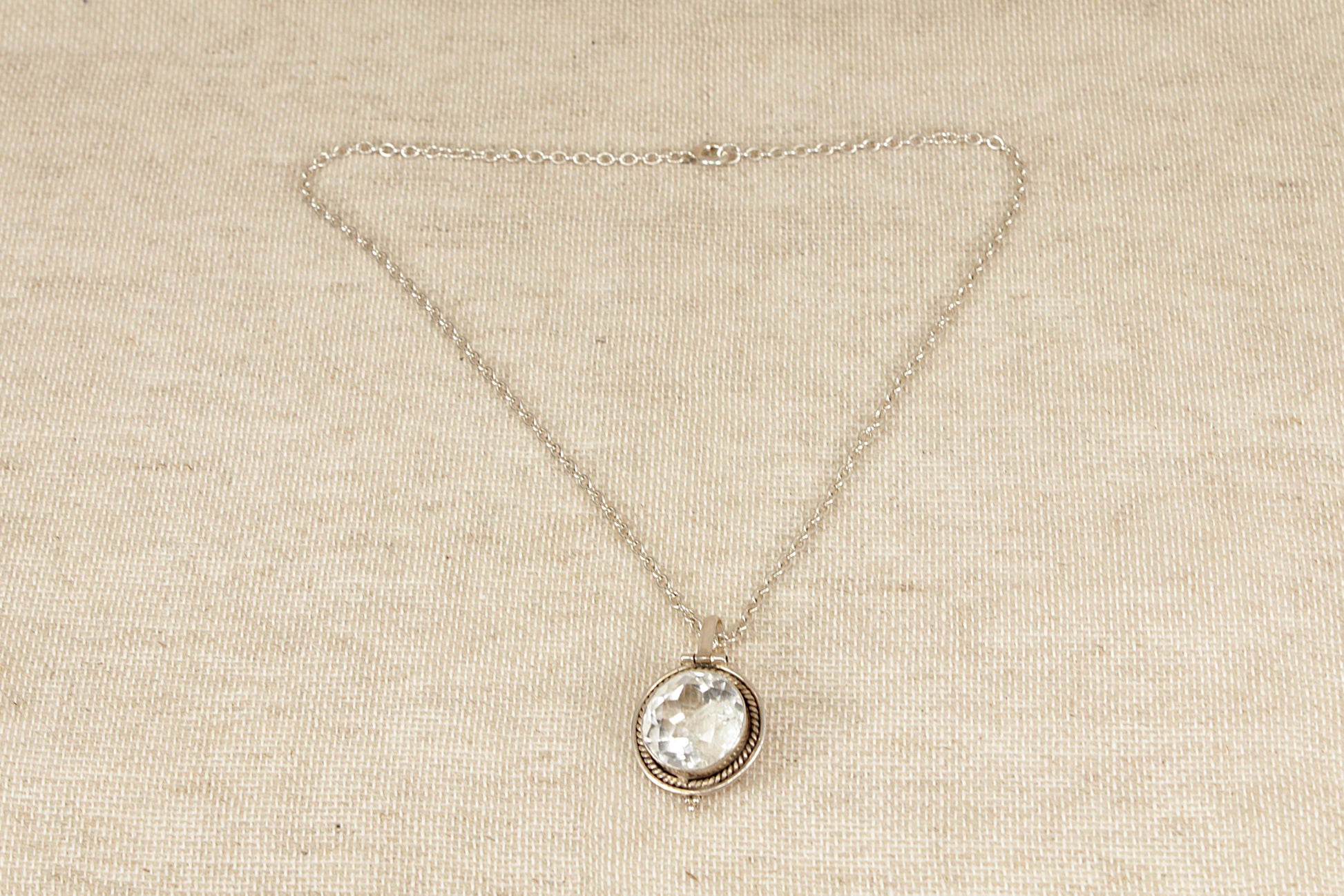The superb round faceted rock crystal, is beautifully clear and dramatically eye-catching.