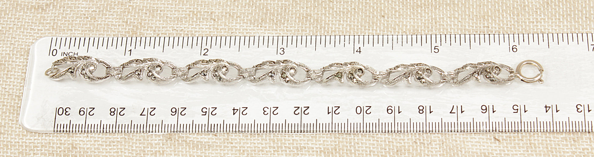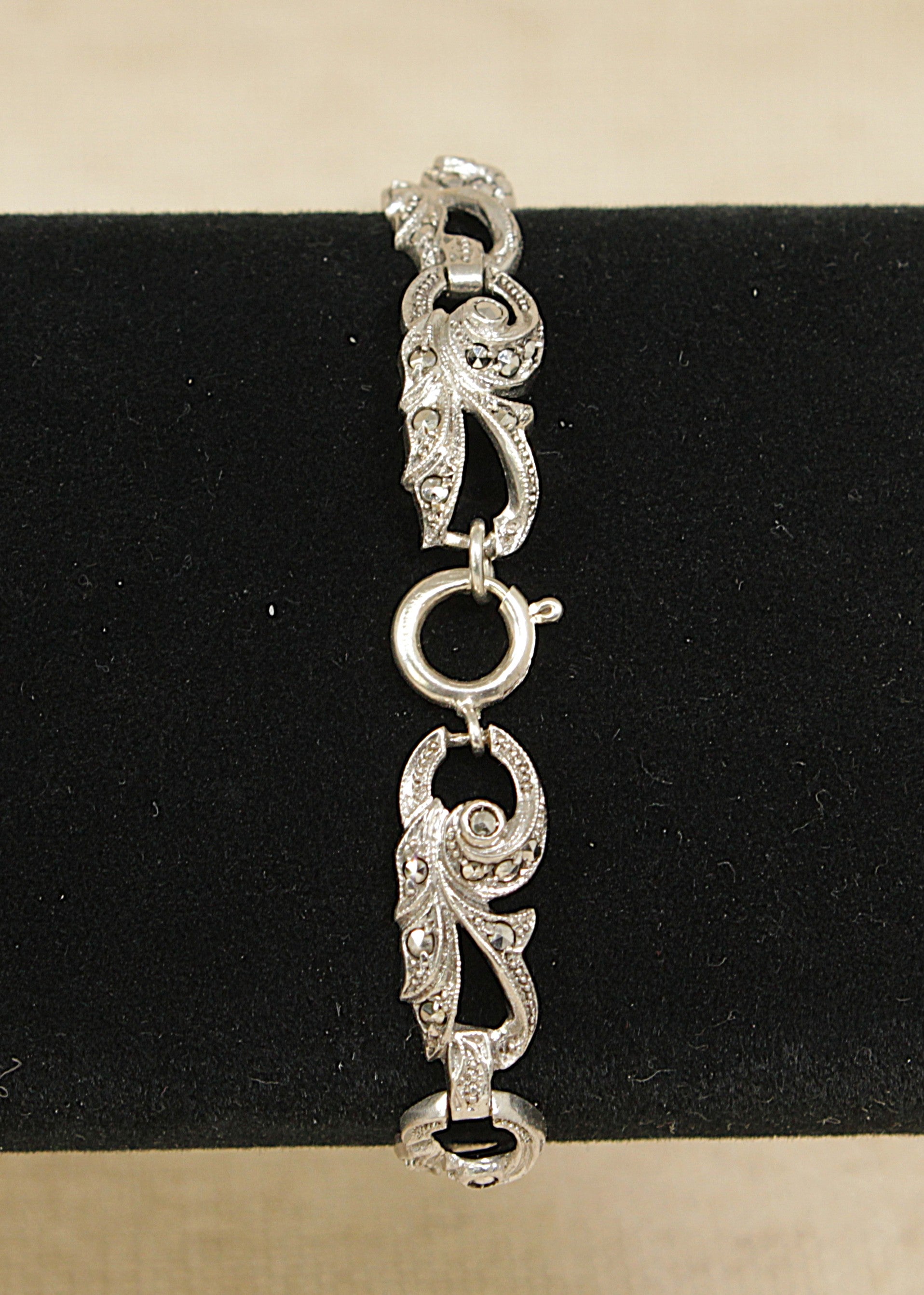Each link includes delicate cut-out detailing and is fully encrusted with sparkling marcasite. Between every large link sits a smaller rectangular connector, also set with marcasite, adding further refinement and cohesion to the design.