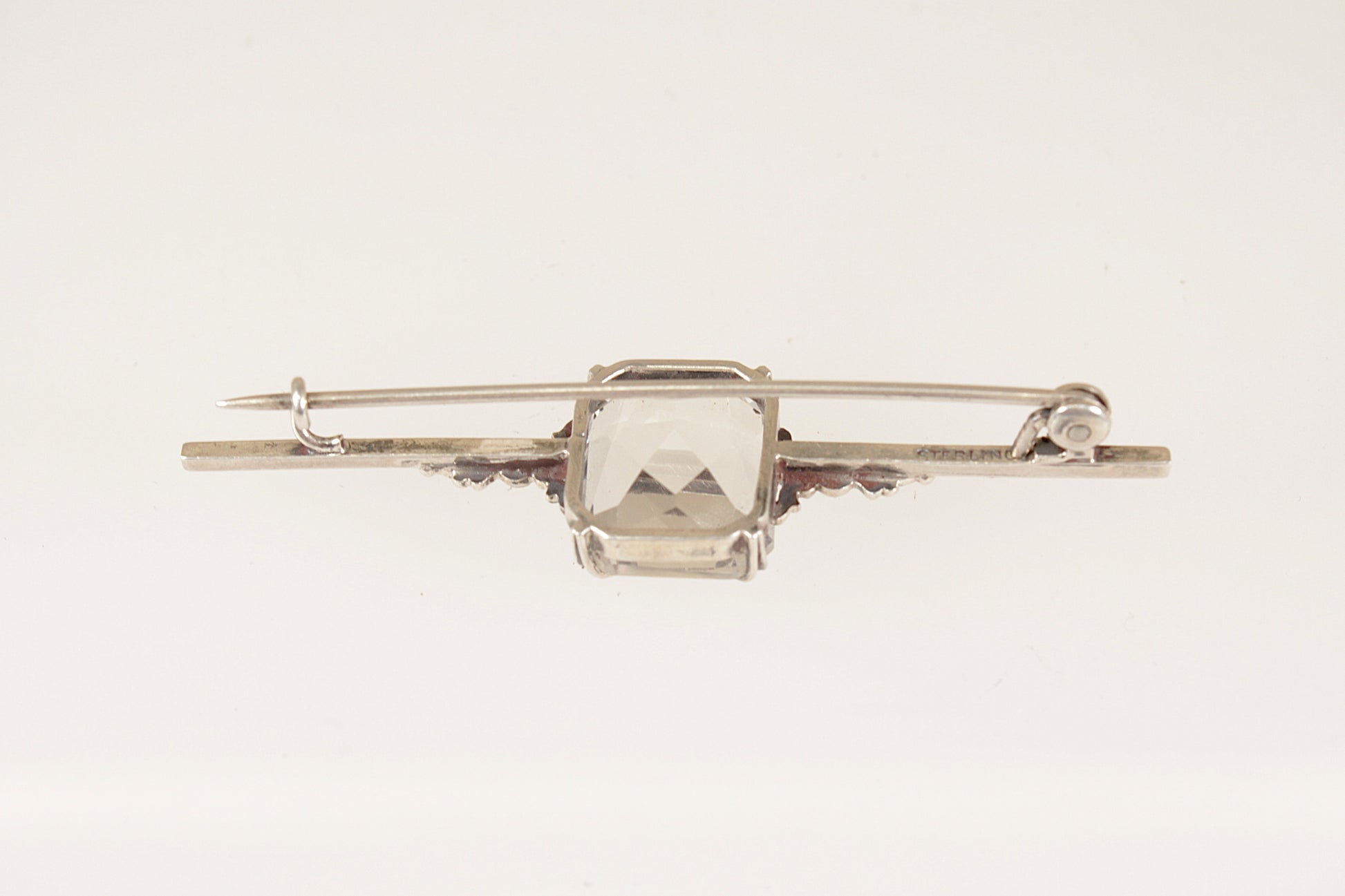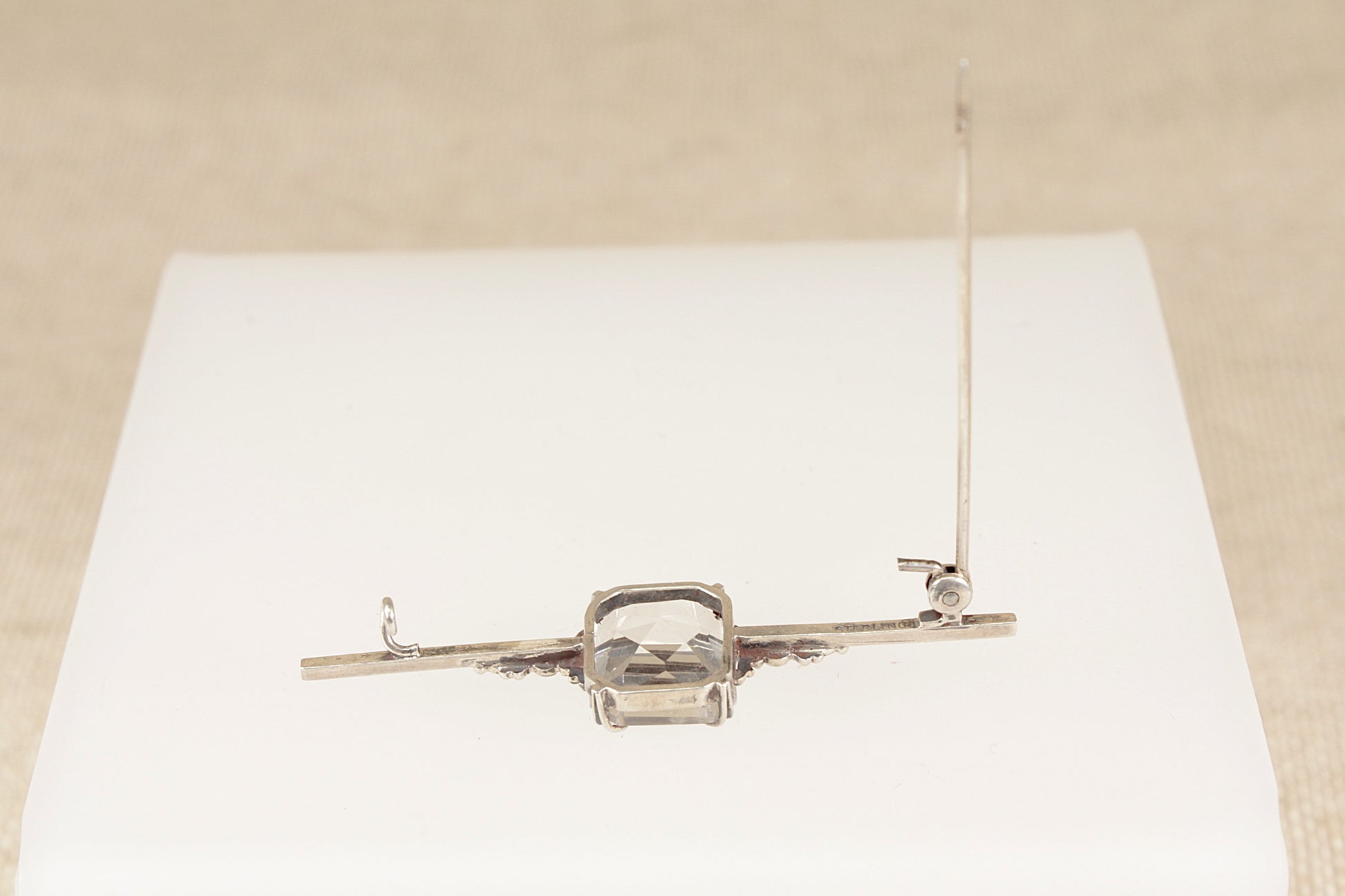 This elegant Edwardian Silver bar brooch features a striking emerald-cut Rock Crystal, beautifully clear and full of light.