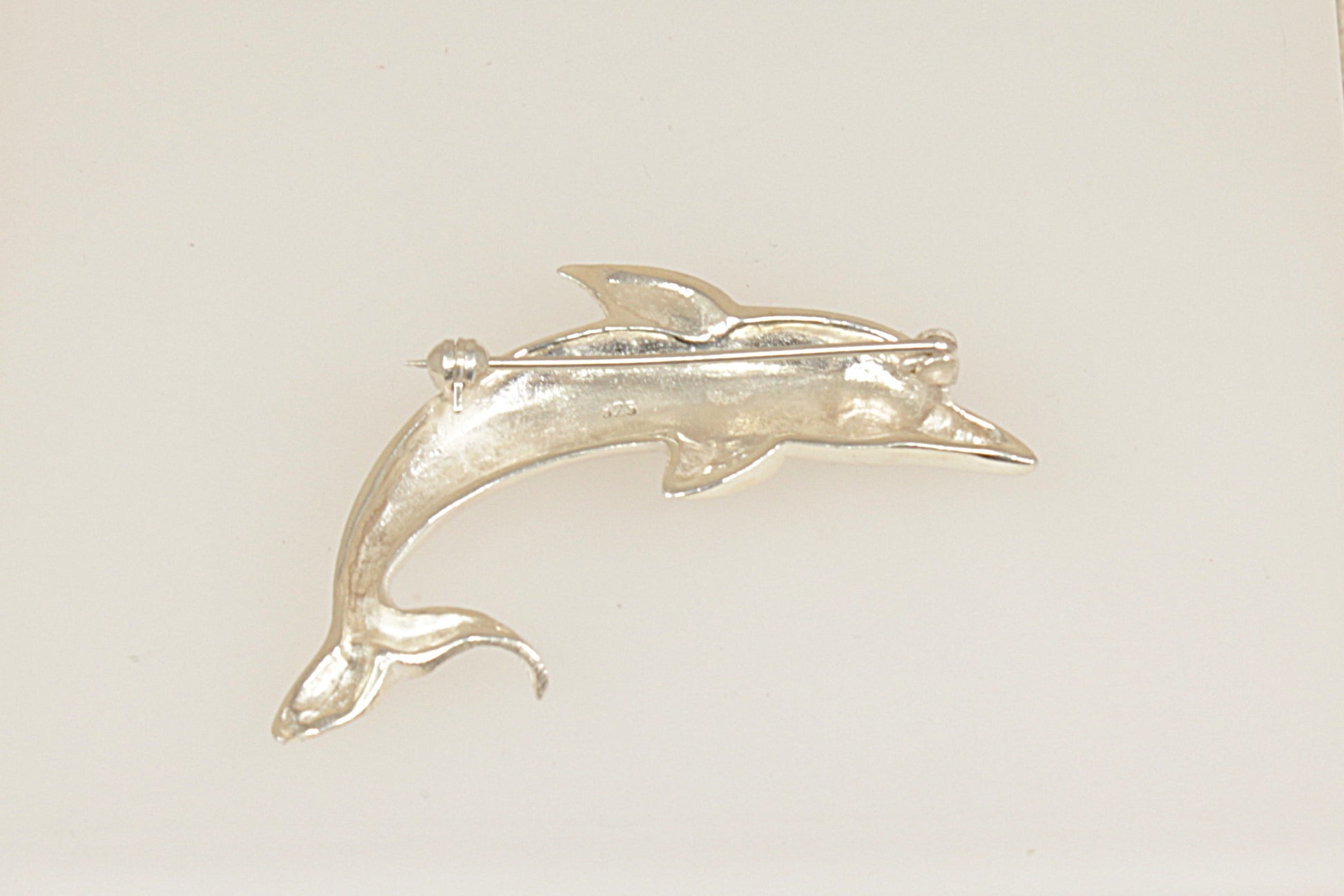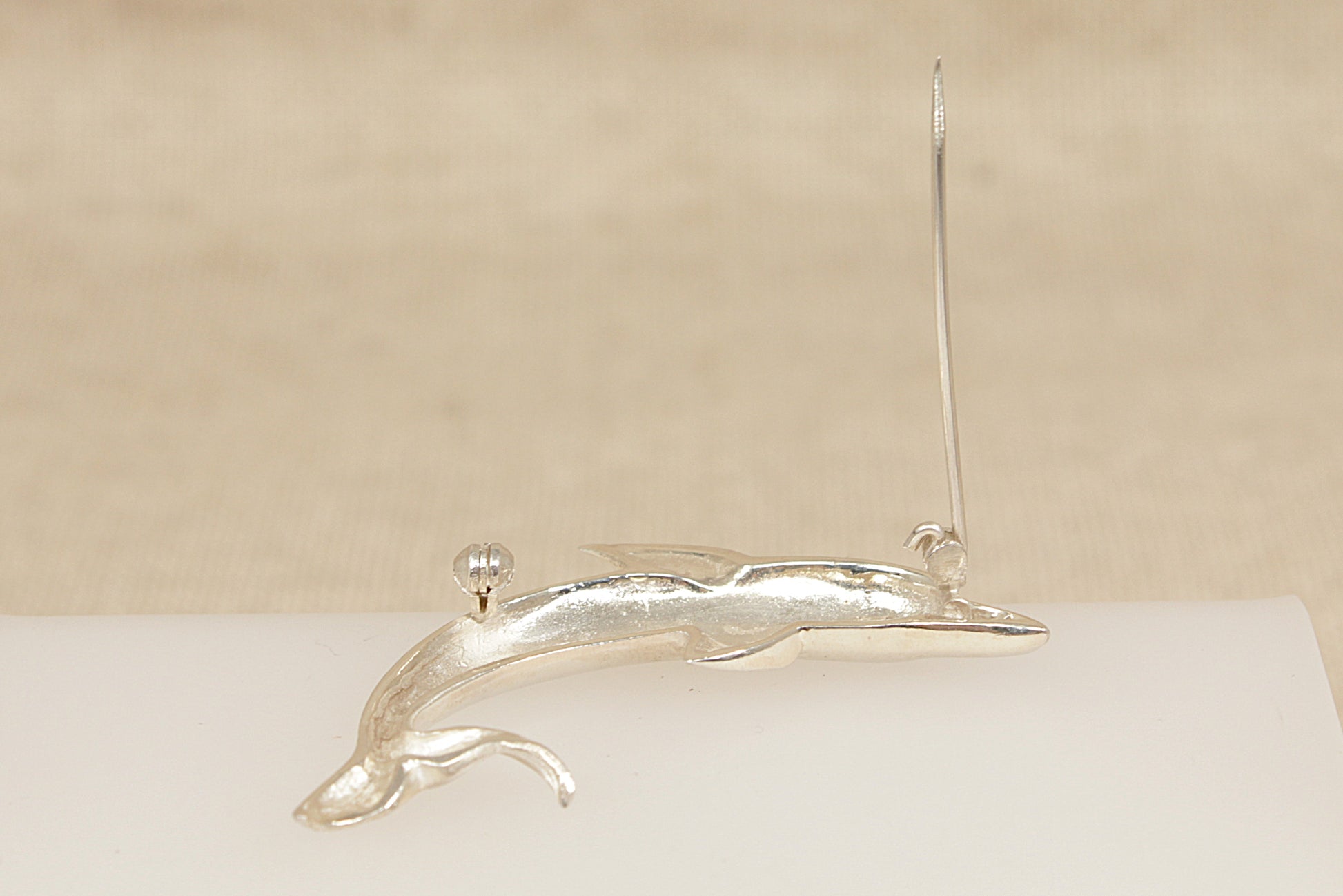 This impressive and substantial Sterling Silver brooch features a beautifully crafted dolphin with finely detailed fins and tail, giving the piece a sense of movement and elegance.