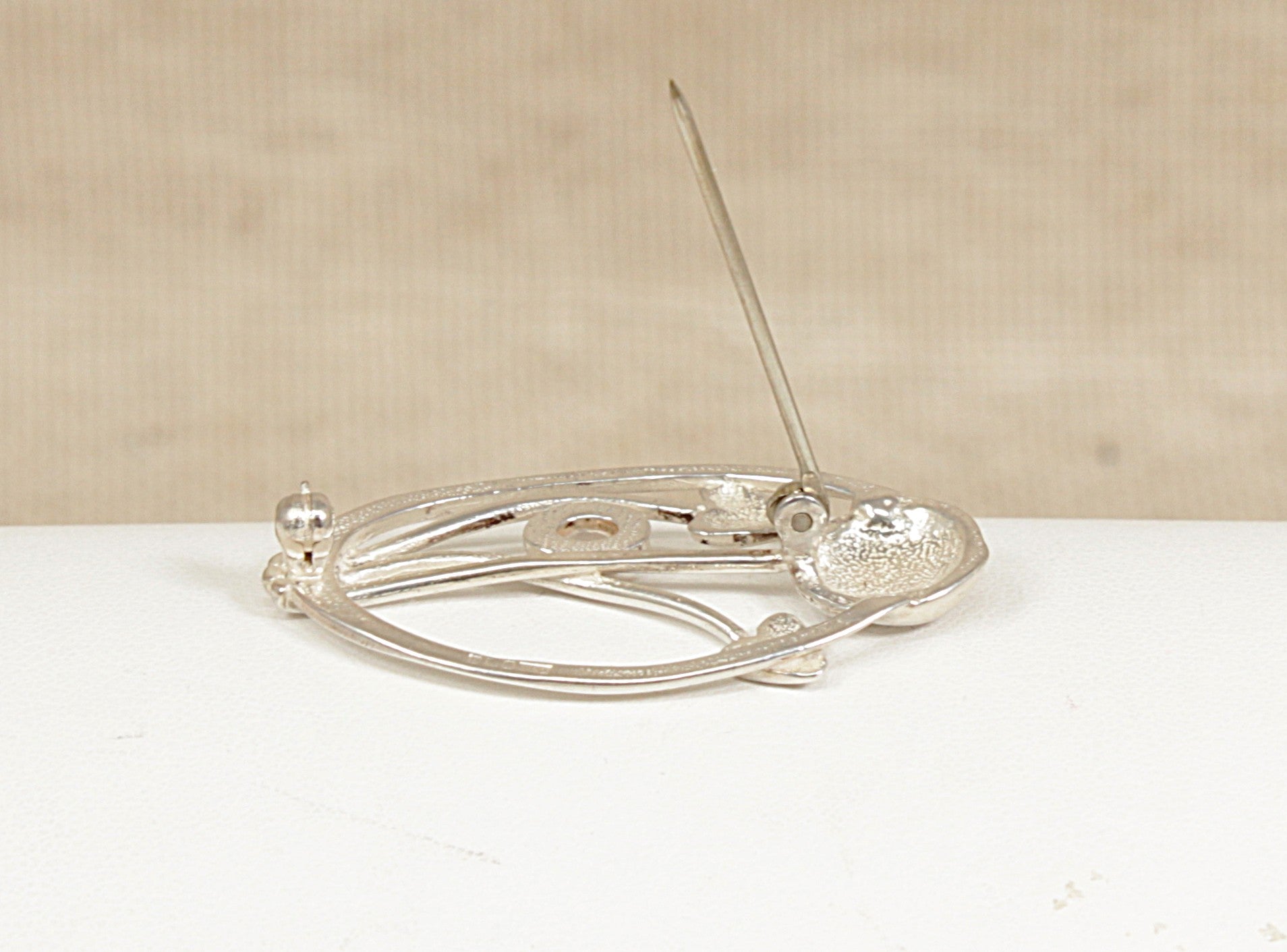 This elegant Silver Art Nouveau style brooch is crafted in the Charles Rennie Mackintosh design, featuring graceful vine and rose silverwork surrounding an oval, bezel-set moonstone, delicately off-set for balance and charm.