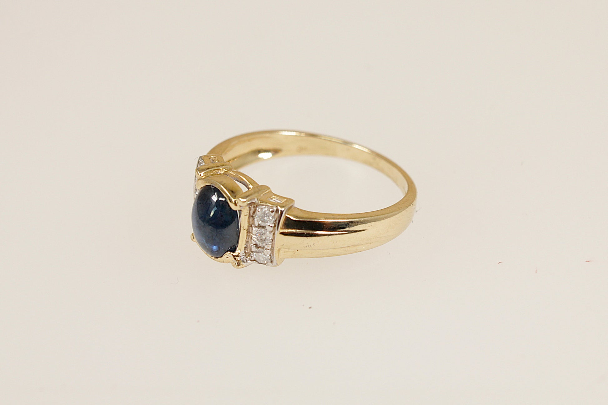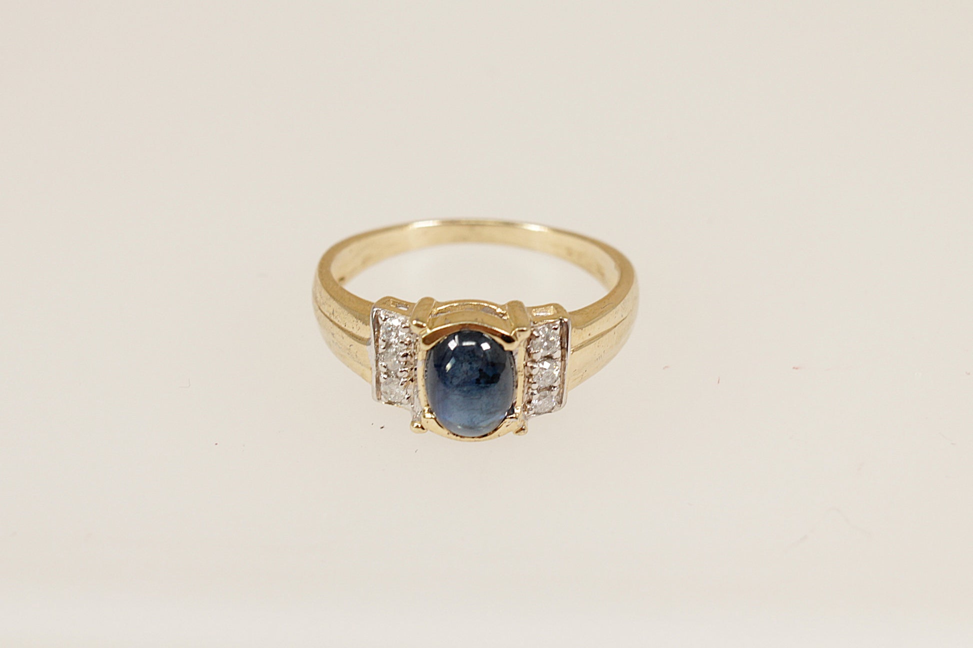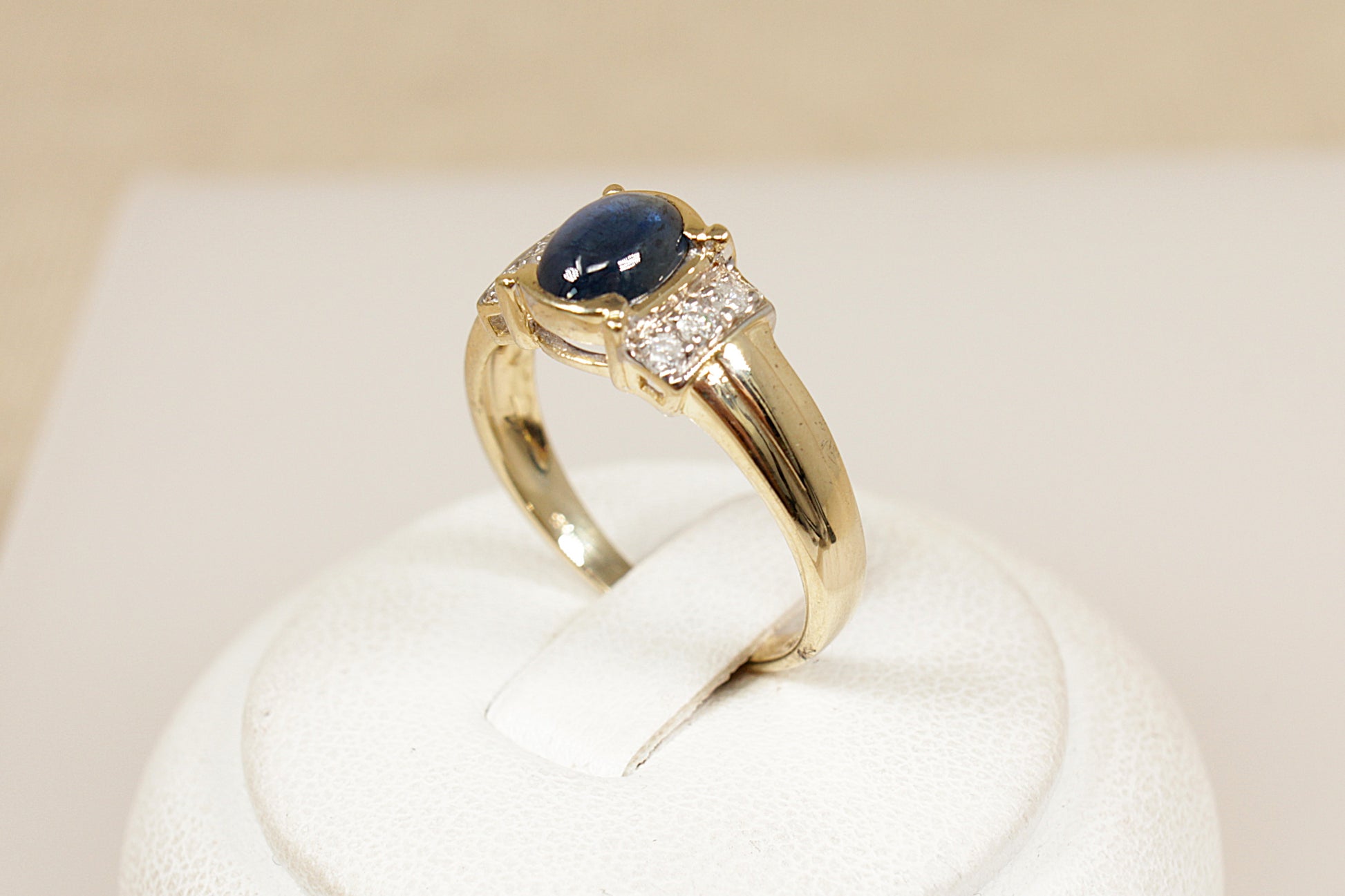 A beautiful 9ct Gold Sapphire and Diamond ring, featuring a stunning oval cabochon-cut cornflower Blue Sapphire.