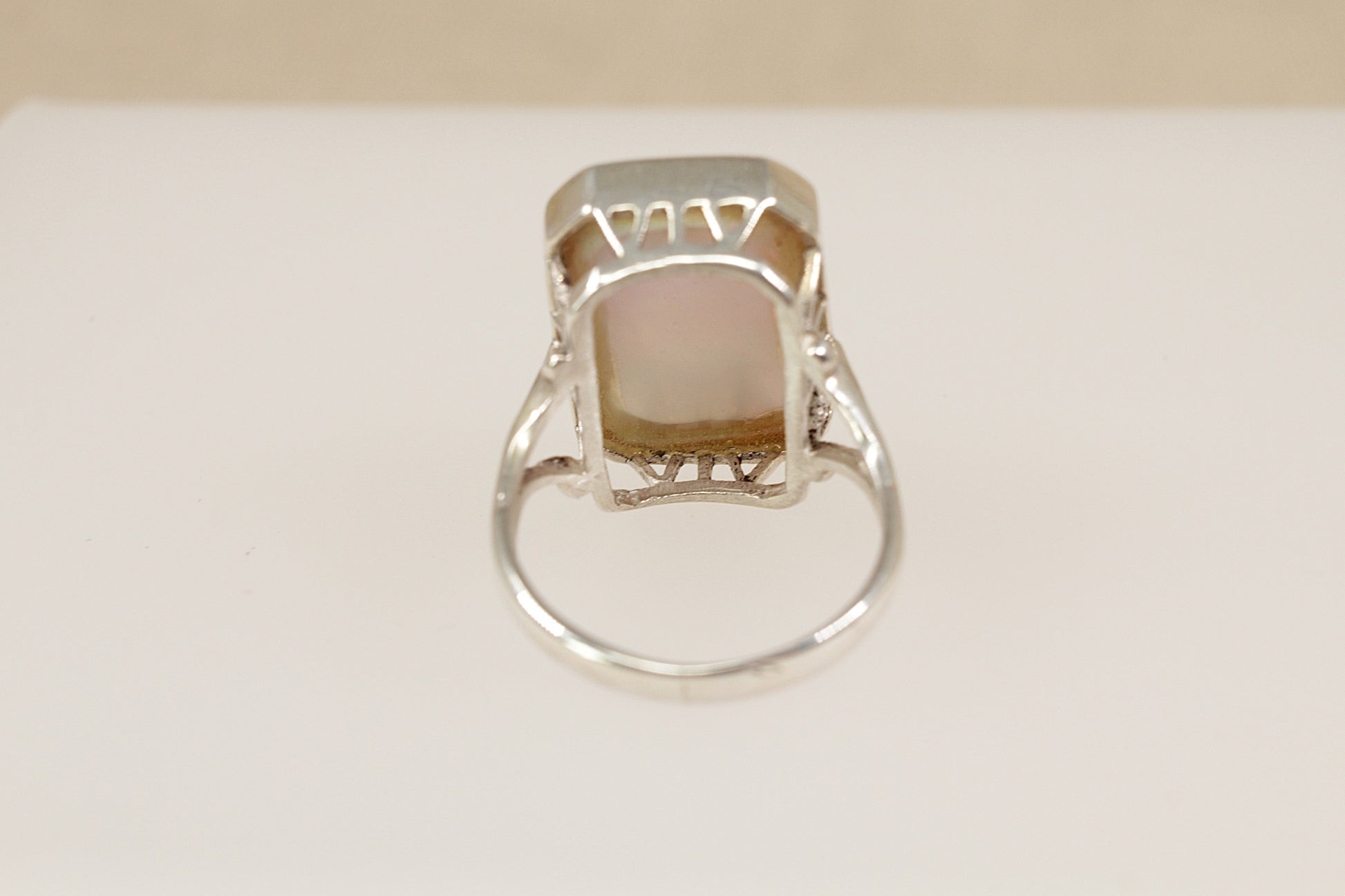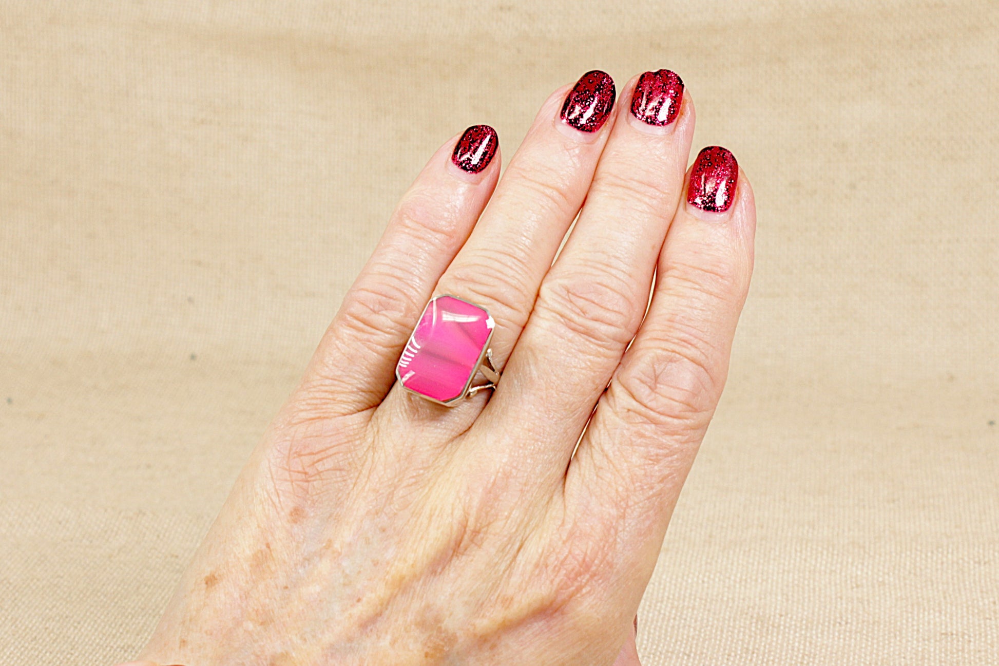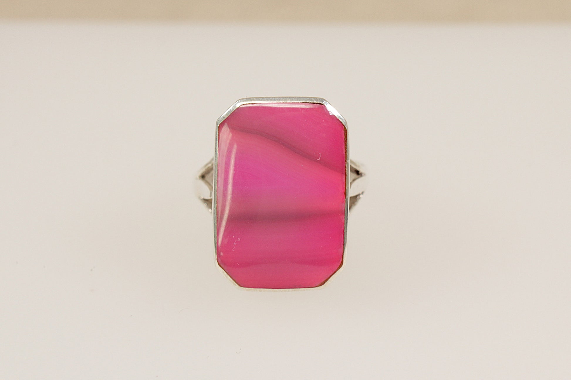 A bold and eye-catching sterling Silver statement ring featuring a large rectangular pink banded agate, bezel set within a finely crafted raised basket mount. The smooth cabochon surface and soft pink tones of the agate create a striking contrast with the polished silver setting, giving the ring both presence and elegance.
