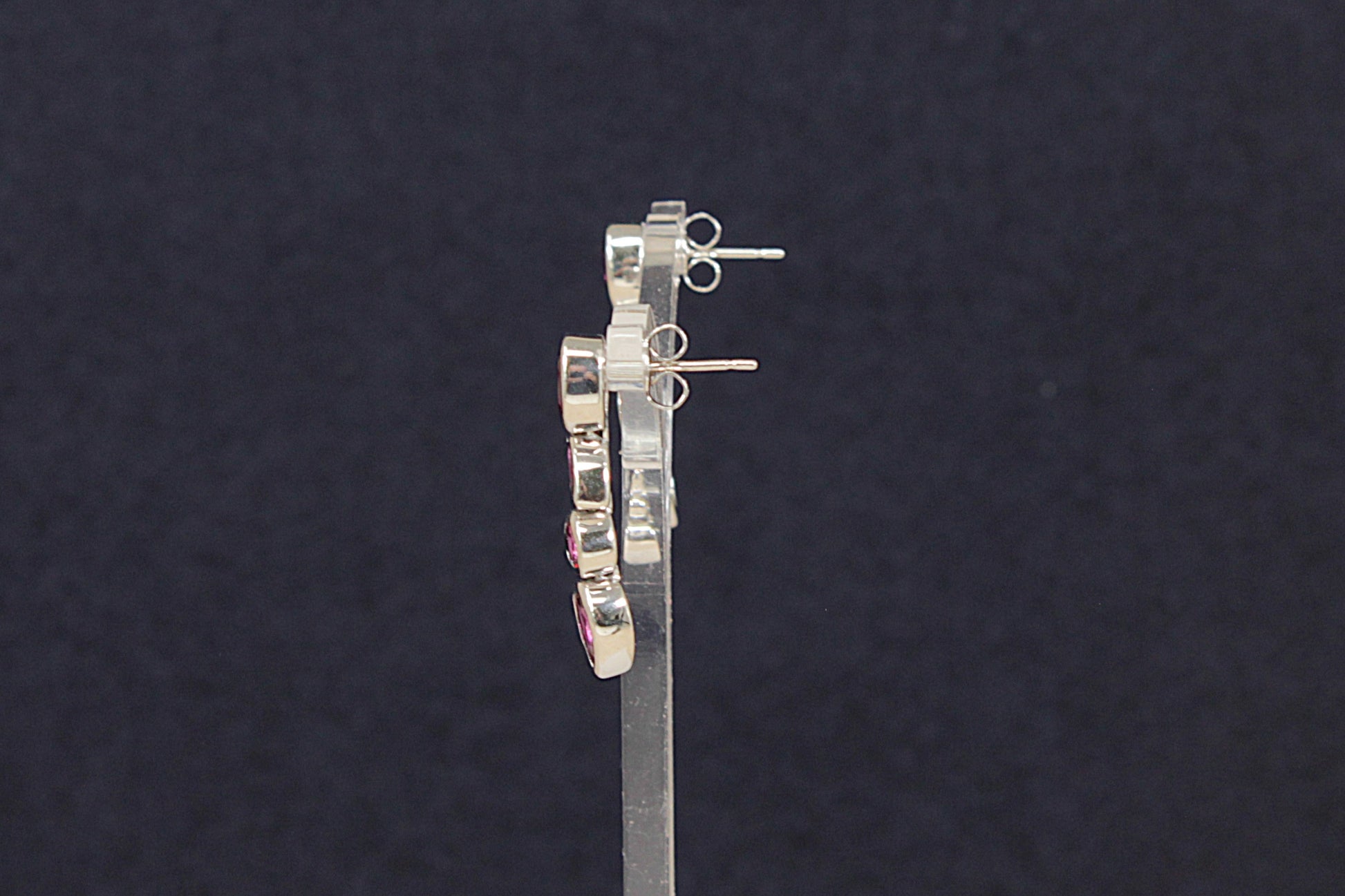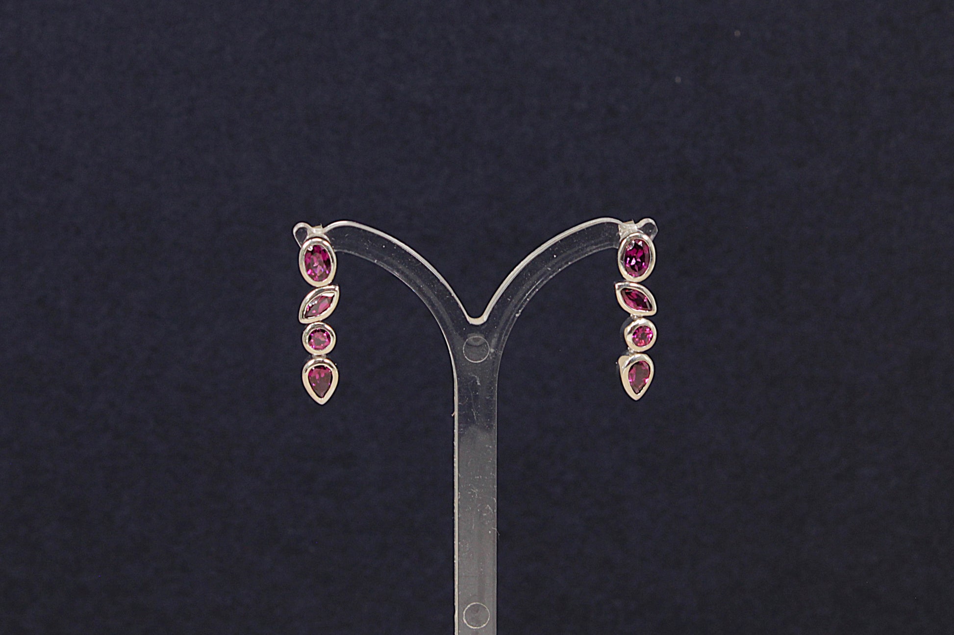 A beautiful pair of Sterling Silver drop earrings, each set with four bezel-set Amethysts in a variety of elegant cuts. The stones are articulated, allowing gentle movement and sparkle as they catch the light, and dangle a graceful 1 inch below the ear.