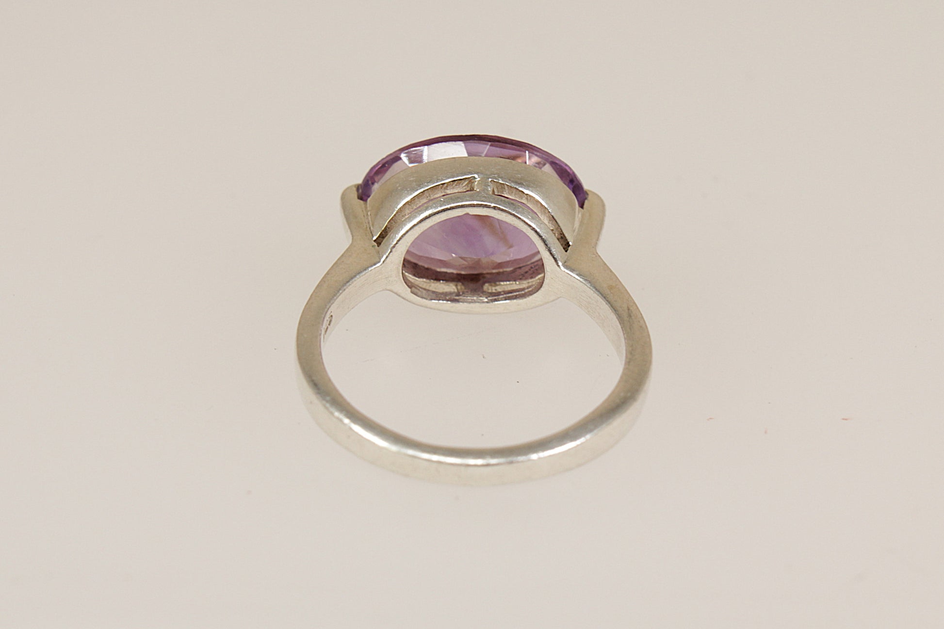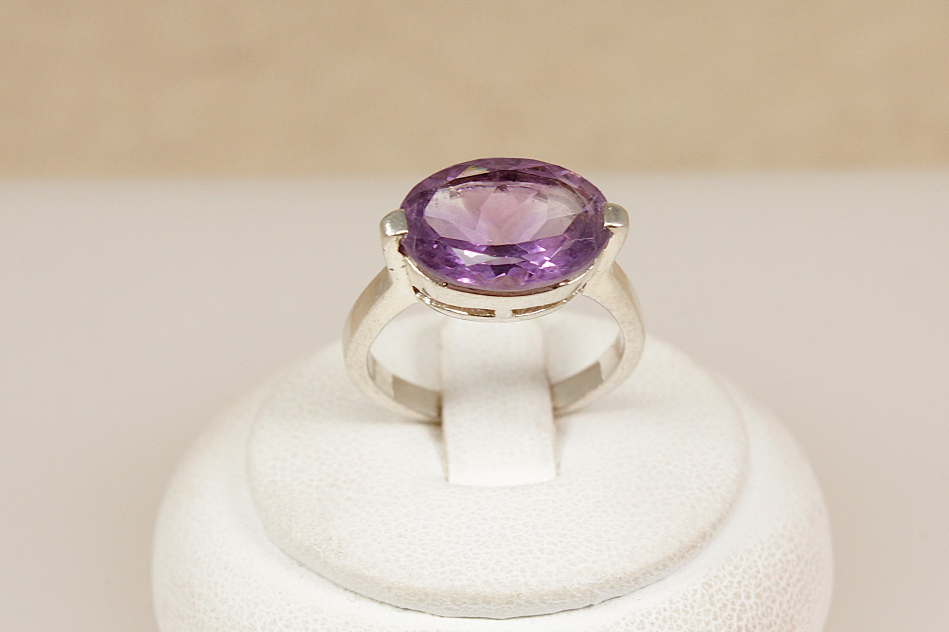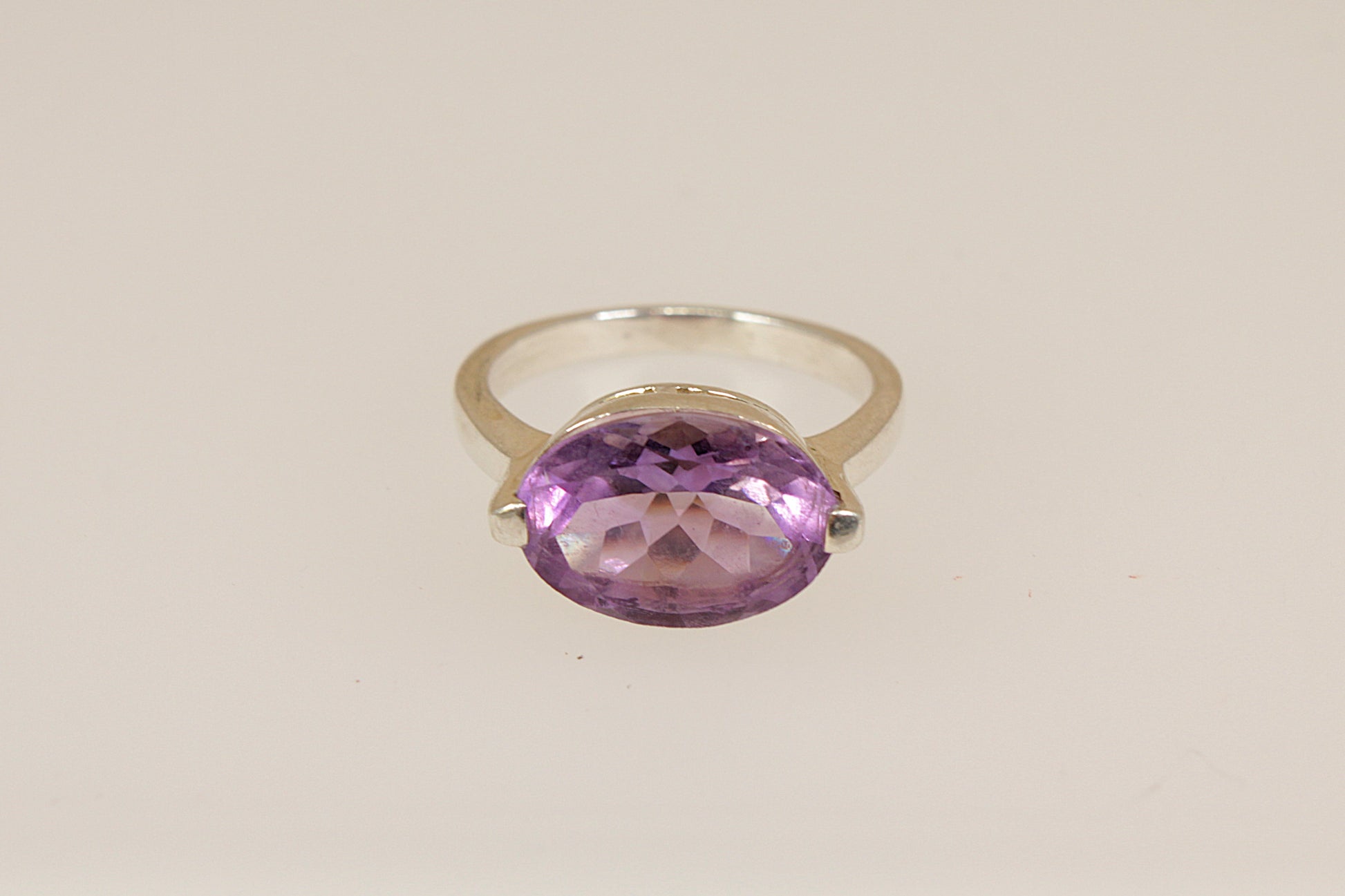 This striking Sterling Silver ring features a large oval faceted Amethyst, showcased in a bold statement solitaire design.