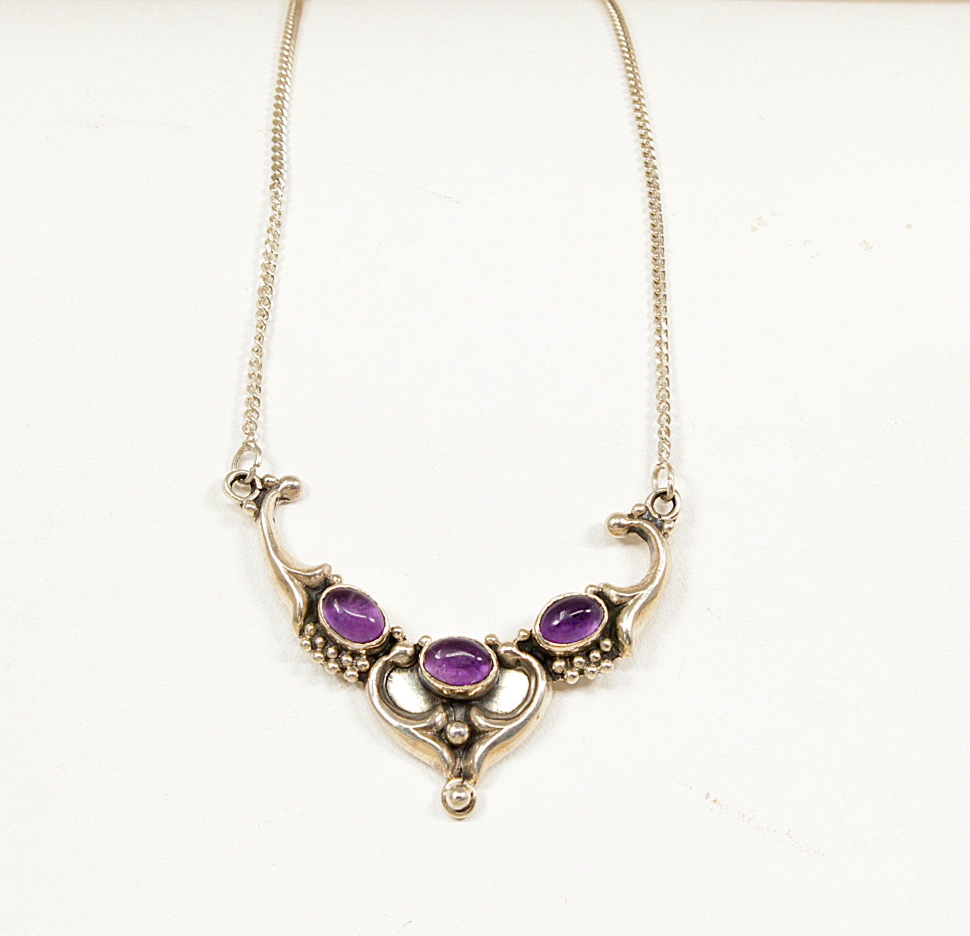This gorgeous Silver Art Nouveau style necklace features three bezel-set cabochon Amethysts, elegantly arranged among intricate silverwork of grapes, leaves, and curling vines. The design forms a graceful crescent shape, capturing the organic flow and romantic essence of the Art Nouveau era.