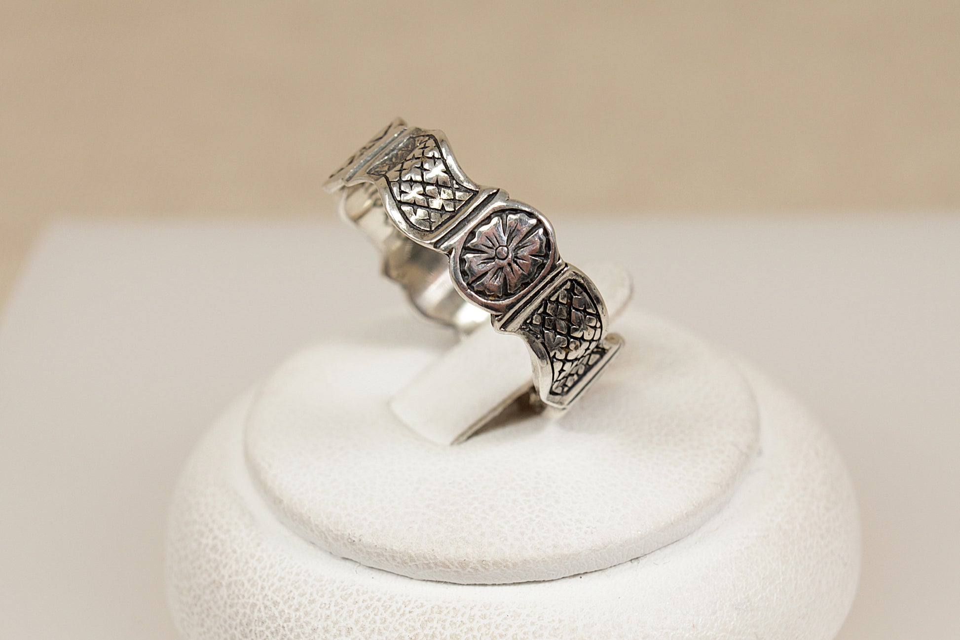 This charming vintage Silver Posy ring features a beautifully wavy band design, intricately engraved with delicate scrolling patterns and alternating oval and rectangular motifs that encircle the entire ring. The craftsmanship captures a timeless sense of romance and artistry.