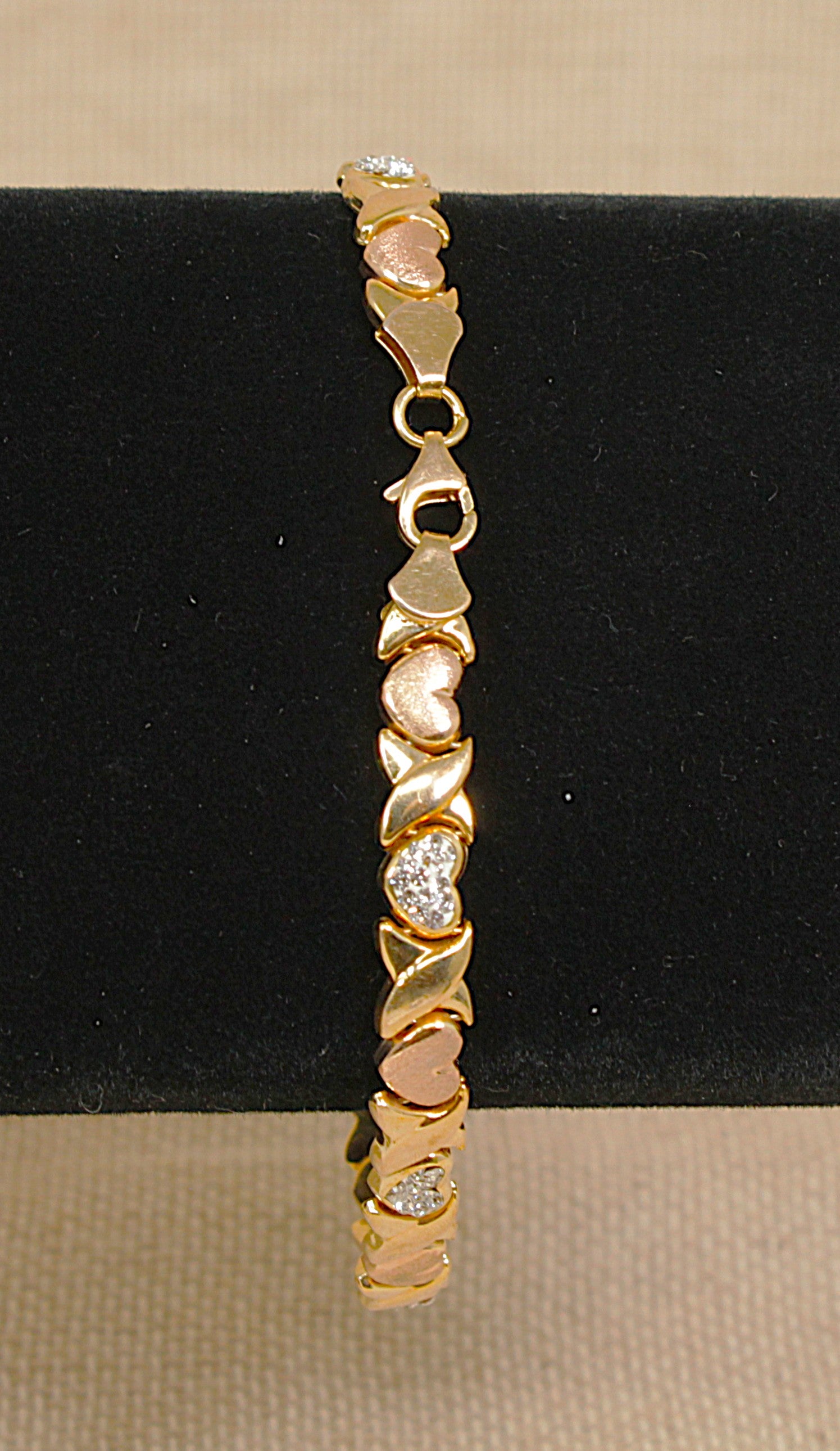 This pretty Silver Gilt heart design bracelet is both elegant and romantic, featuring an alternating pattern of a sparkling crystal hearts, a smooth polished hearts, all finished in varied tones of gilt coating for a warm, luxurious look.