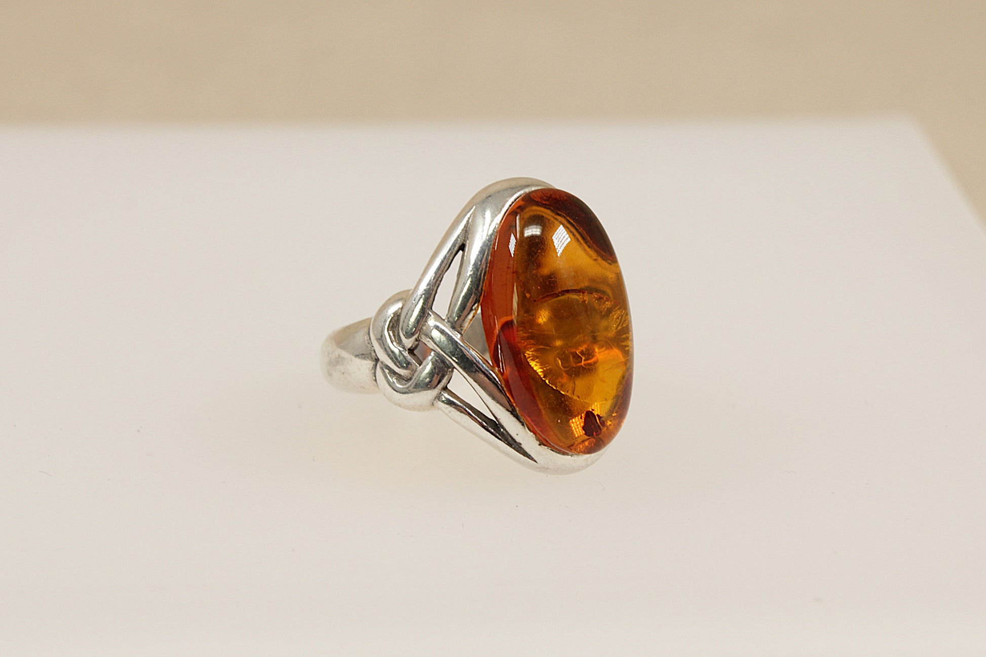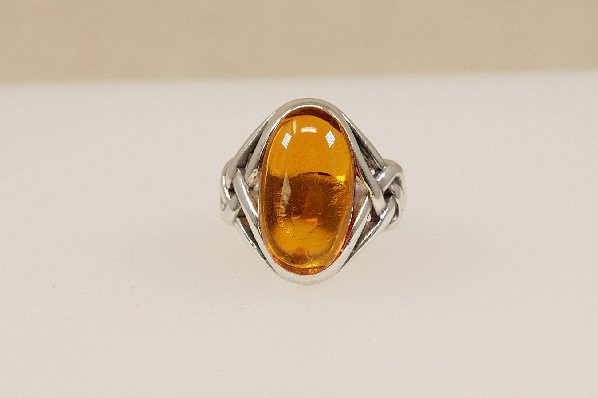 A bold Silver Celtic designer statement ring featuring a large oval cabochon Amber stone. The amber is bezel set, showcasing its rich, warm tones and natural inclusions.