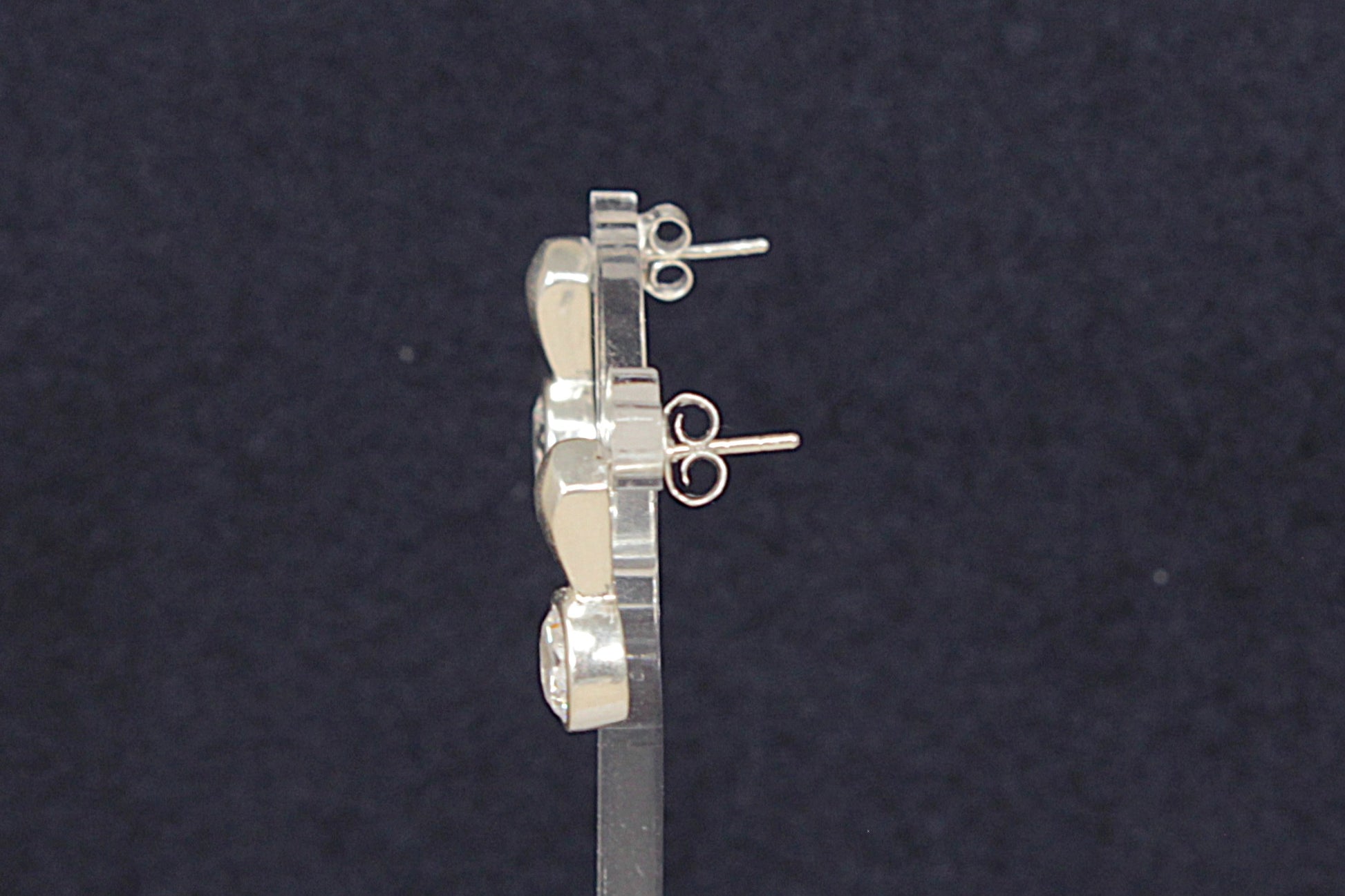 A bold and eye-catching pair of Silver and Crystal stud earrings, featuring a chunky petal-shaped silver design that leads to a large, round, sparkly faceted bezel-set crystal. These elegant studs and catch the light beautifully, they are stamped 925 for sterling silver.