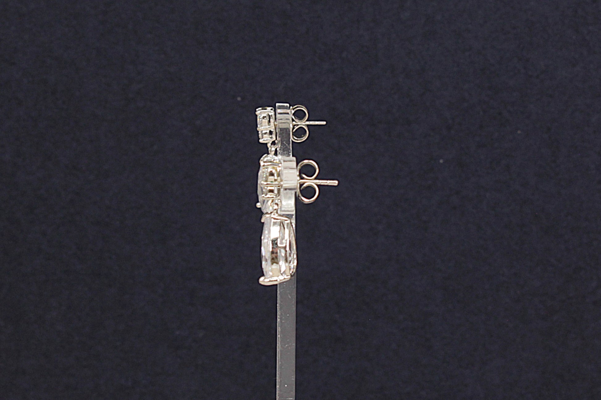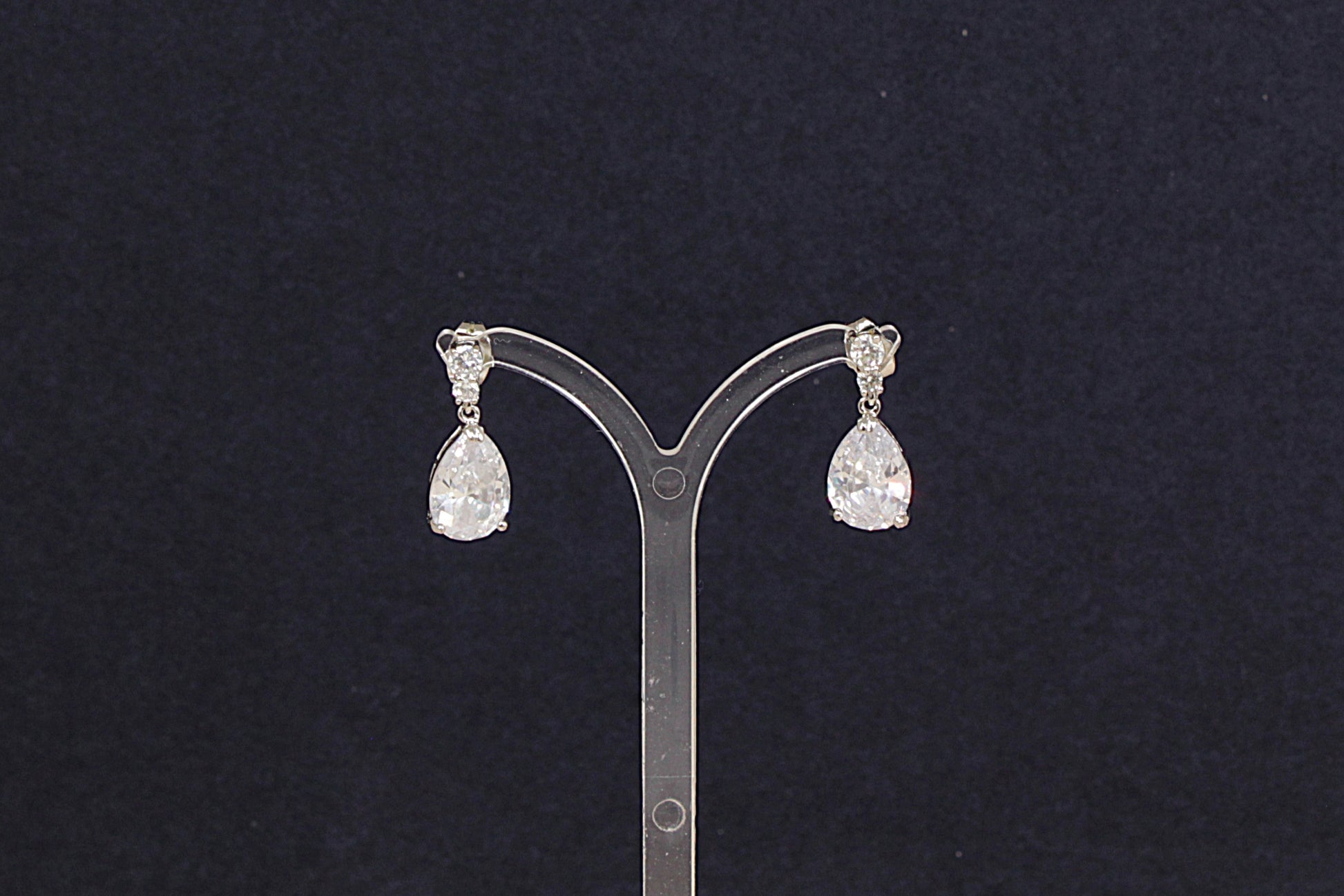 Silver Crystal Drop Earrings these dazzling blingy Silver drop earrings feature a large pear-shaped faceted Crystal that mimics a real diamond and catches the light beautifully, creating a brilliant sparkle with every movement. The main crystal articulates elegantly from two graduated round crystals, adding extra shimmer and sophistication. Designed with a secure stud fastening for comfort and style, these earrings are stamped 925 for sterling silver, making them the perfect choice for special occasions or adding glamour to any outfit.