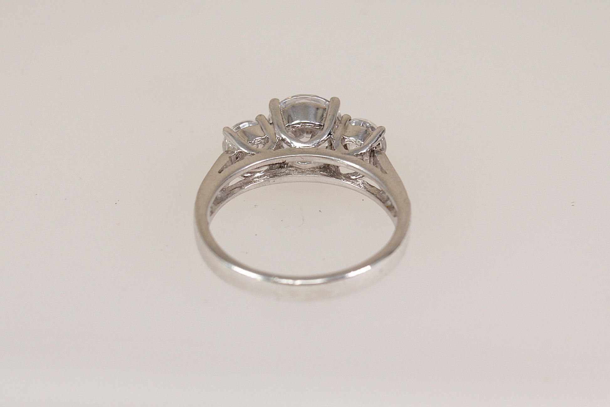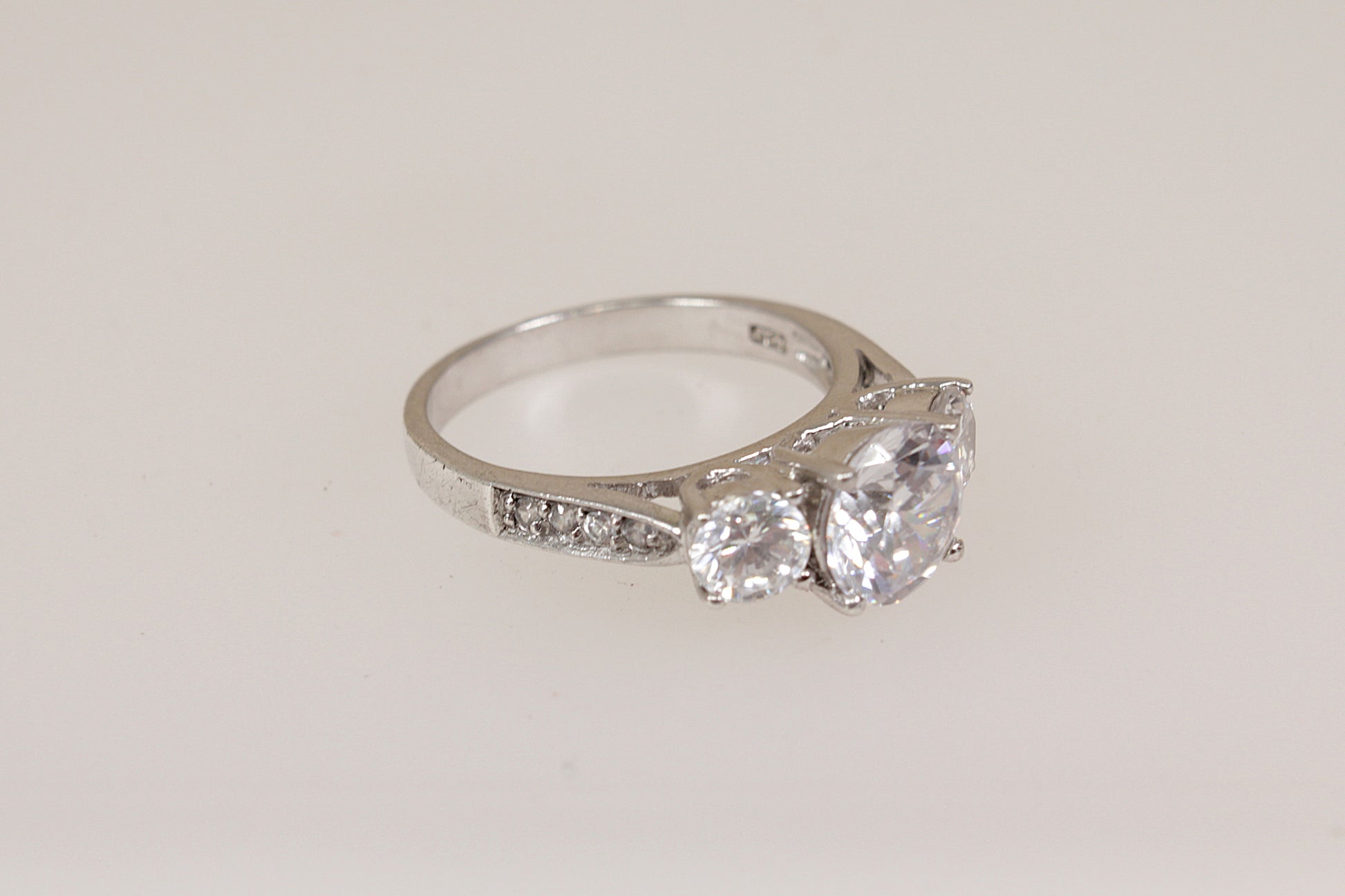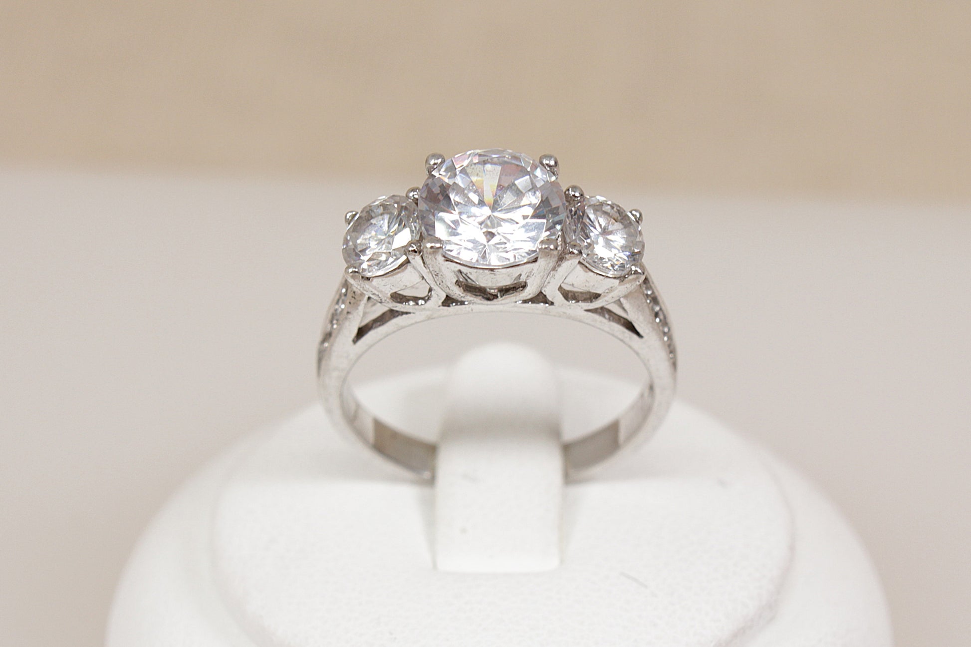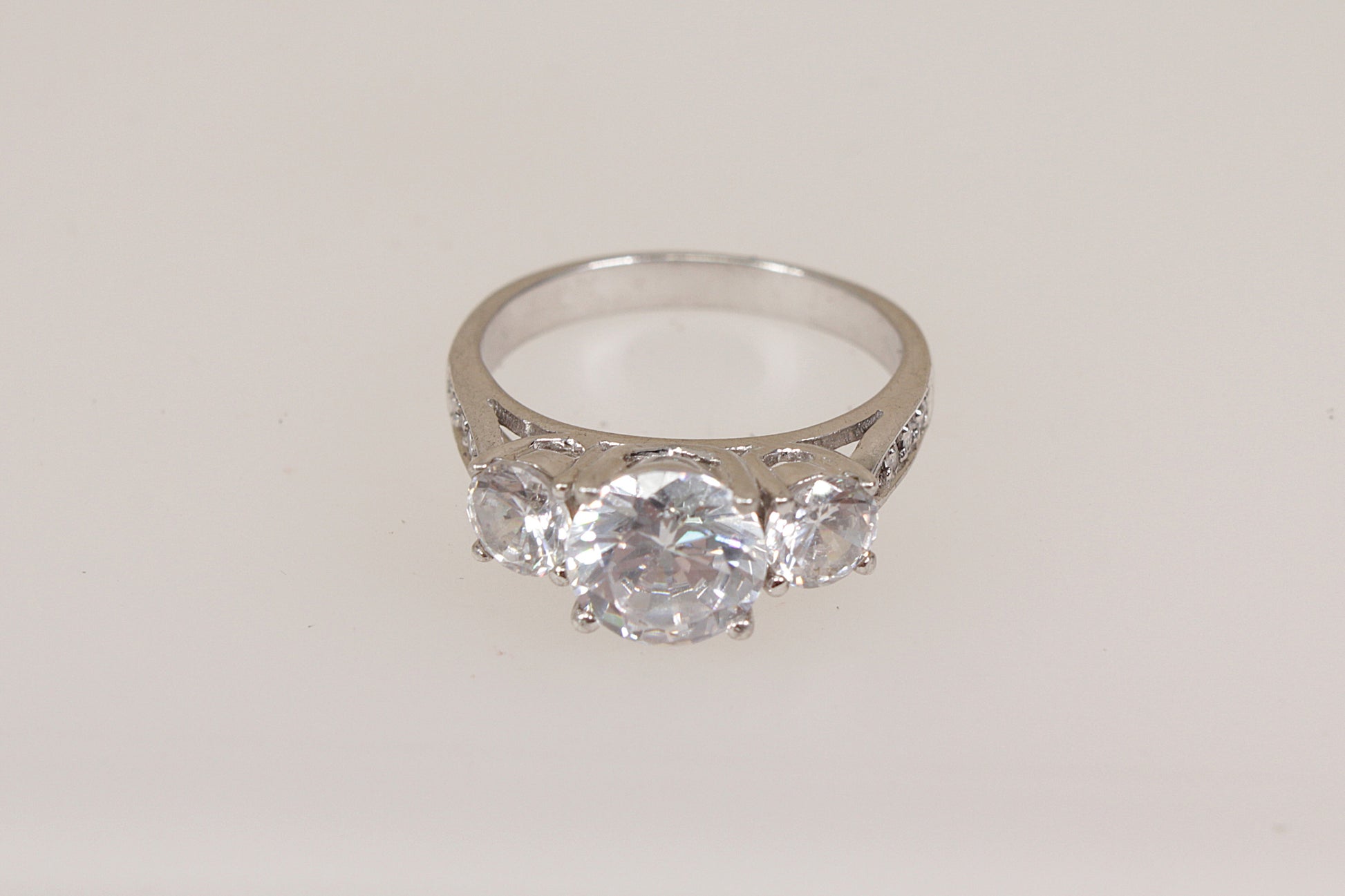 The ring features three round brilliant-cut cubic zirconia gemstones, all claw set, with the central stone slightly larger than the two on either side, creating a classic and elegant trilogy design, (if these CZ gemstones were real diamonds it would be a least a 3 carat ring).