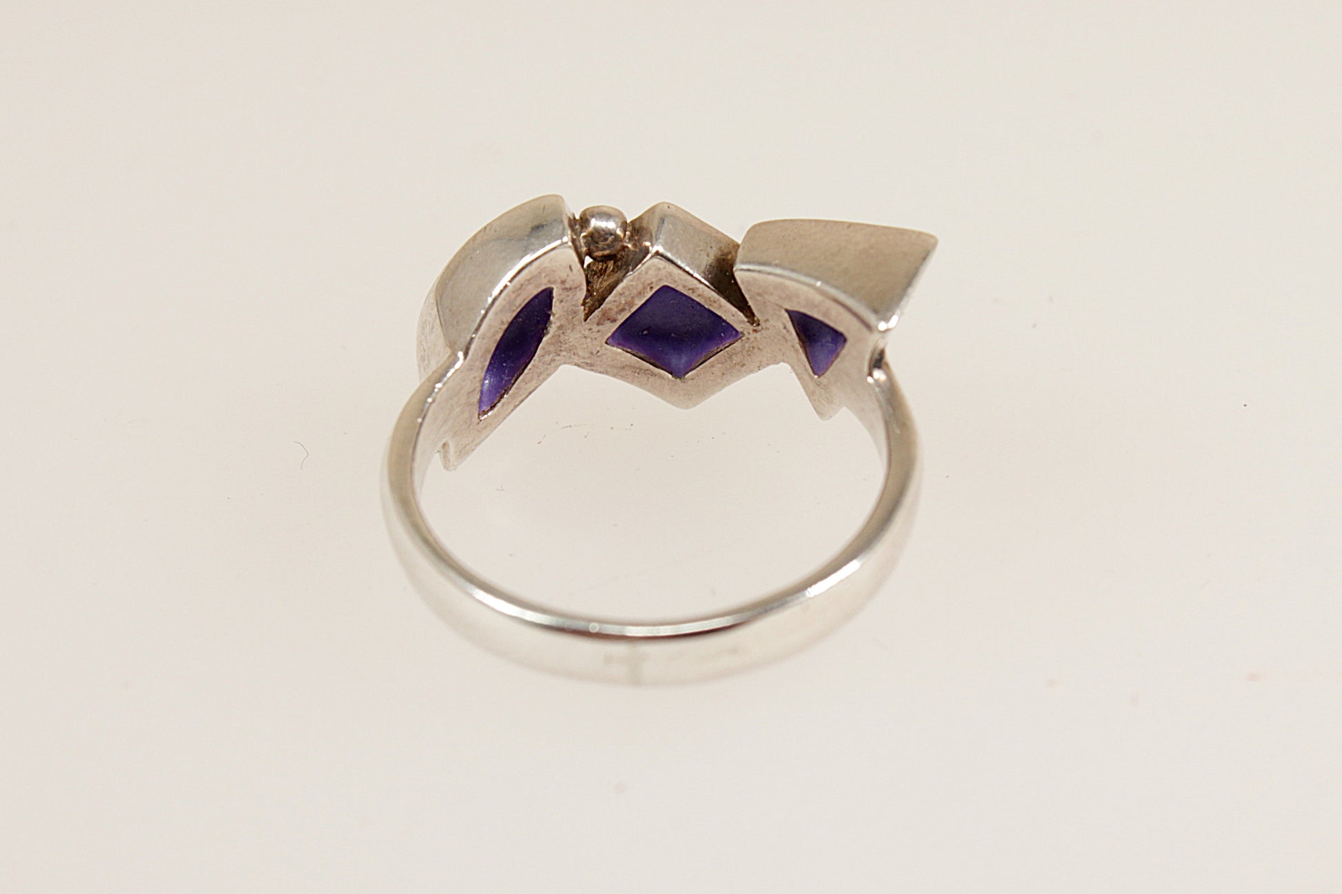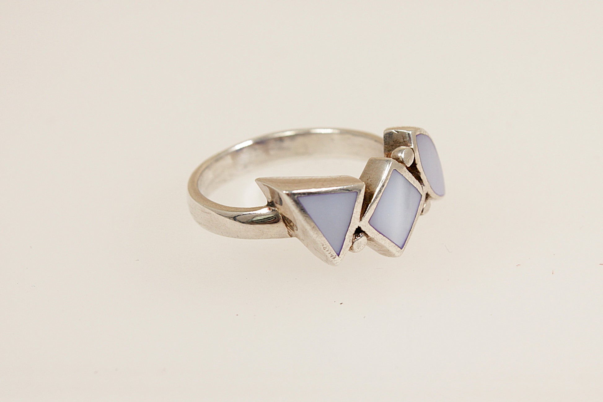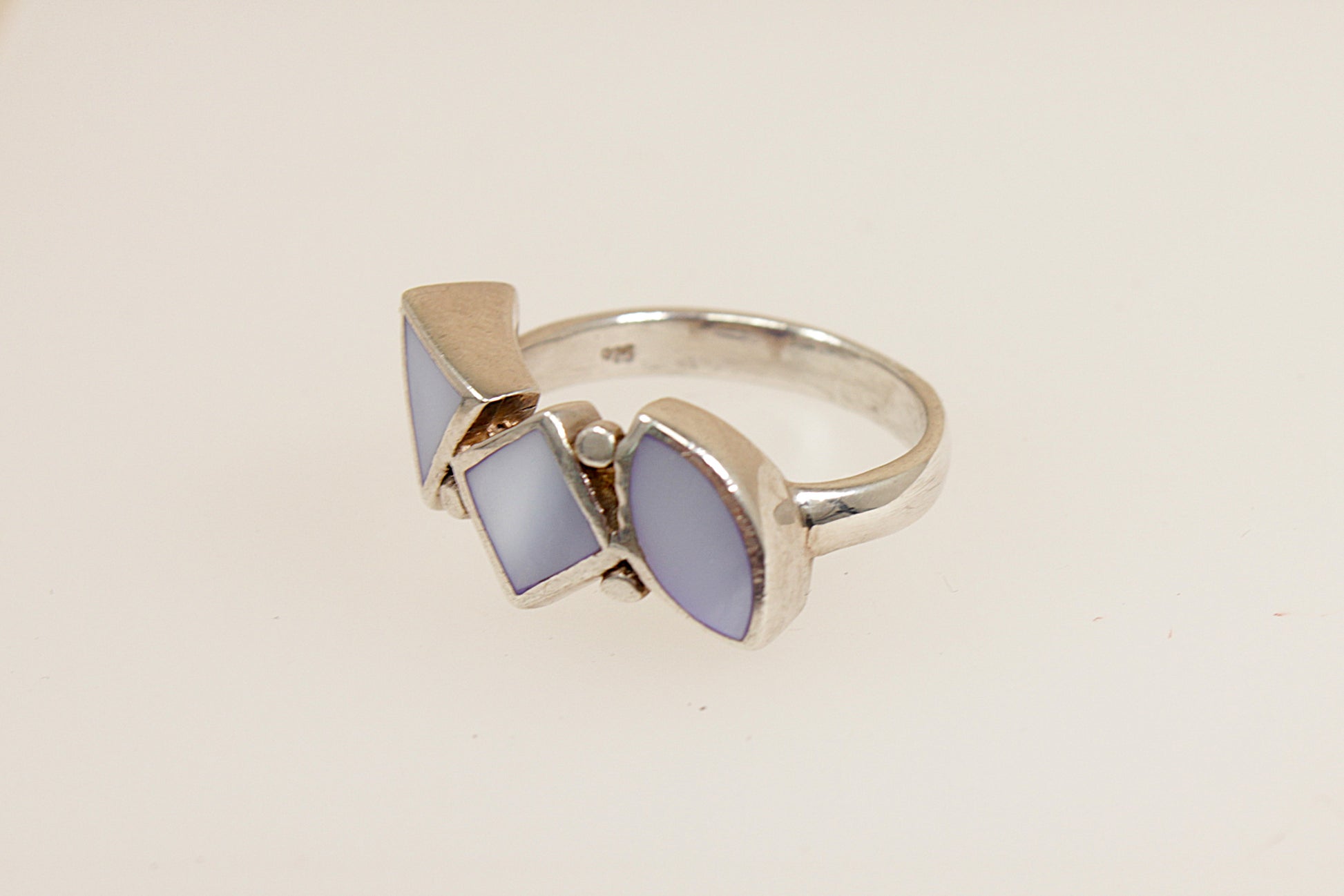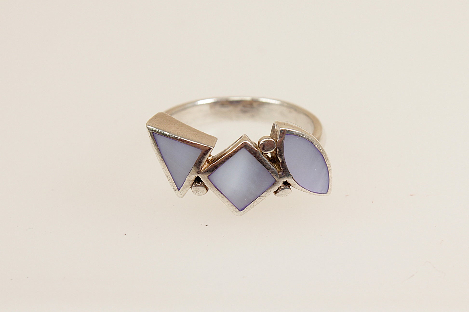 This stylish Silver and Mother of Pearl ring features three beautifully bezel-set smooth Mother of Pearl stones in elegant marquise, square, and triangular shapes.