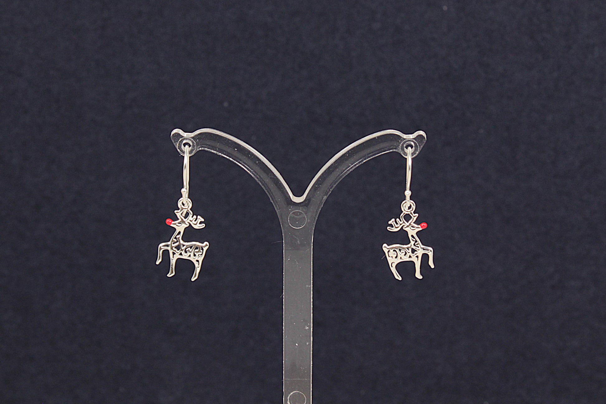 These charming novelty new Sterling Silver drop earrings are designed in the playful form of ‘Rudolph’ the red-nosed reindeer.