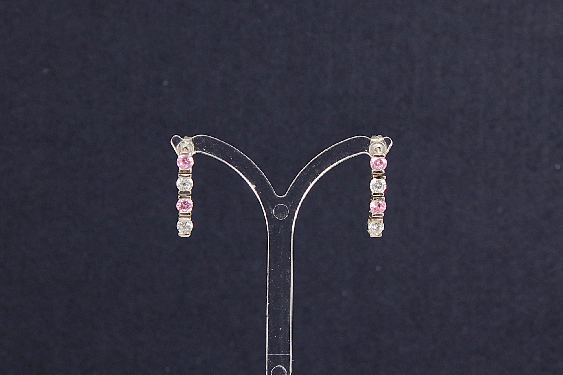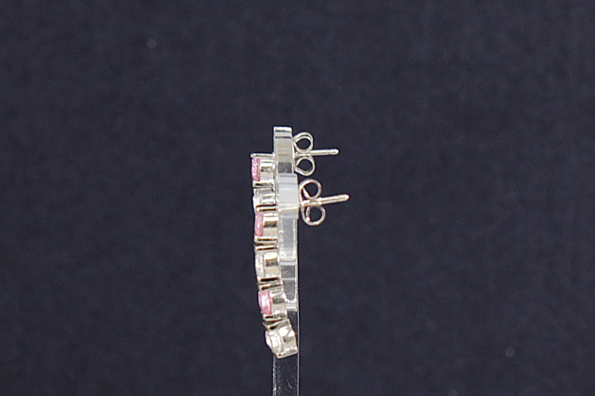 These pretty Silver Pink and White Crystal Earrings feature four round-cut stones—two delicate pink and two bright white crystals—half bezel set and joined by a small articulated link for graceful movement. They are beautifully balanced in design and finished with a secure stud fastening, making them elegant and versatile for any occasion. They are stamped 925 for sterling silver.