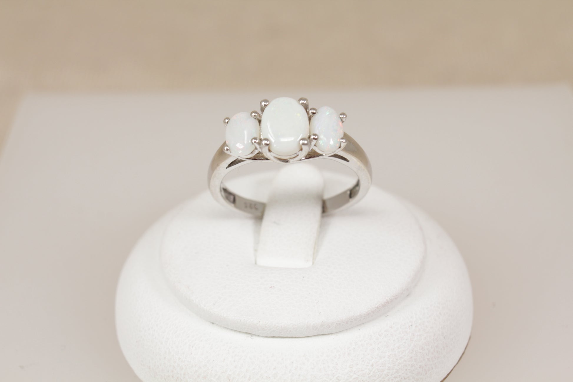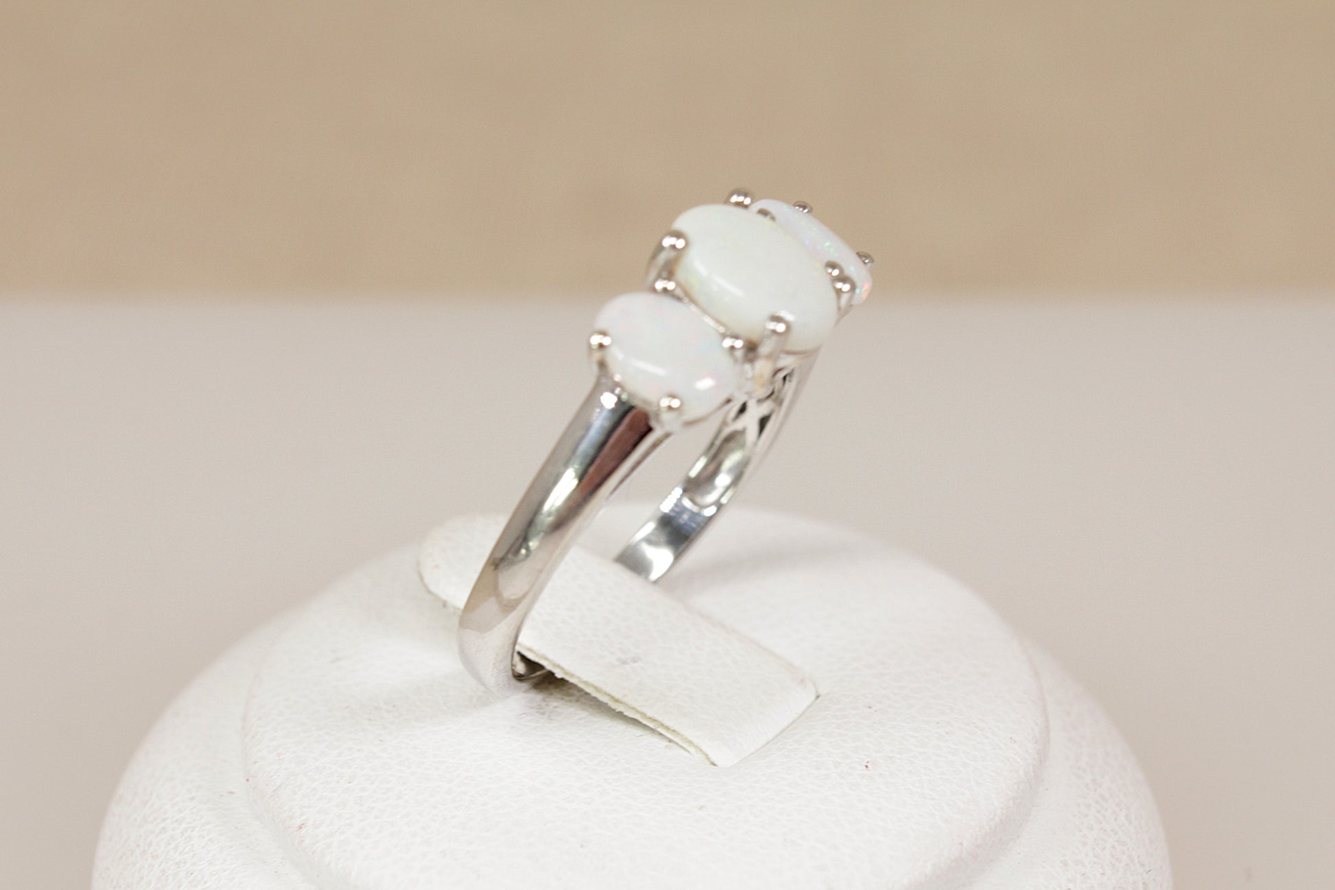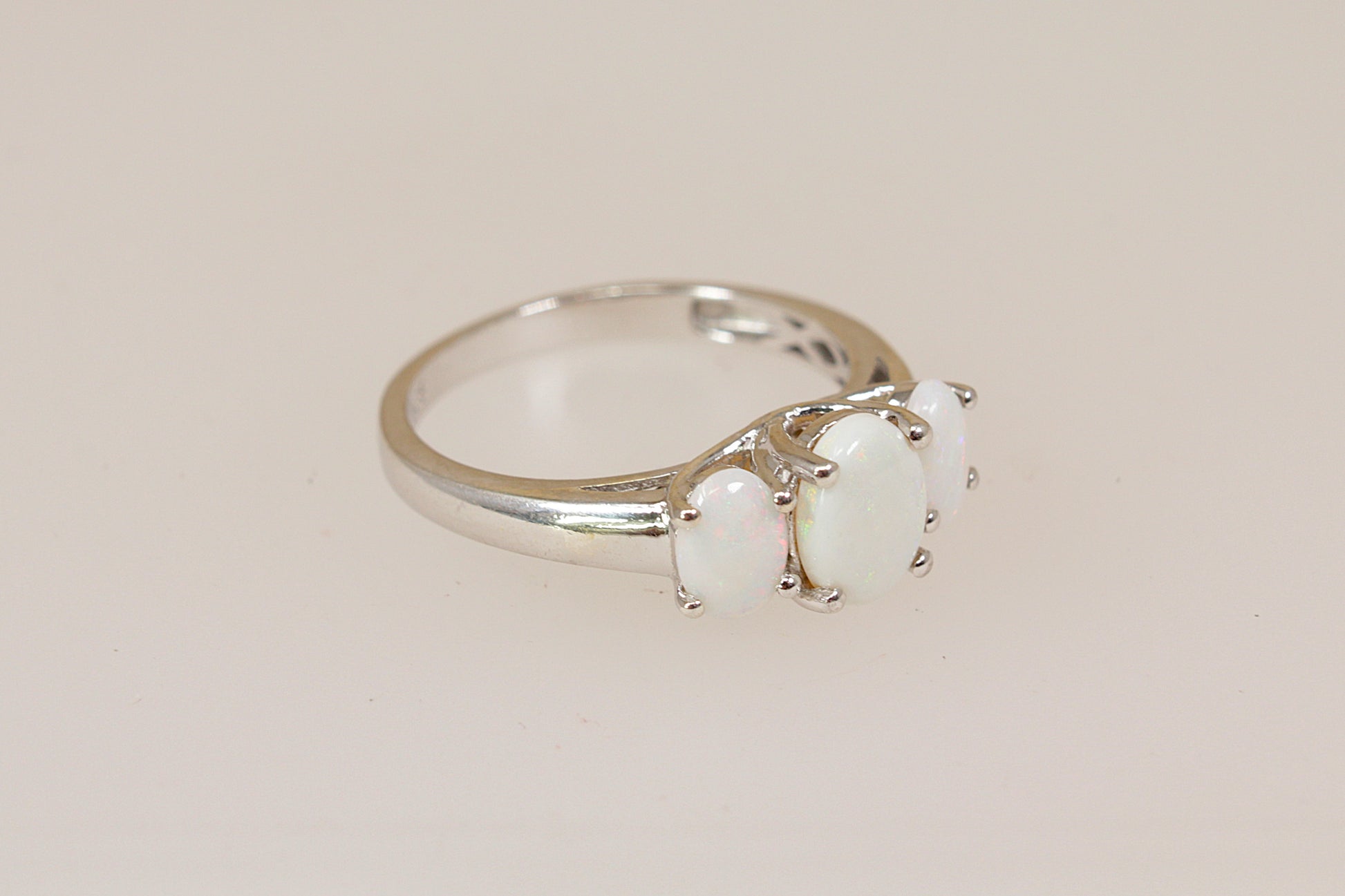 The trilogy design offers a balanced and timeless look, symbolising the past, present, and future, while the smooth cabochon cut enhances the natural play of colour within each stone.
