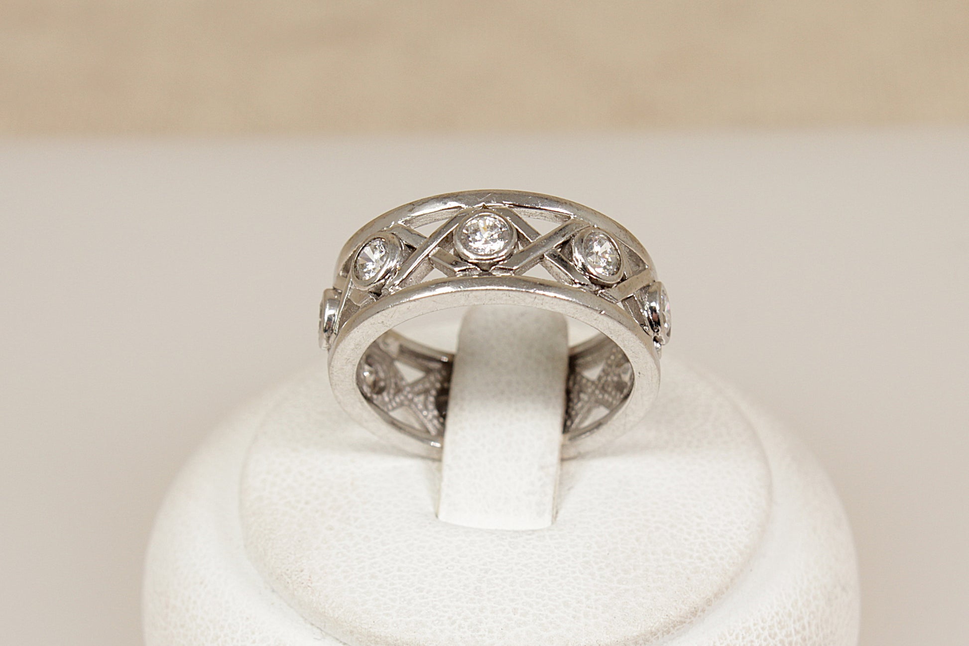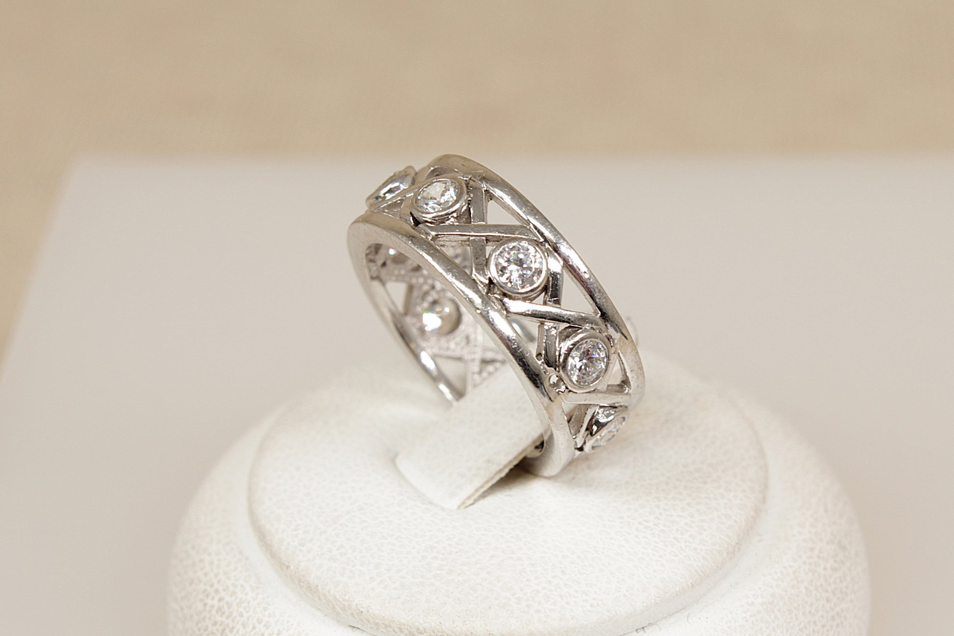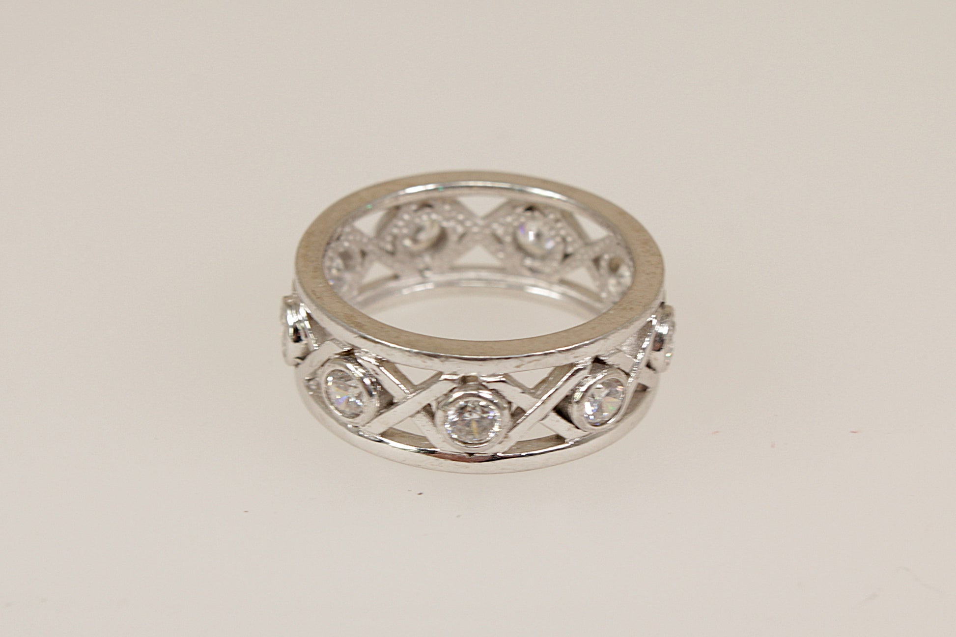 This elegant Sterling Silver eternity ring features a bold openwork design with round, bezel-set sparkling cubic zirconia stones alternating with an attractive “X” motif.