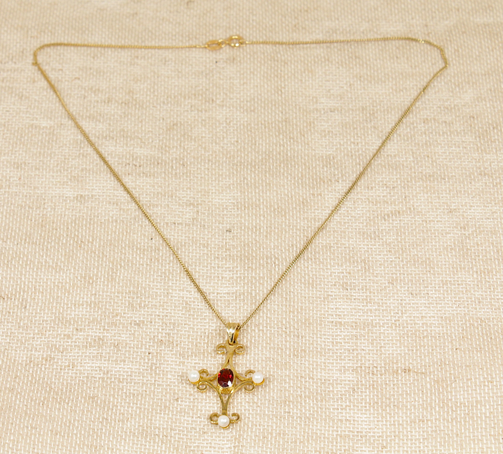 The pendant features a central bezel-set faceted garnet that glows with rich, deep red tones.