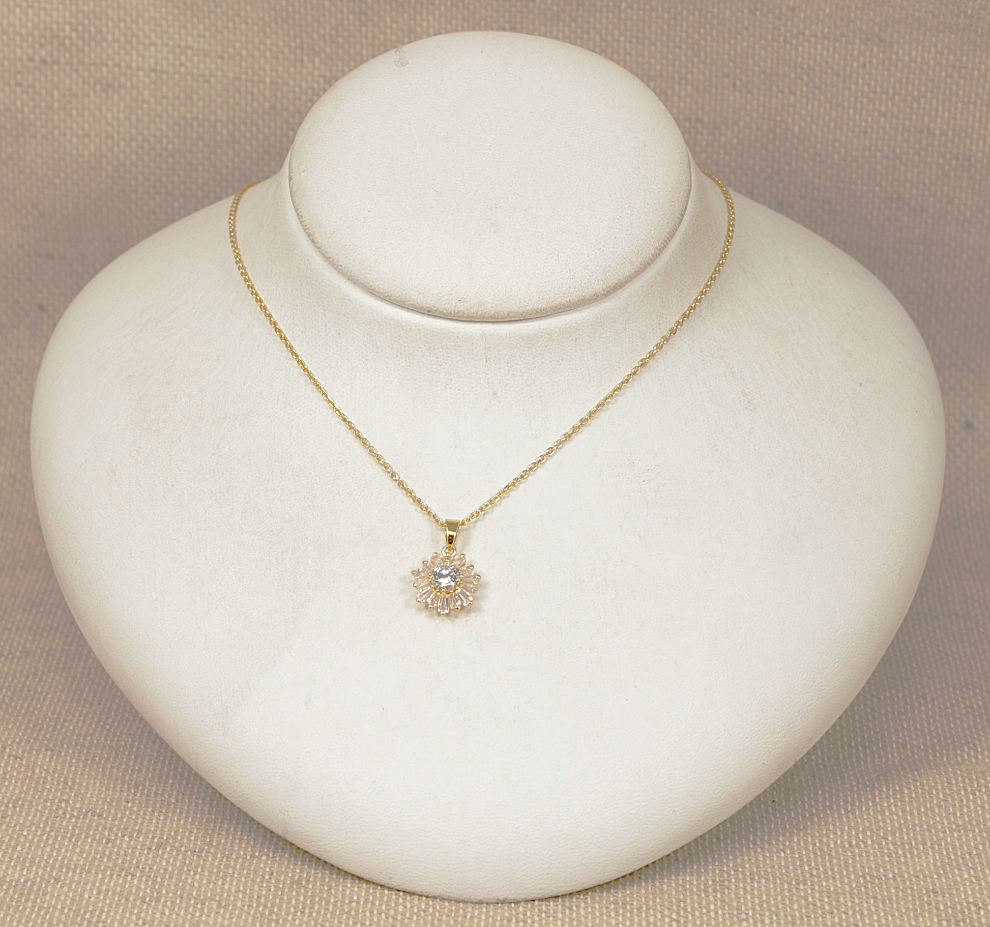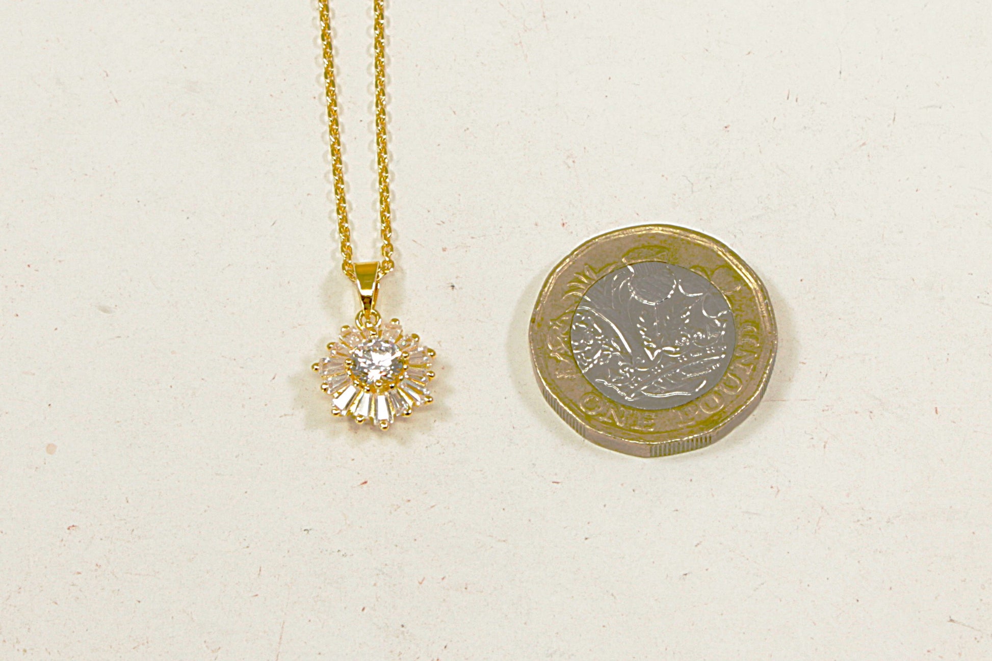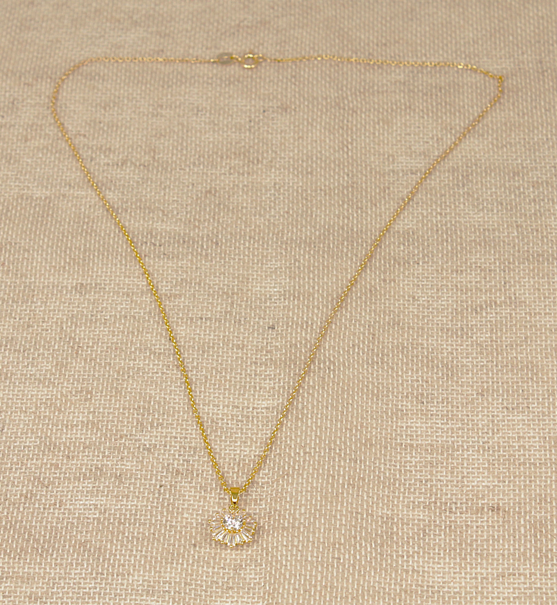 This pretty Silver Gilt pendant features a central round cubic zirconia gemstone, surrounded by sparkling baguette-cut C.Z. gemstones arranged in a delicate floral design.