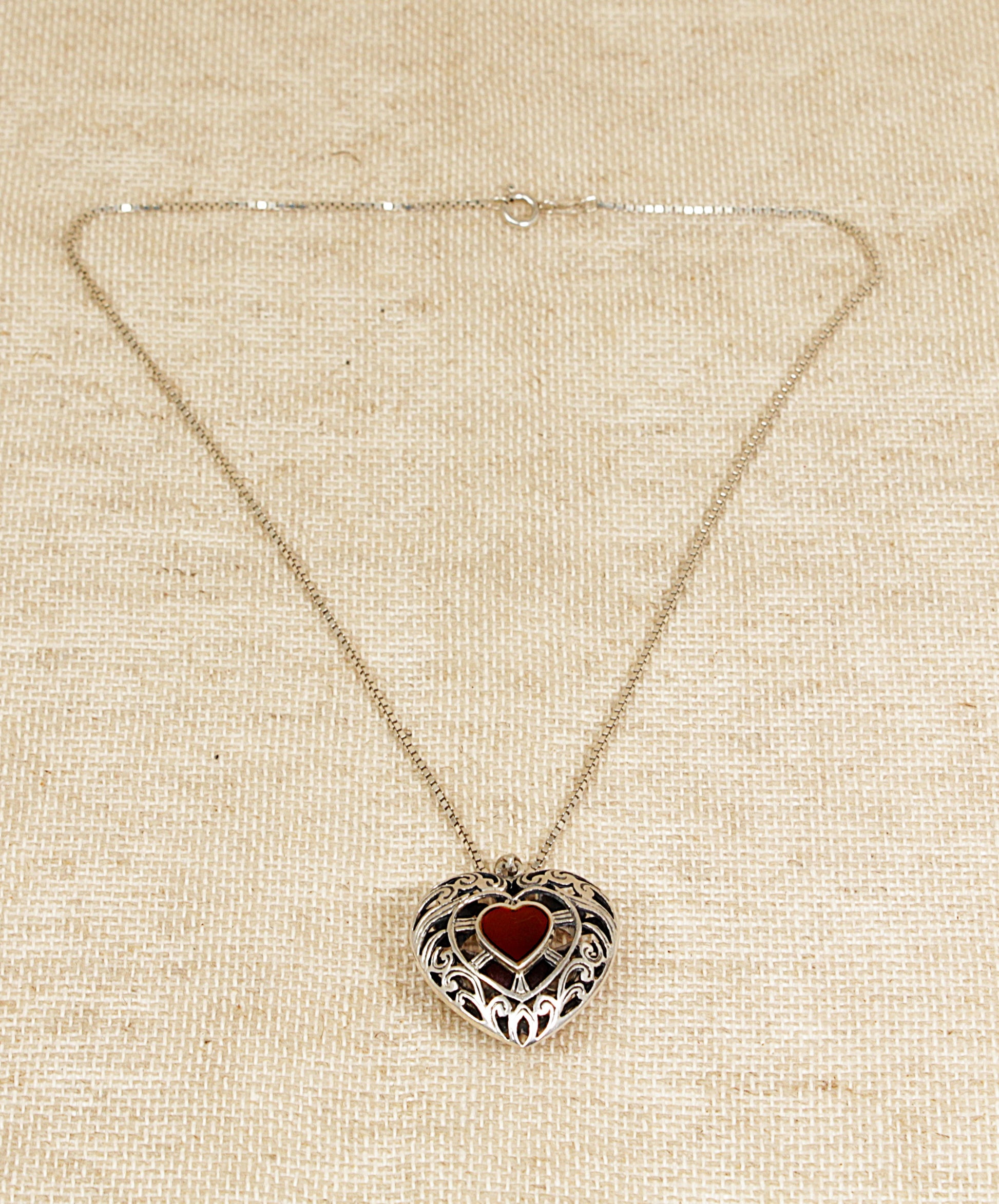 This beautiful and finely made Silver pendant features an intricate open fretwork heart design that showcases exceptional craftsmanship. At its centre sits a heart-shaped Carnelian gemstone, glowing with a warm, rich hue that contrasts elegantly with the polished silver. Surrounding the stone is delicate heart-shaped silver detailing, mirrored on the reverse side for a refined, double-sided finish.
