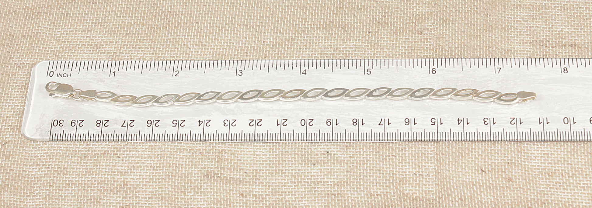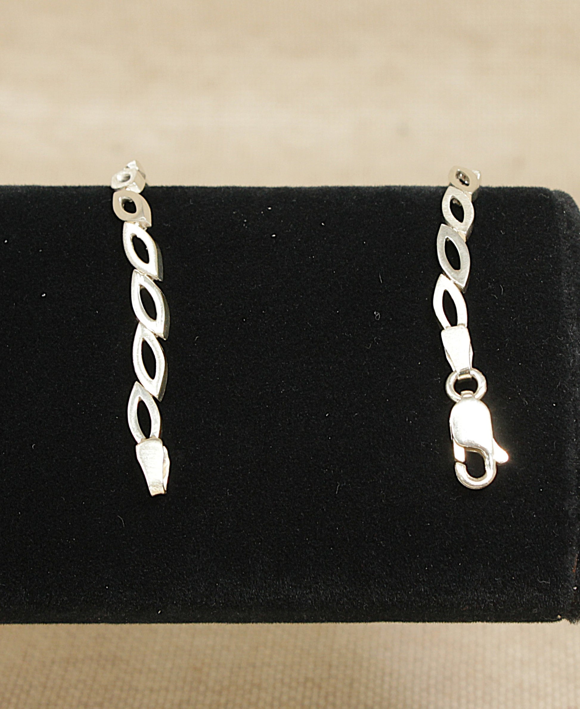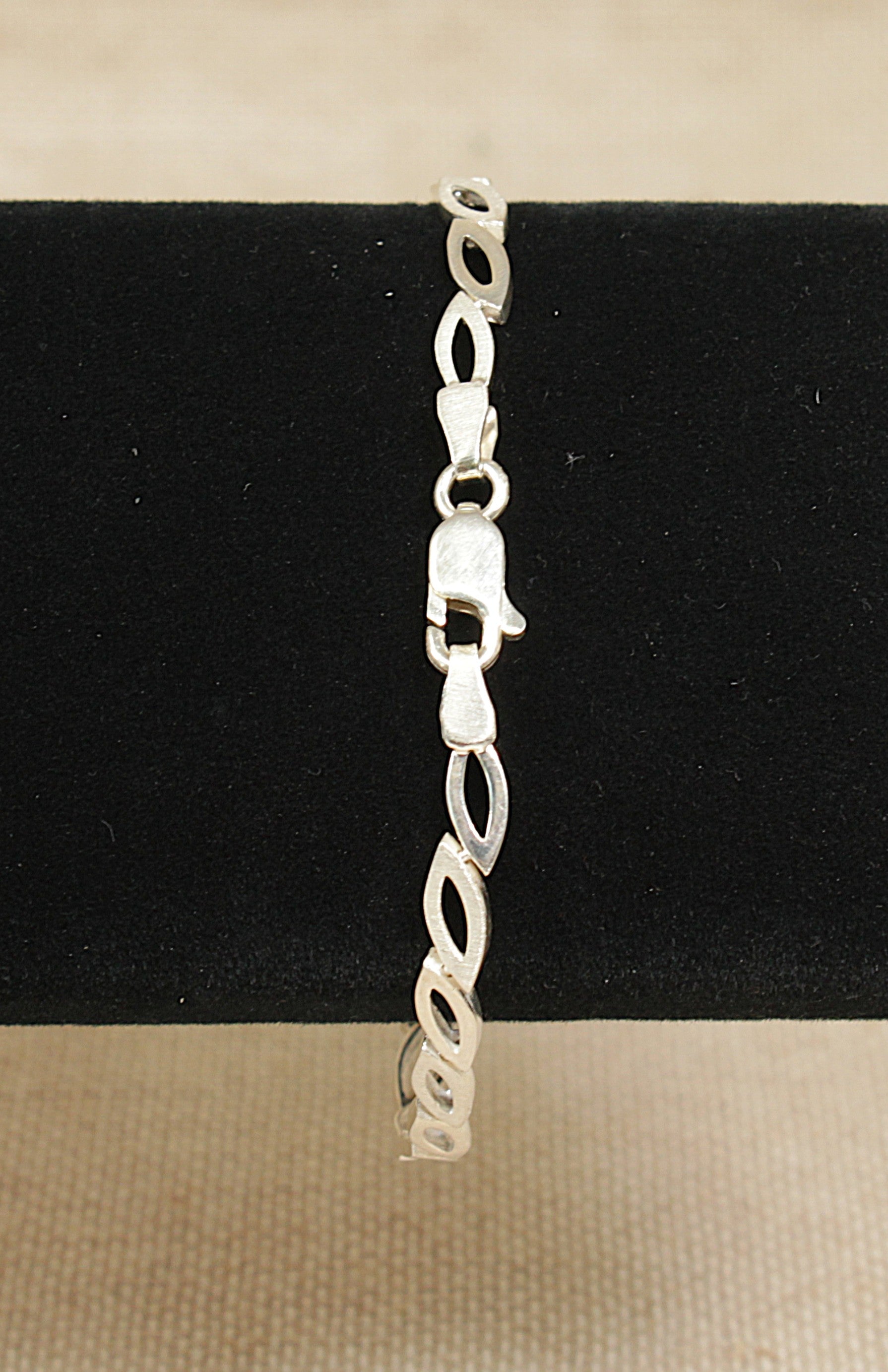 This elegant Sterling Silver bracelet features 20 marquise-shaped open links, each designed with alternating finishes for added visual interest.