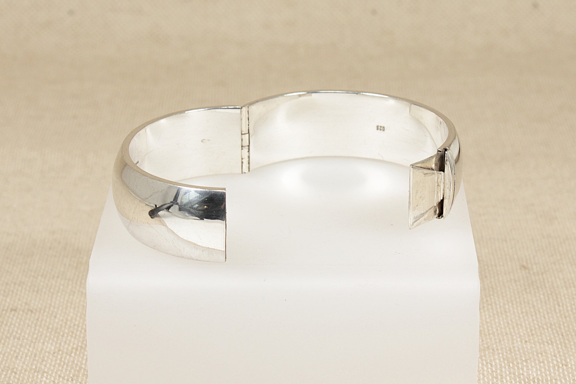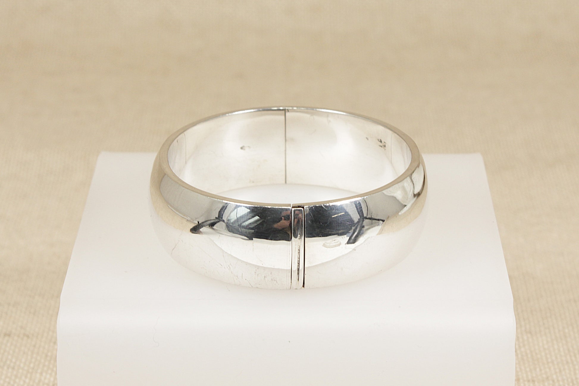 This beautiful Silver cuff bangle is a quality piece with a broad, slightly domed profile and a highly polished, smooth finish that runs around the entire band, giving it a sleek and timeless look.