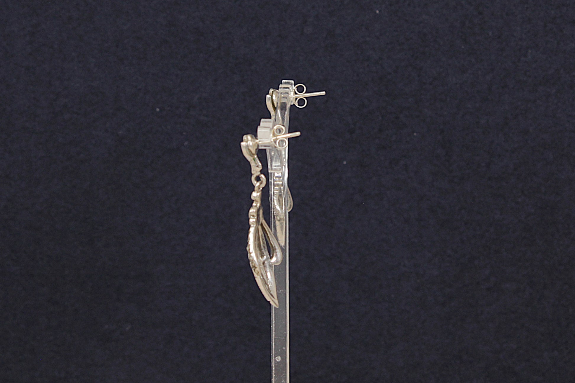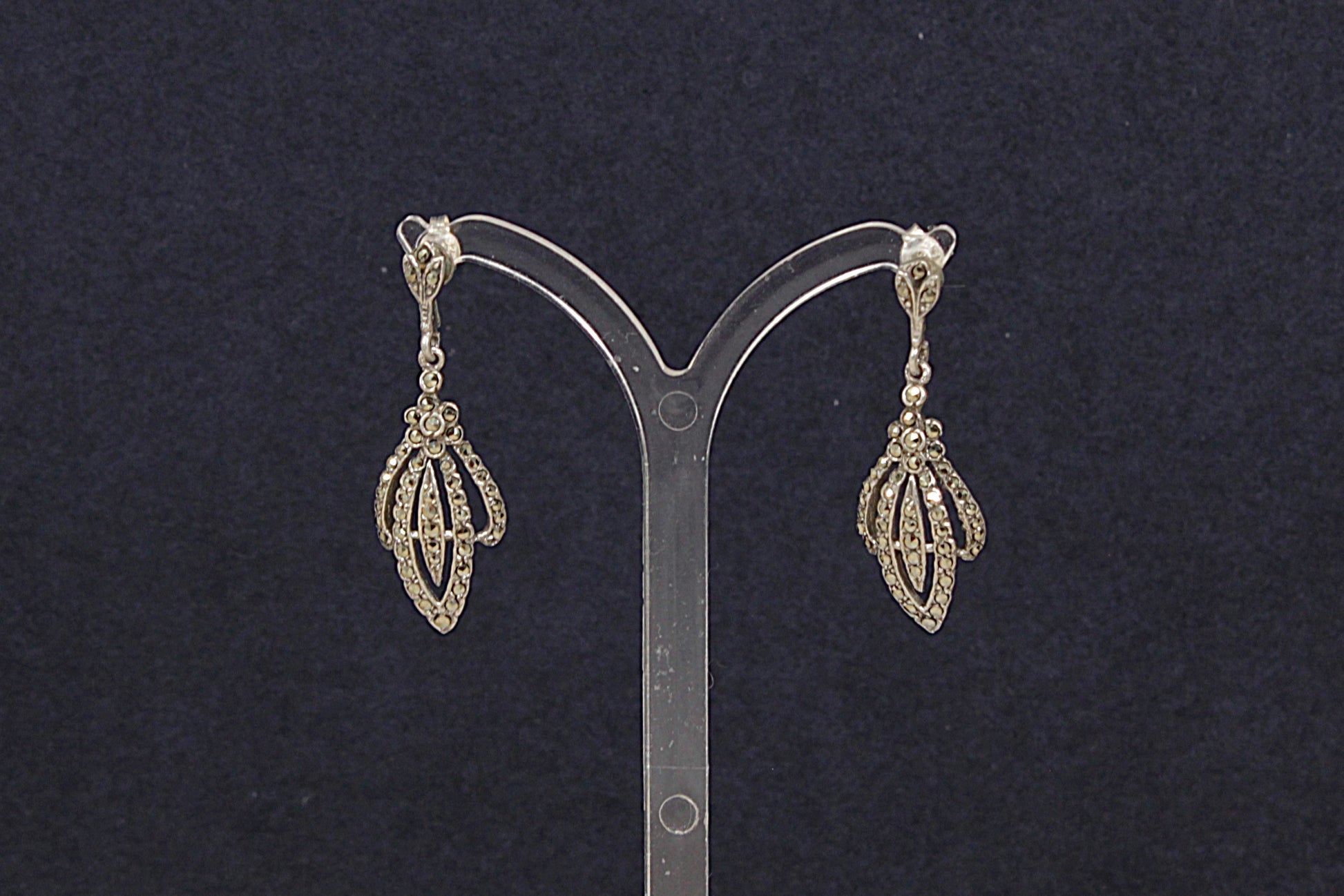 These pretty Vintage Art Deco Silver and Marcasite earrings feature an elegant leaf-inspired design, suspended from a delicate flower motif attached to the stud fastening, they are fully encrusted with sparkling marcasite stones that shimmer beautifully as they catch the light. Finely made and stamped SILVER, these earrings embody timeless Art Deco glamour.