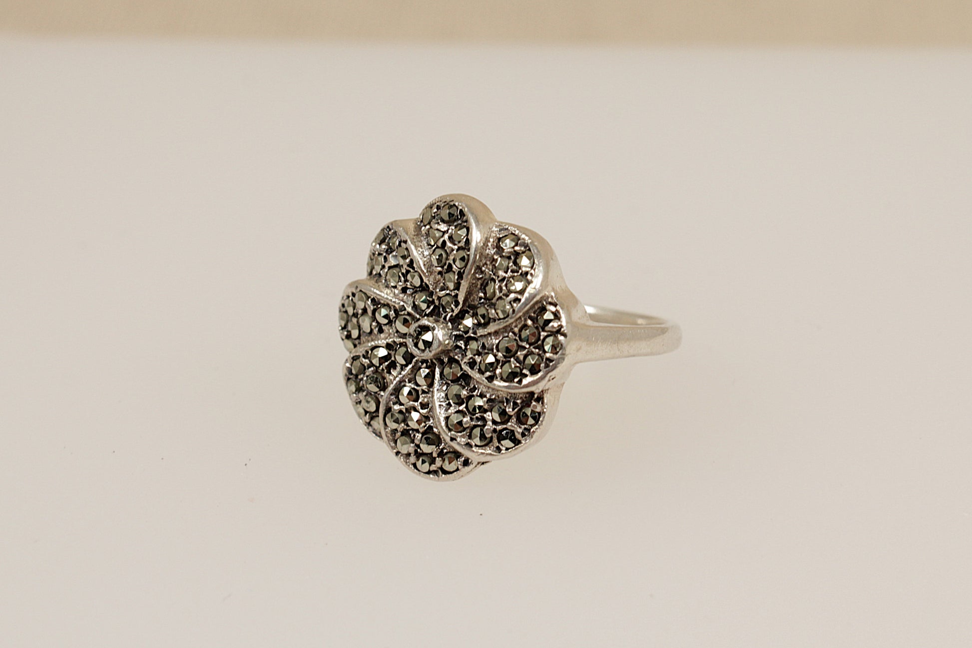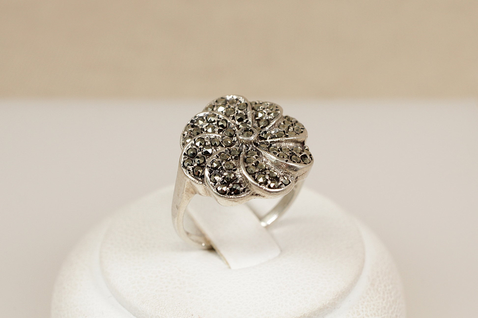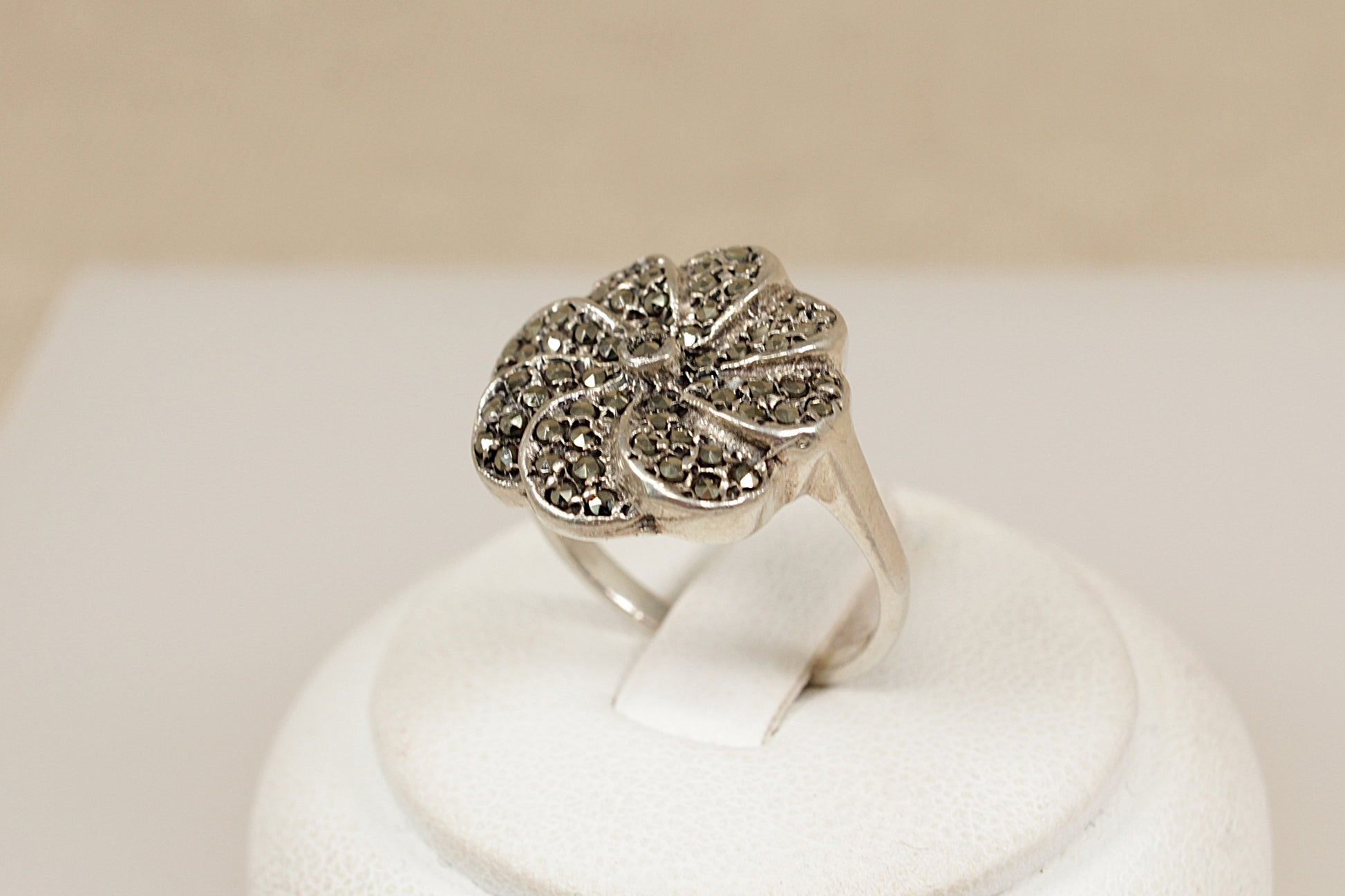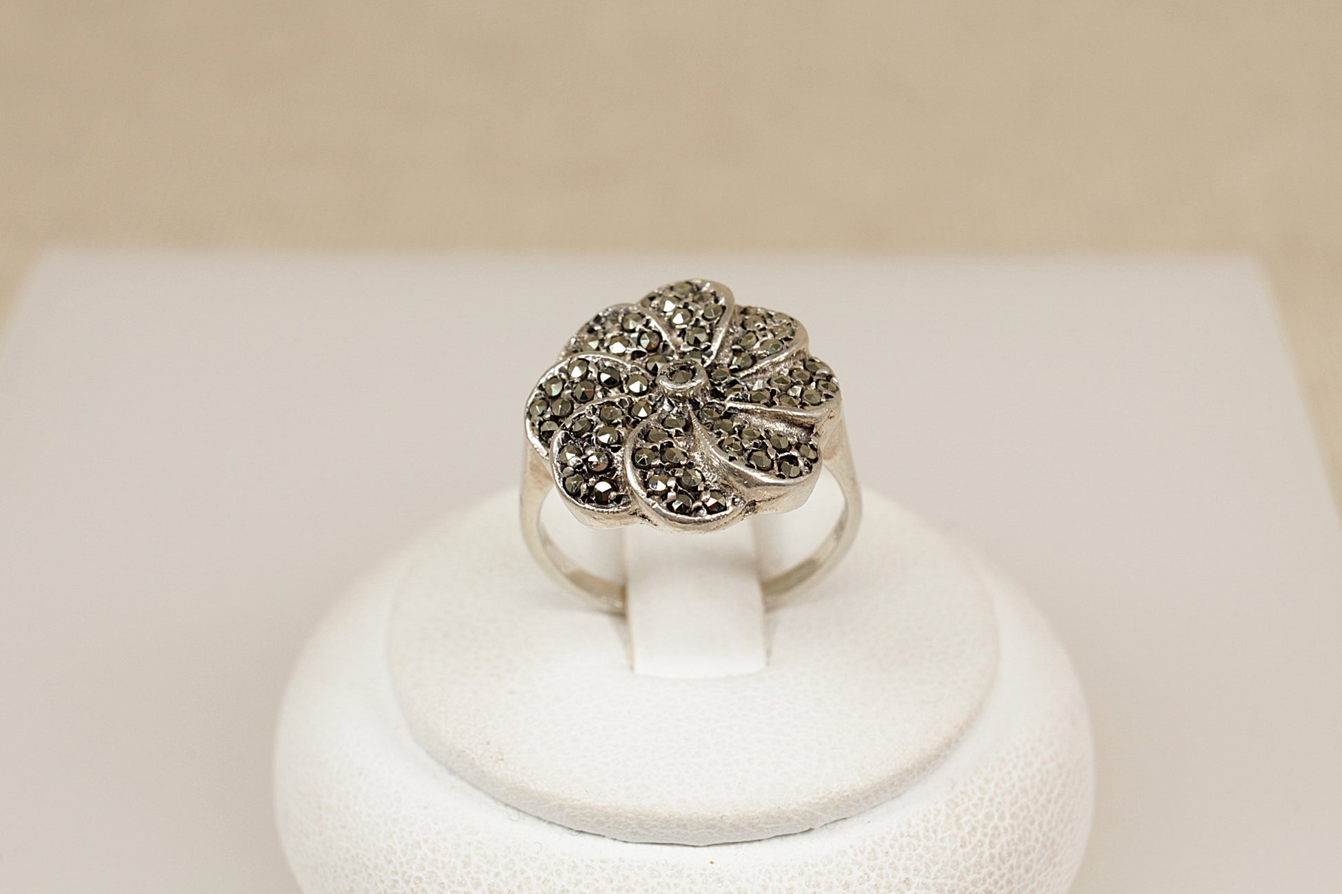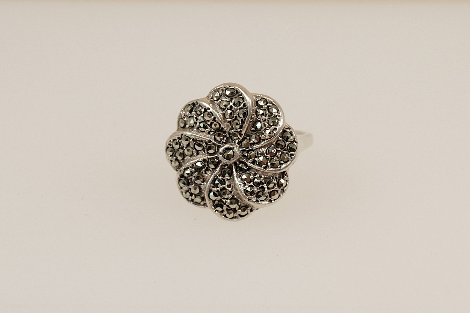 At its centre sits a sparkling marcasite stone, surrounded by symmetrical silver petals, each fully encrusted with marcasite for a dazzling, textured finish.