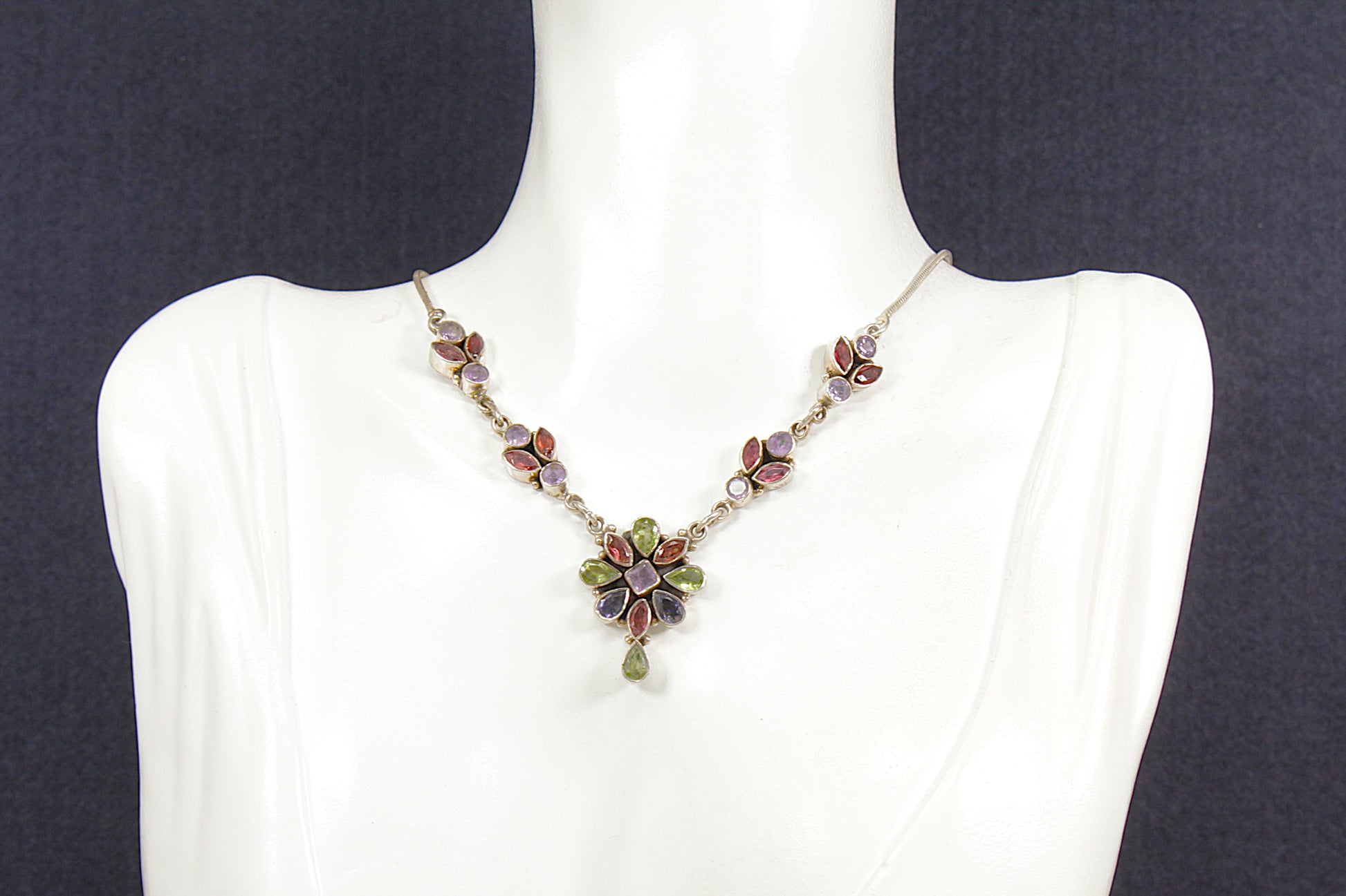 A beautifully designed Sterling Silver necklet featuring a harmonious combination of Amethyst, Peridot and Garnet gemstones in a variety of elegant cuts – marquis, round, and pear-shaped. At the centre sits a delicate flower motif, accented by vibrant stones, with two matching gem-set links on either side, creating a graceful and balanced design.
