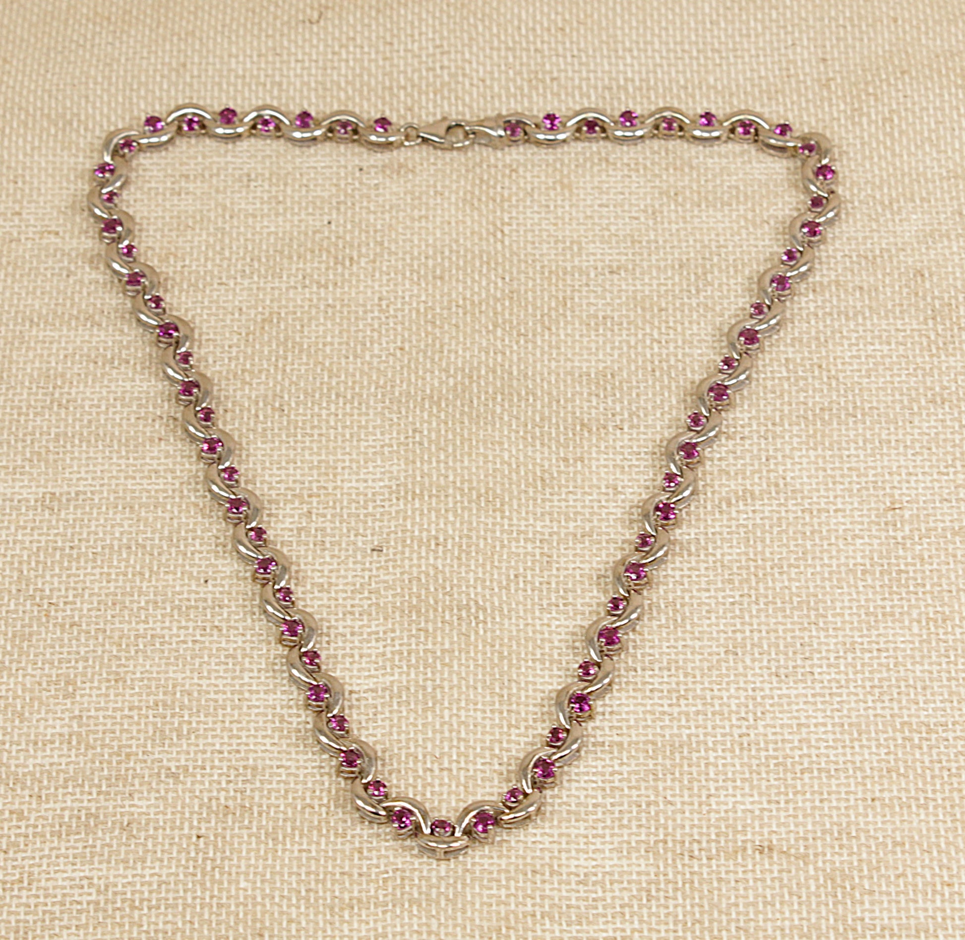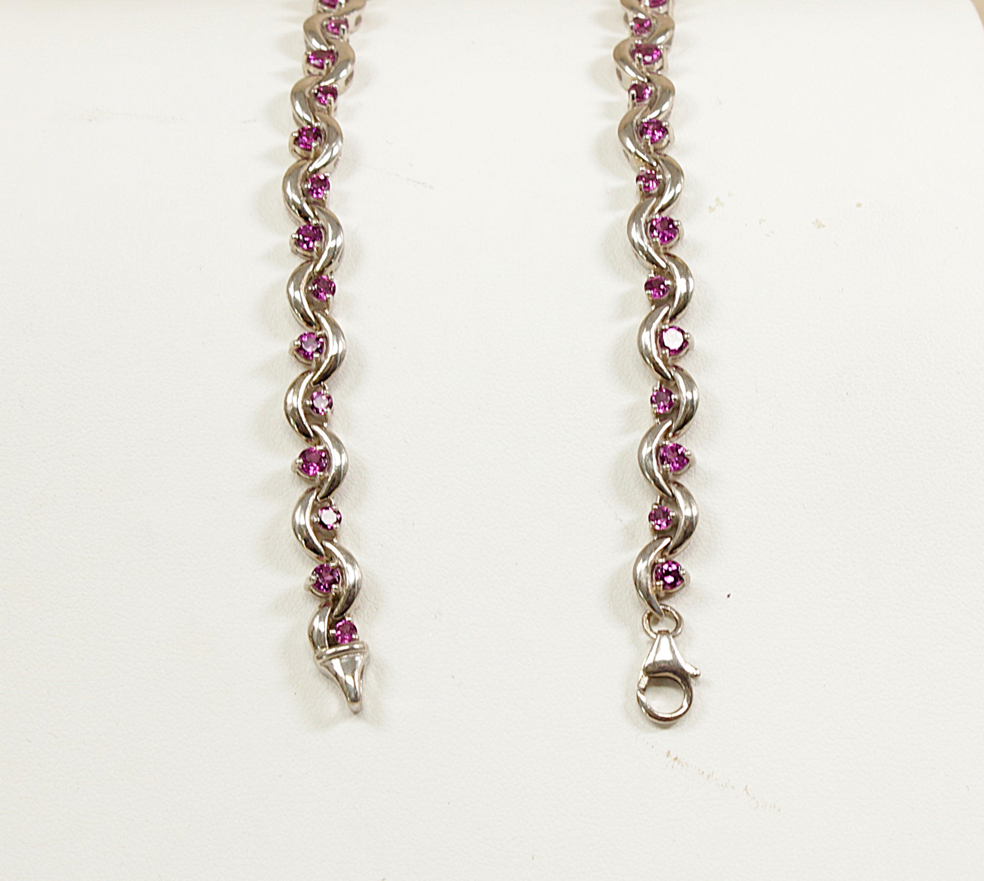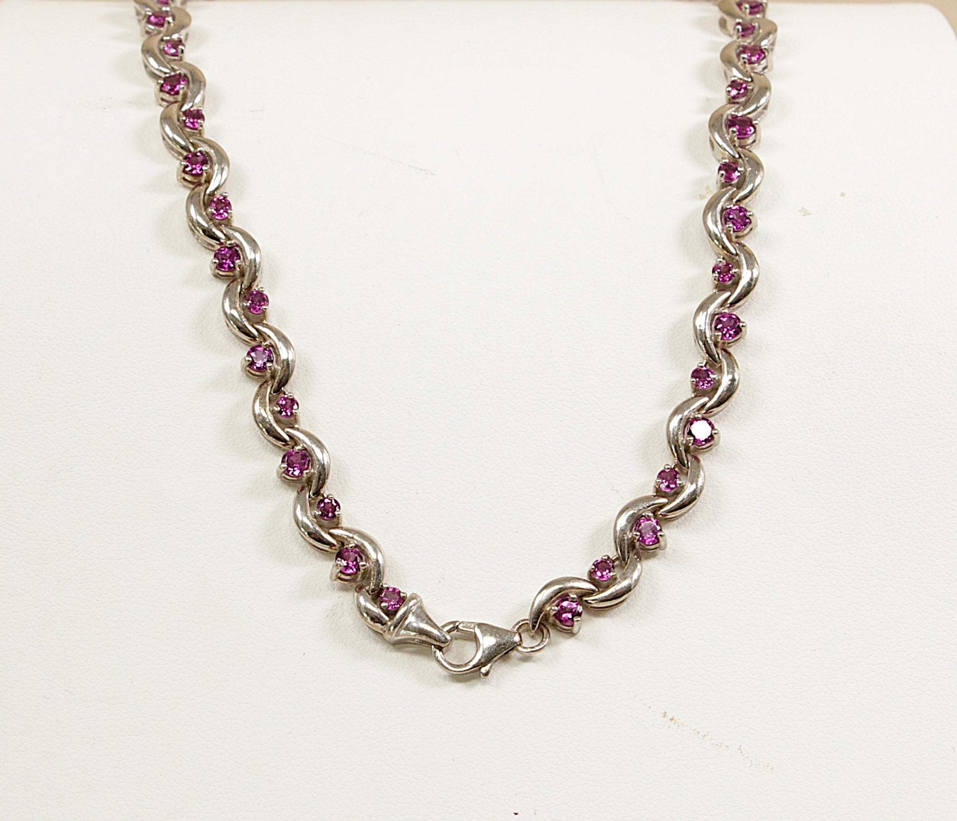 This stunning and elegant silver and Amethyst crystal fancy link necklace is beautifully designed with 63 sparkling Amethyst crystals, each individually set in graceful crescent-shaped links that form a continuous wave pattern around the neckline.