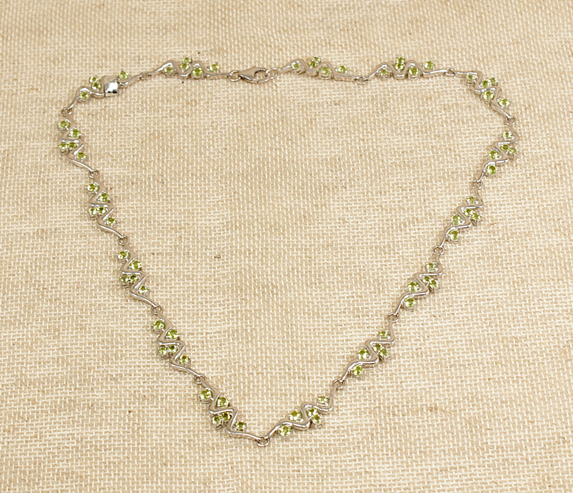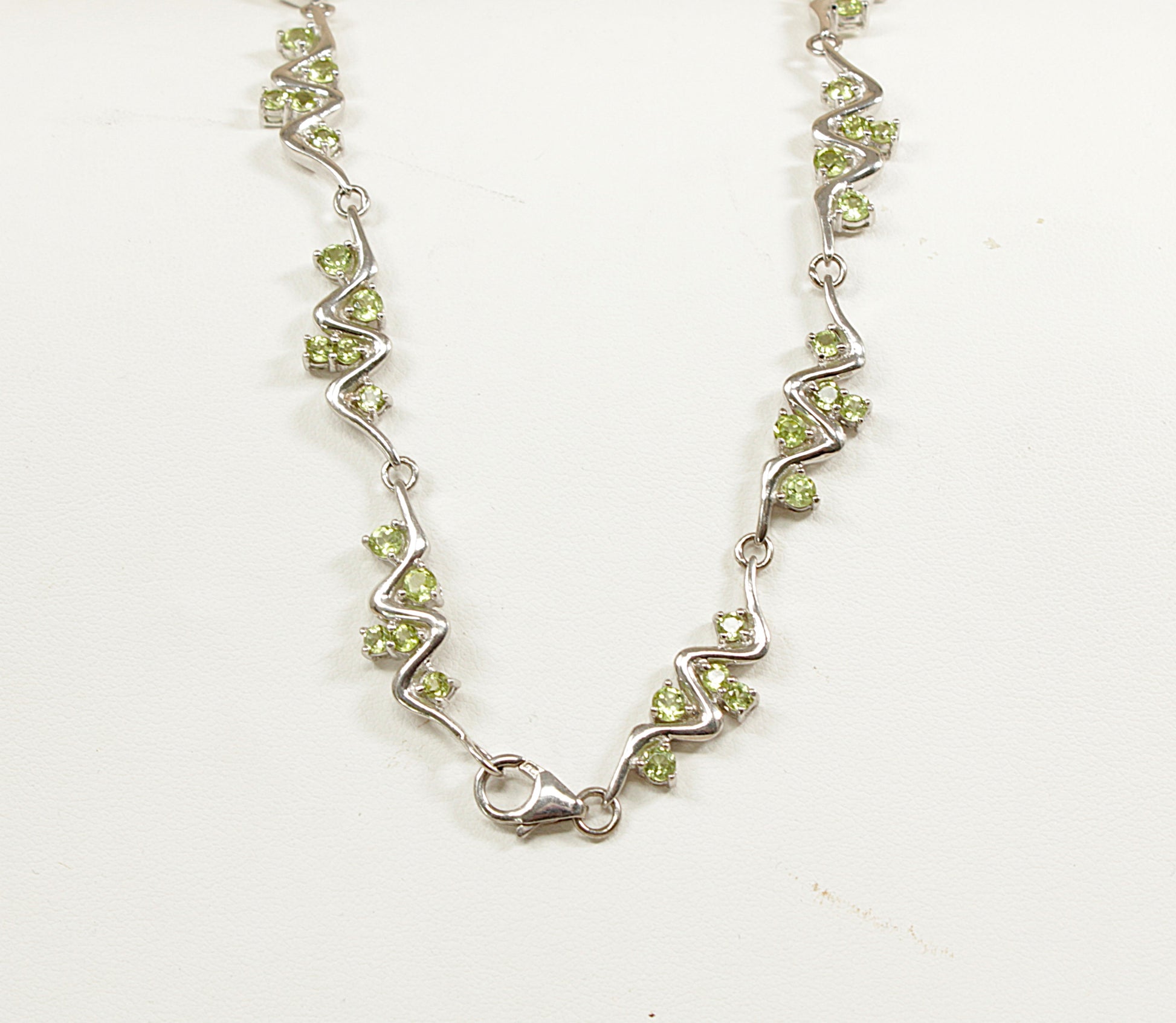 Between the flowing silver waves sit five round faceted Peridot gemstones, each claw set to allow maximum sparkle and light play. The necklace measures 16 inches in length, making it perfect for both day and evening wear. Finely made and of excellent quality, it is stamped 925 for sterling silver.