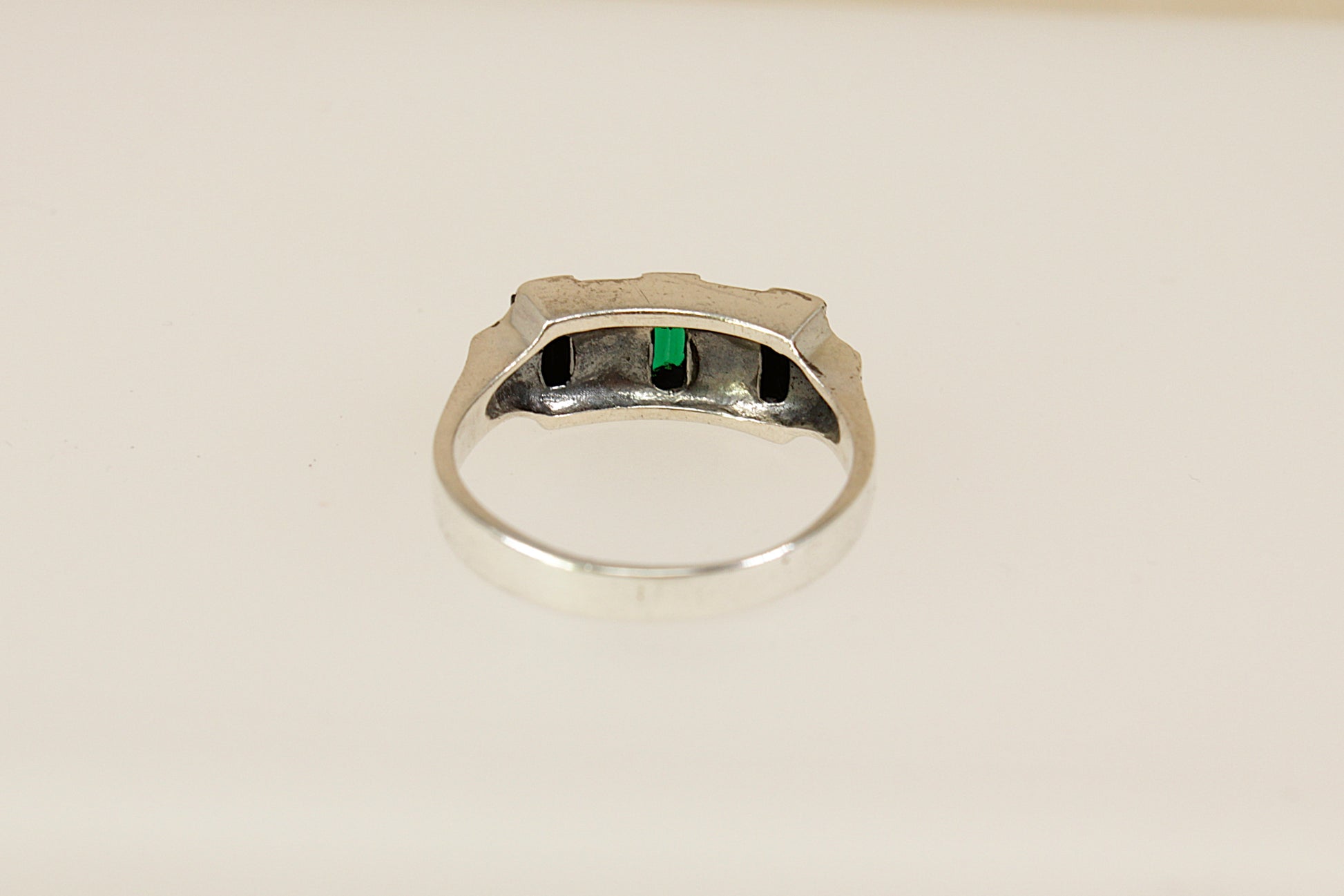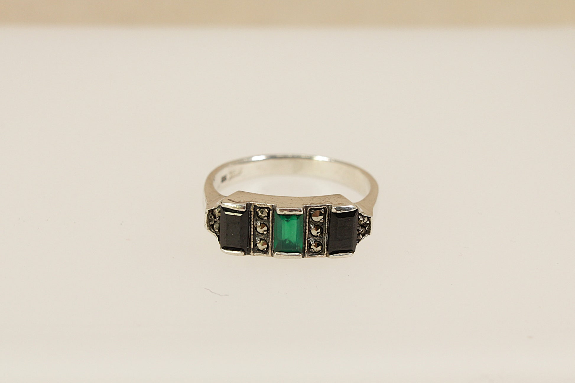 A bold and striking Art Deco style Silver ring featuring a central rectangular faceted Chalcedony stone flanked by matching rectangular Onyx stones on each side. The stones are interspaced with shimmering marcasite accents, all set within an angular, geometric rectangular mount that perfectly captures the elegance of the Art Deco era. Inside the band, it is stamped 925 for sterling silver.
