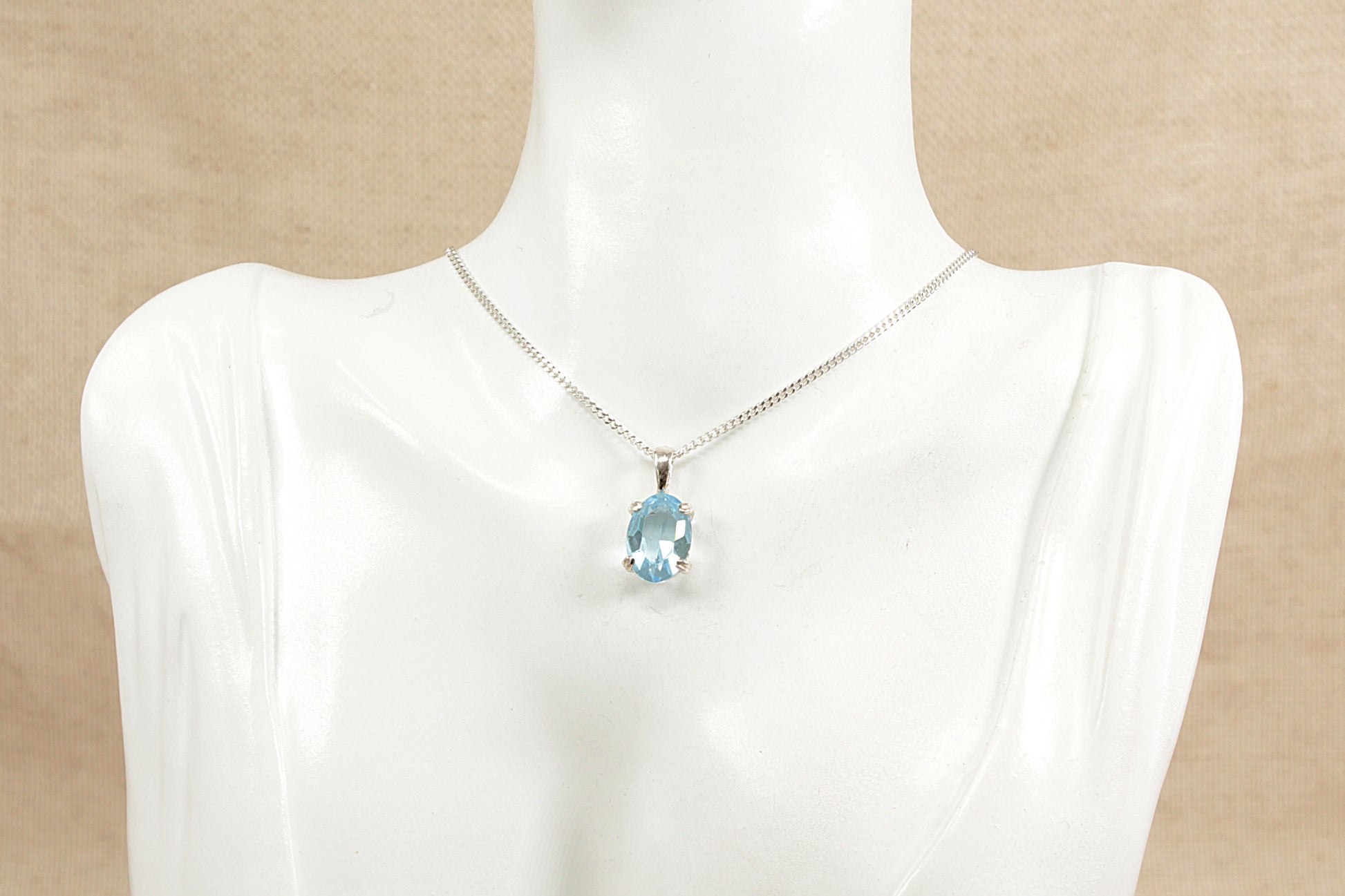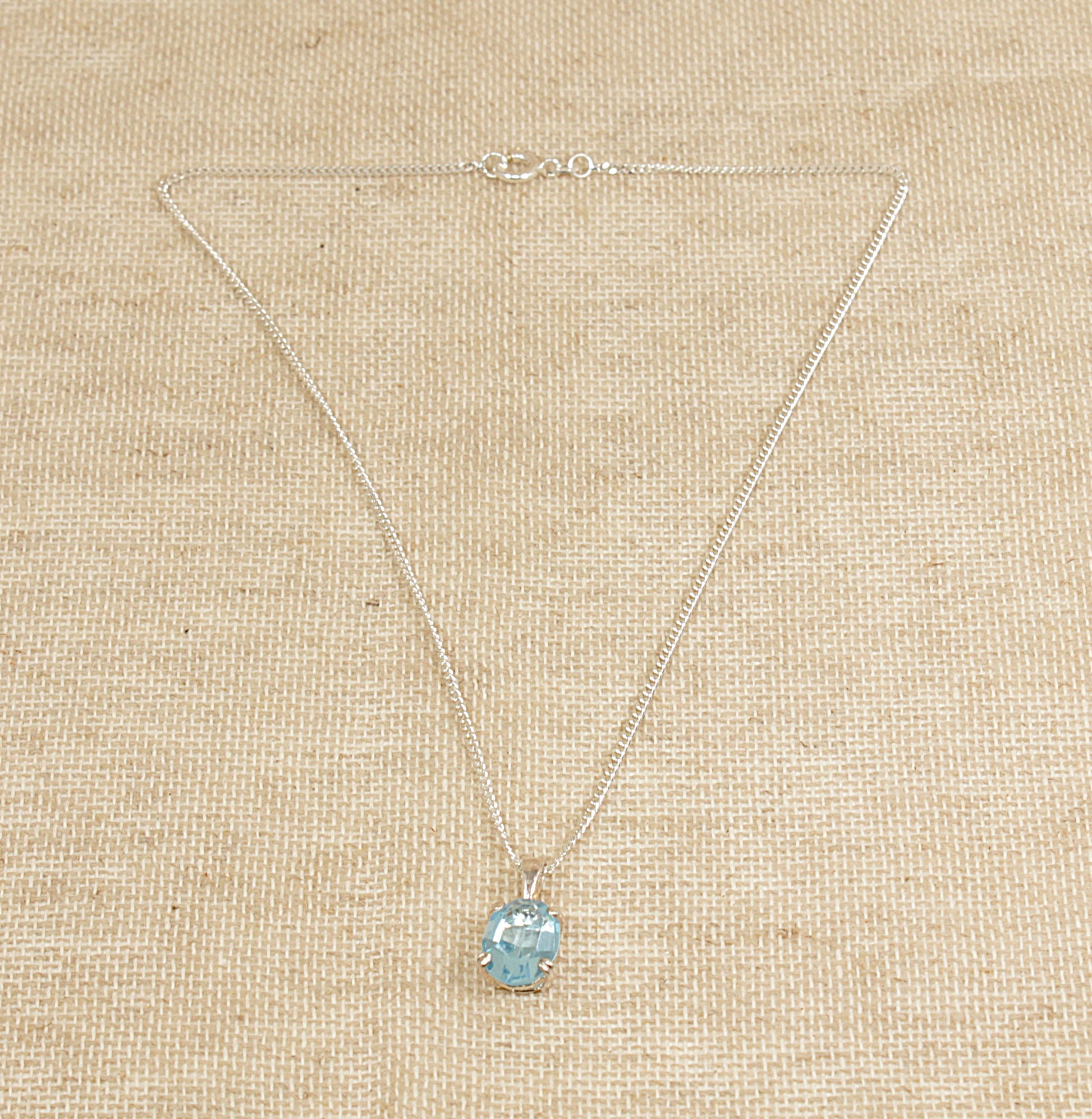 This beautiful Silver pendant showcases a large oval blue crystal that shimmers with captivating brilliance.