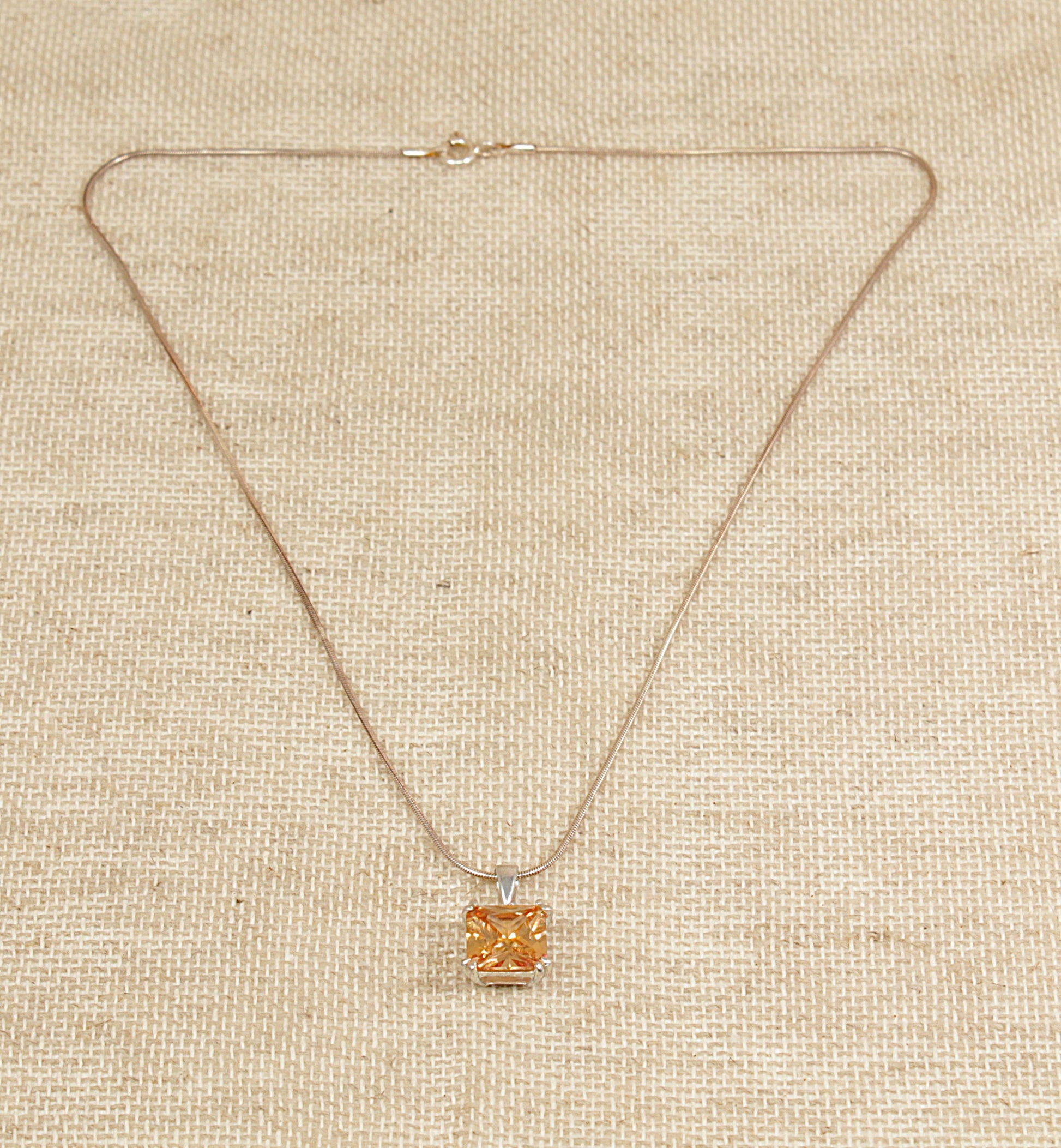 This elegant Silver pendant features a large square Citrine-coloured crystal that sparkles beautifully in the light. The stone is securely held in an open basket setting with four claws, allowing light to pass through and enhance its warm golden hue. Suspended from a 16-inch silver snake chain, the pendant sits gracefully at the neckline. It is stamped 925 for silver, combining timeless style with a touch of vibrant sophistication.