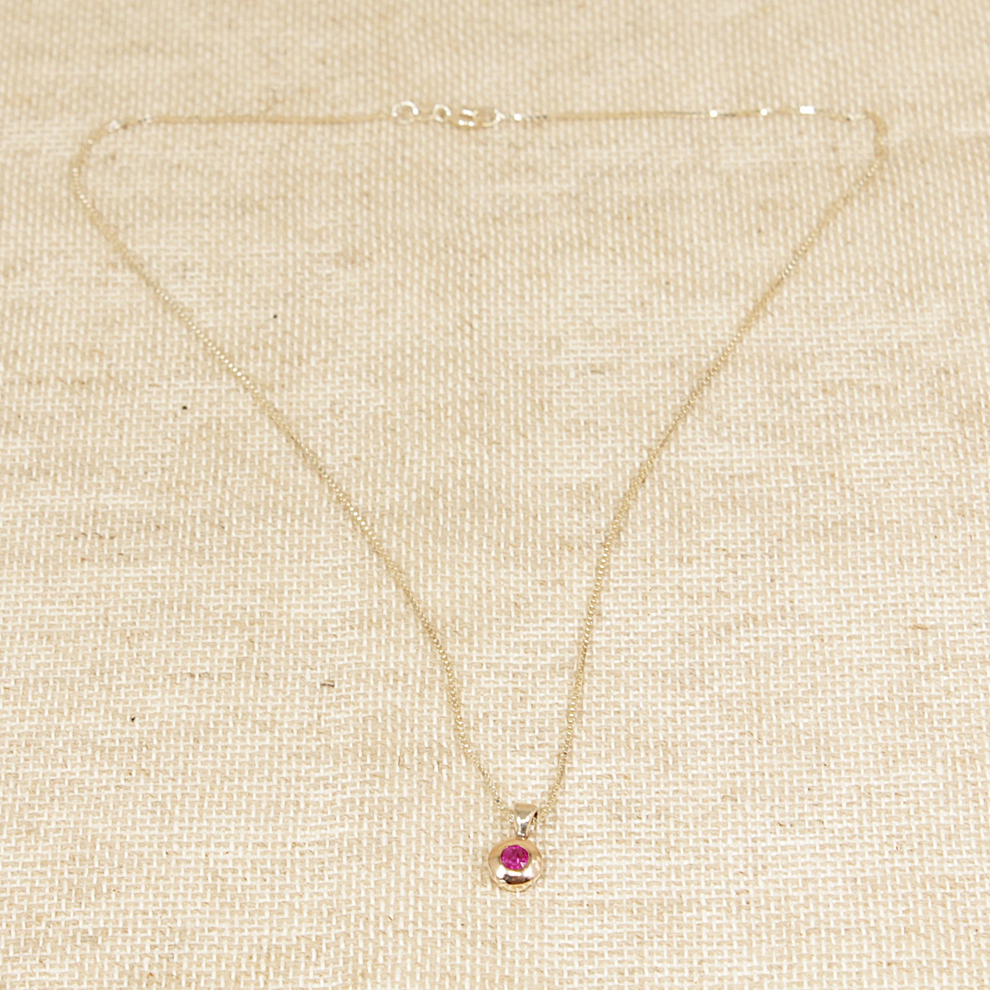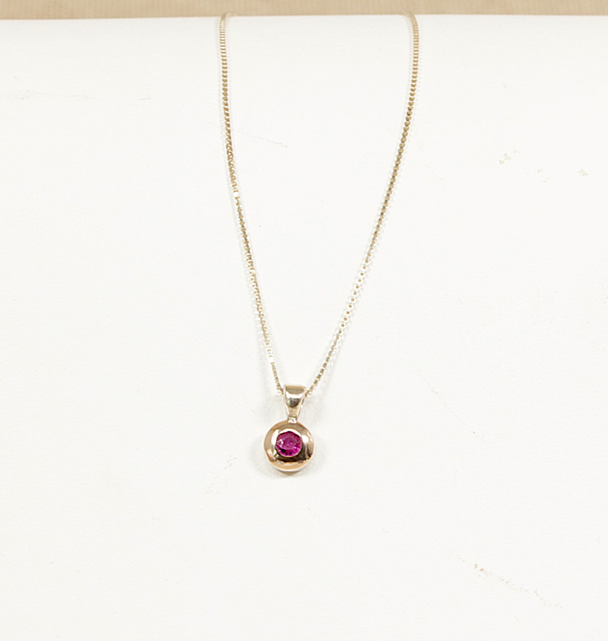 The pendant features a round, faceted Ruby, bezel set in a smooth circular silver frame. A warm gold overlay around the bezel adds a touch of luxury and contrast, beautifully highlighting the deep red hue of the gemstone. The pendant is suspended from a 16-inch silver box chain, offering a sleek and refined finish. Both pendant and chain are stamped 925 for sterling silver. A delicate and sophisticated design, perfect for adding a subtle splash of colour and elegance to any outfit.