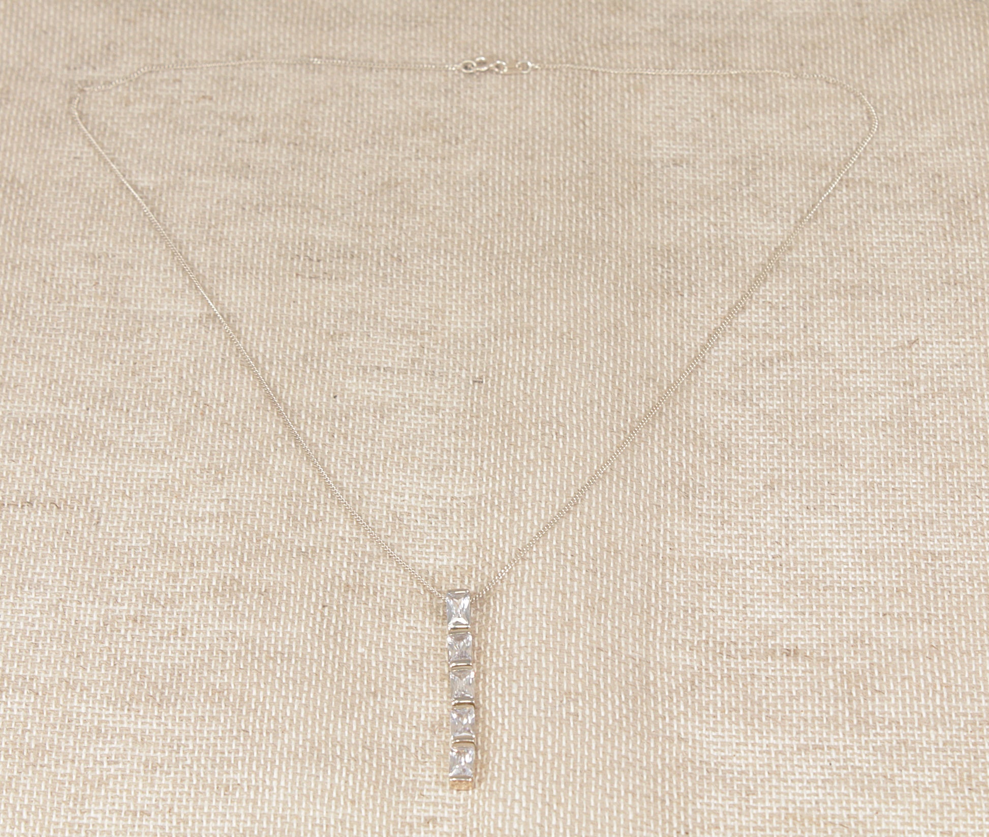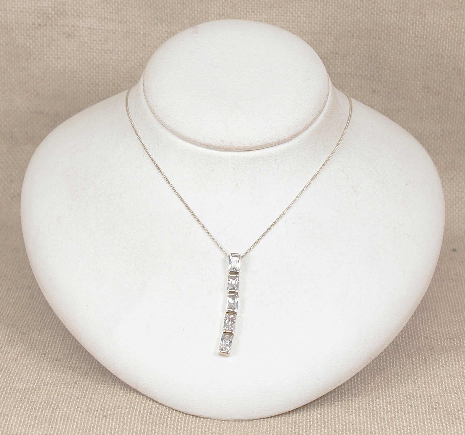The articulated pendant is set with five faceted rectangular CZ stones, each half bezel set and joined by tiny linking sections, allowing gentle movement and extra sparkle.