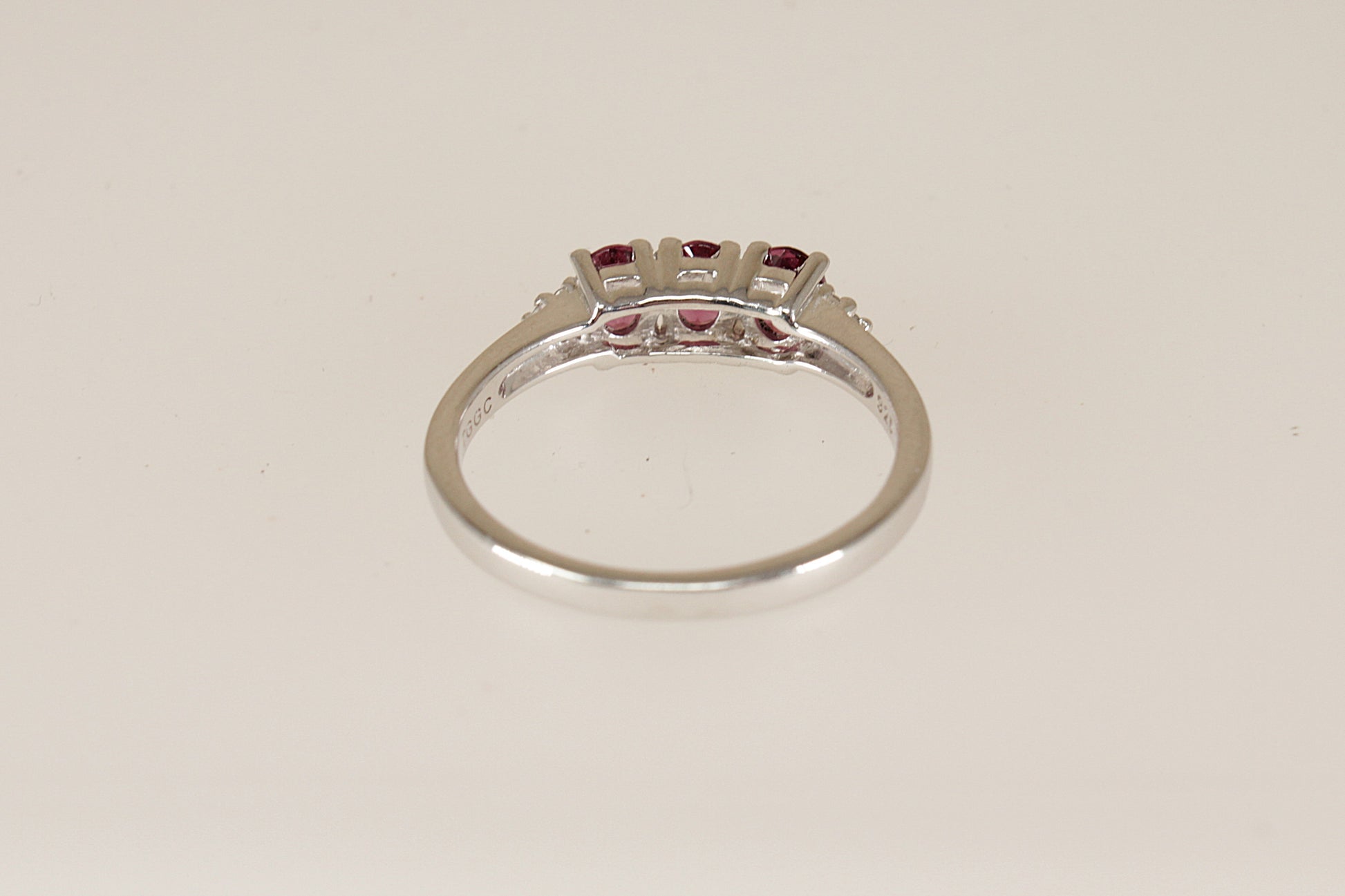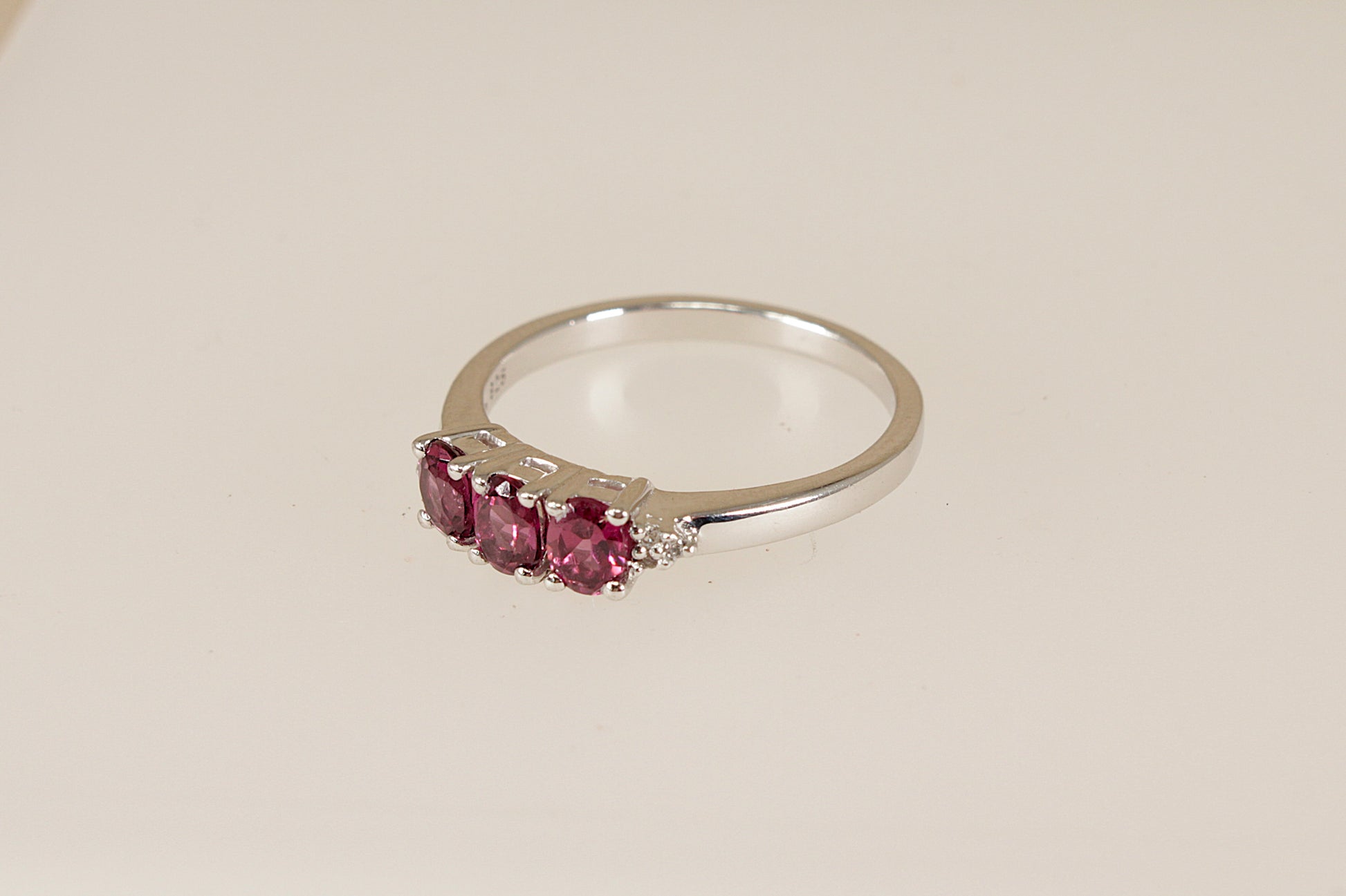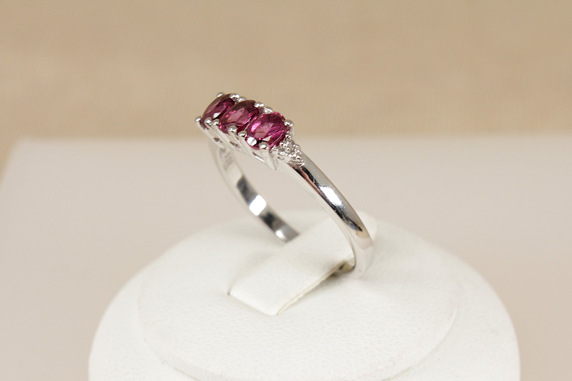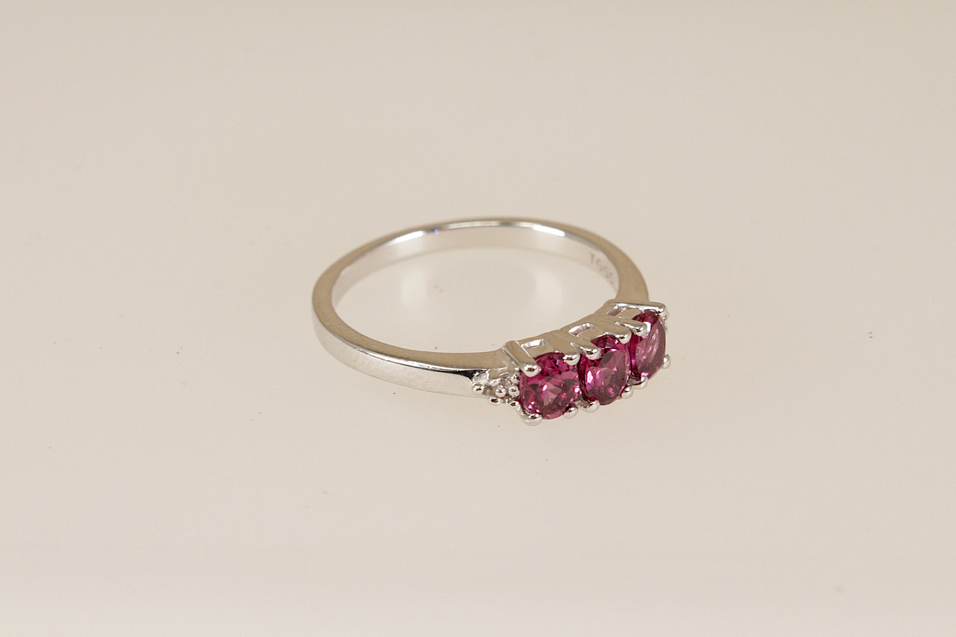 This pretty and classic silver Pink Tourmaline trilogy ring features three oval gemstones, each four-claw set in a traditional crown setting, creating a timeless and elegant look.