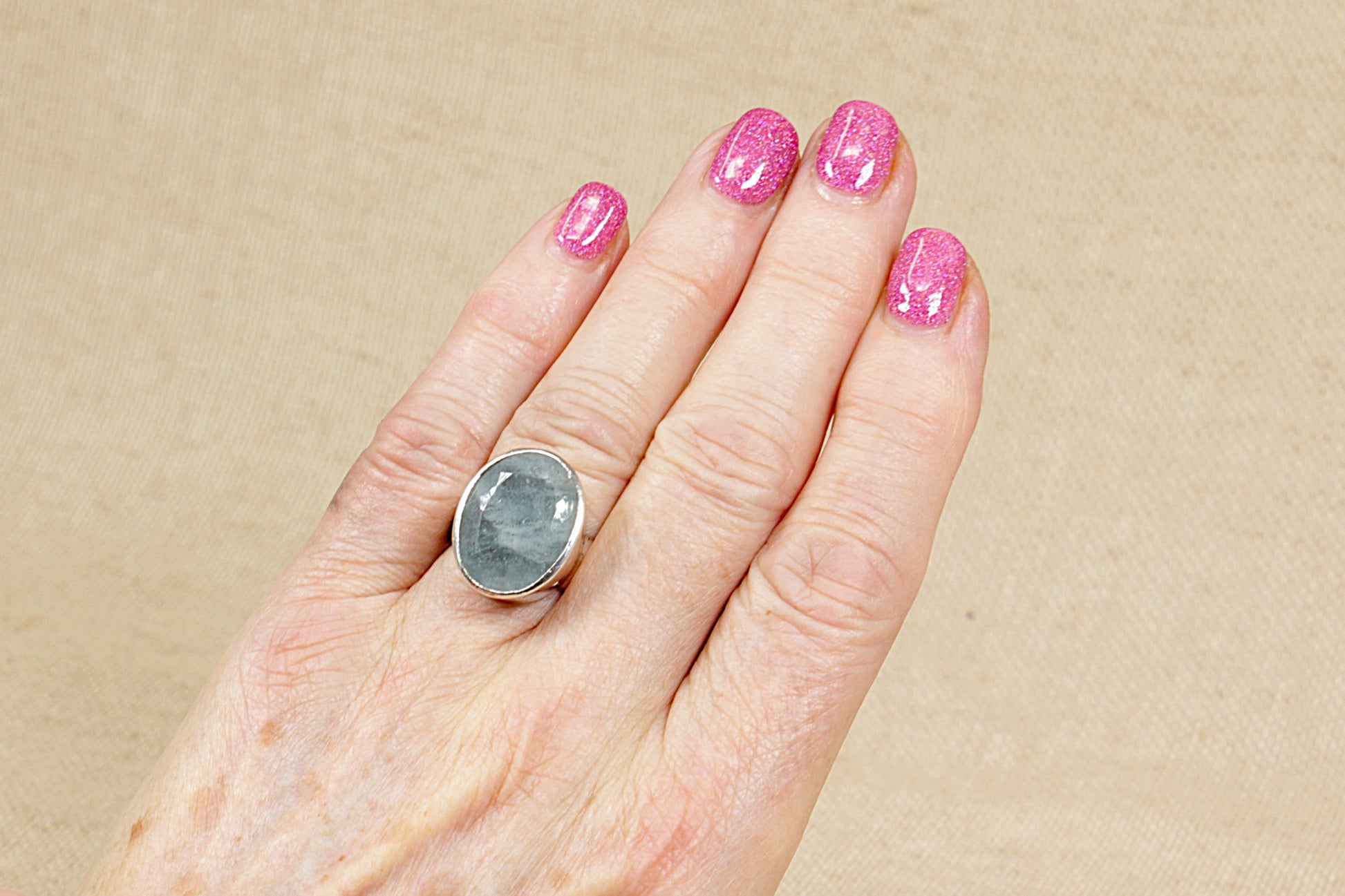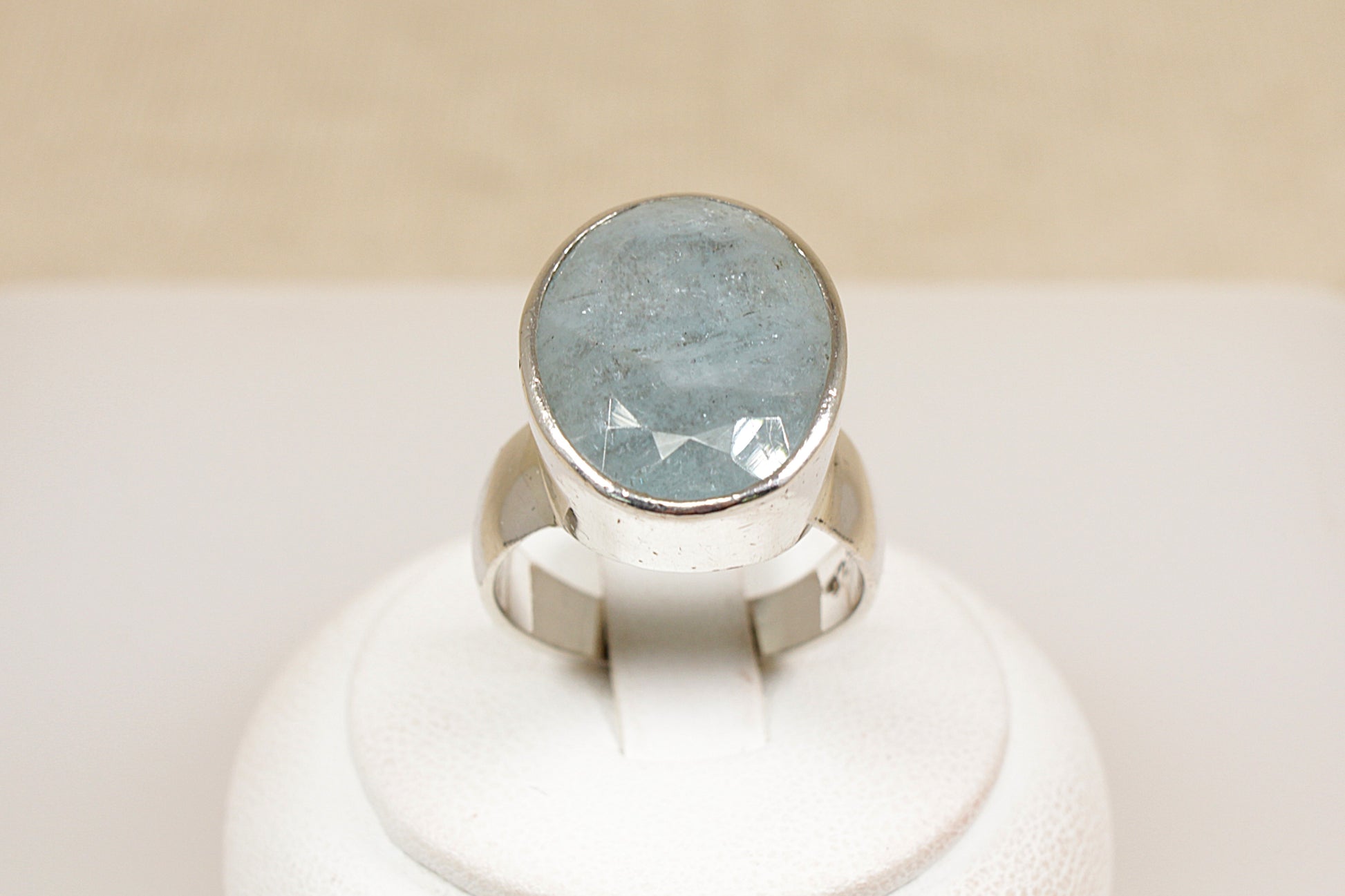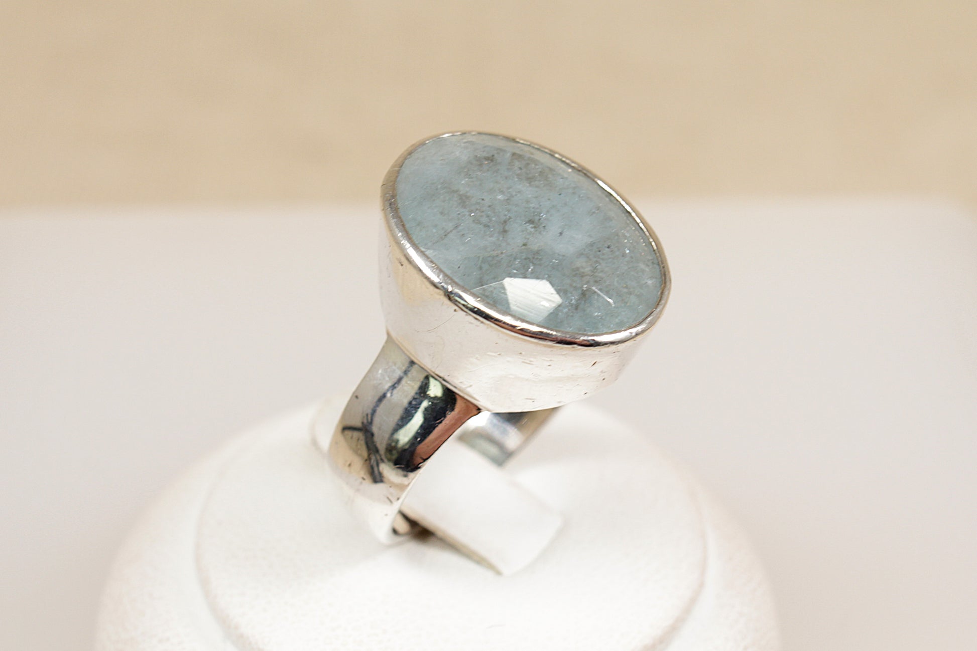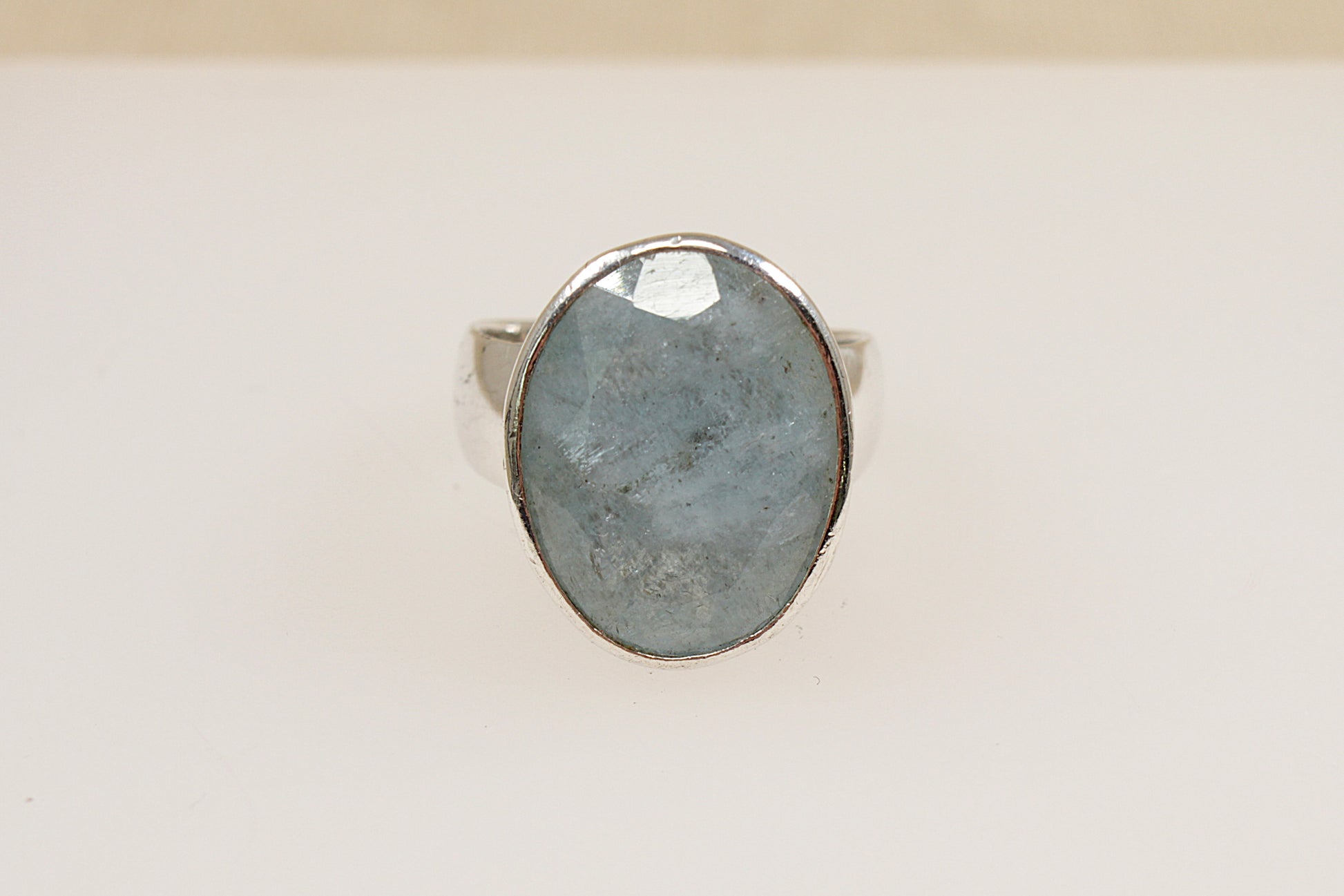 The main feature of this stunning Silver ring is a large oval cabochon cut faceted misty blue quartz gemstone, that is bezel set in a high sided setting; showcasing the beautiful quartz to its full potential.
