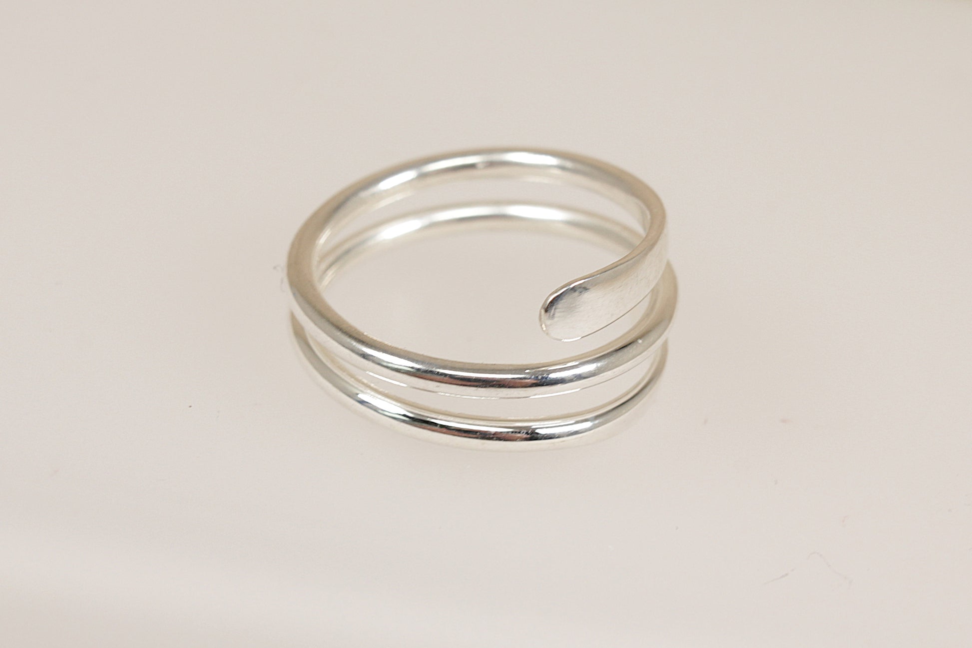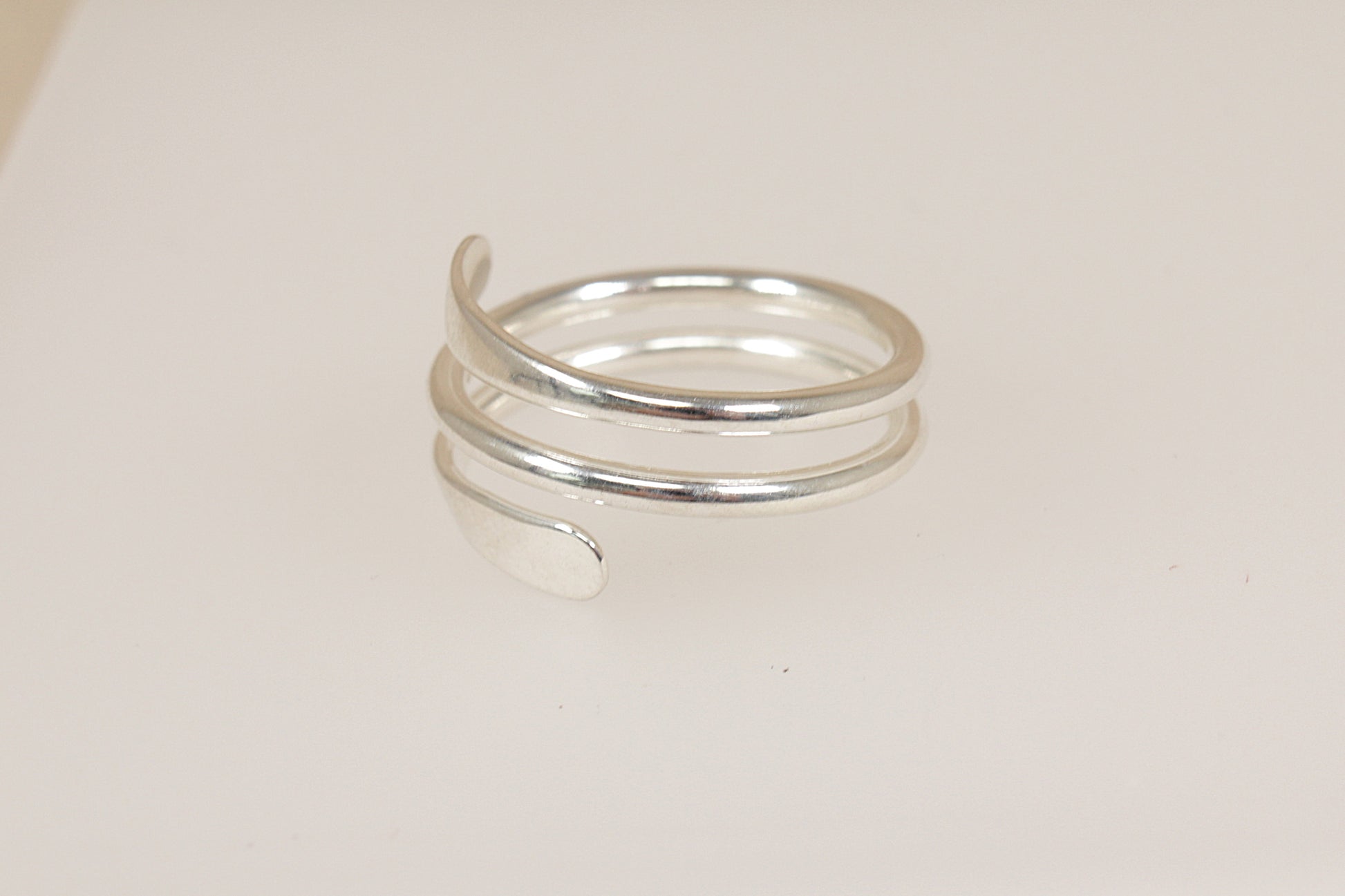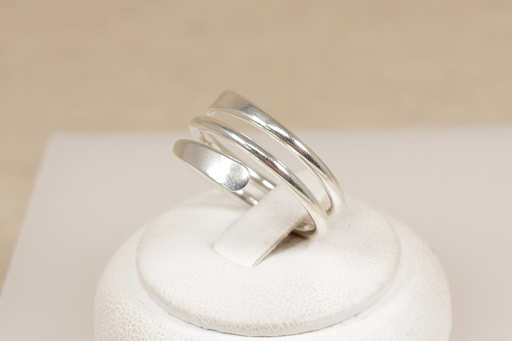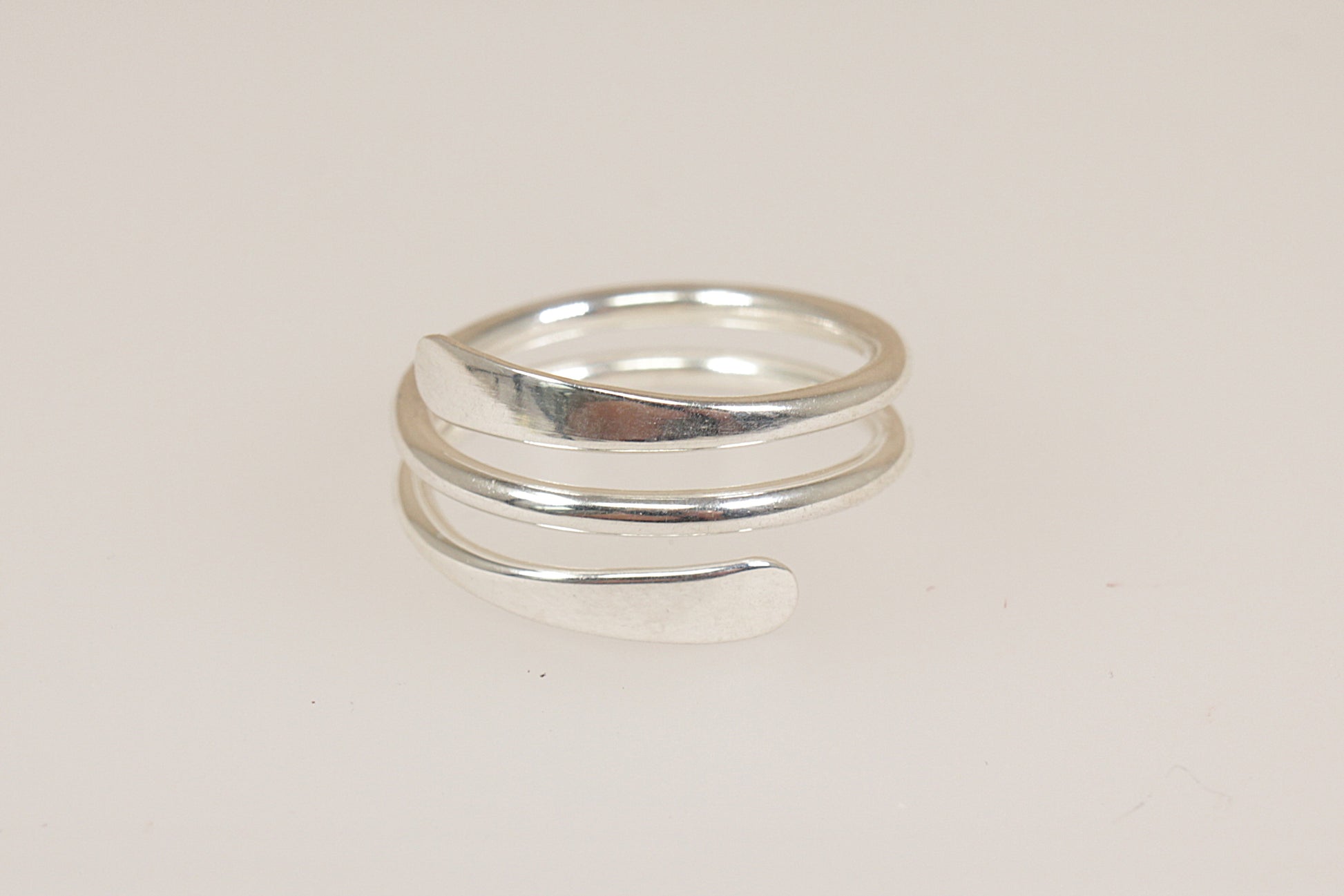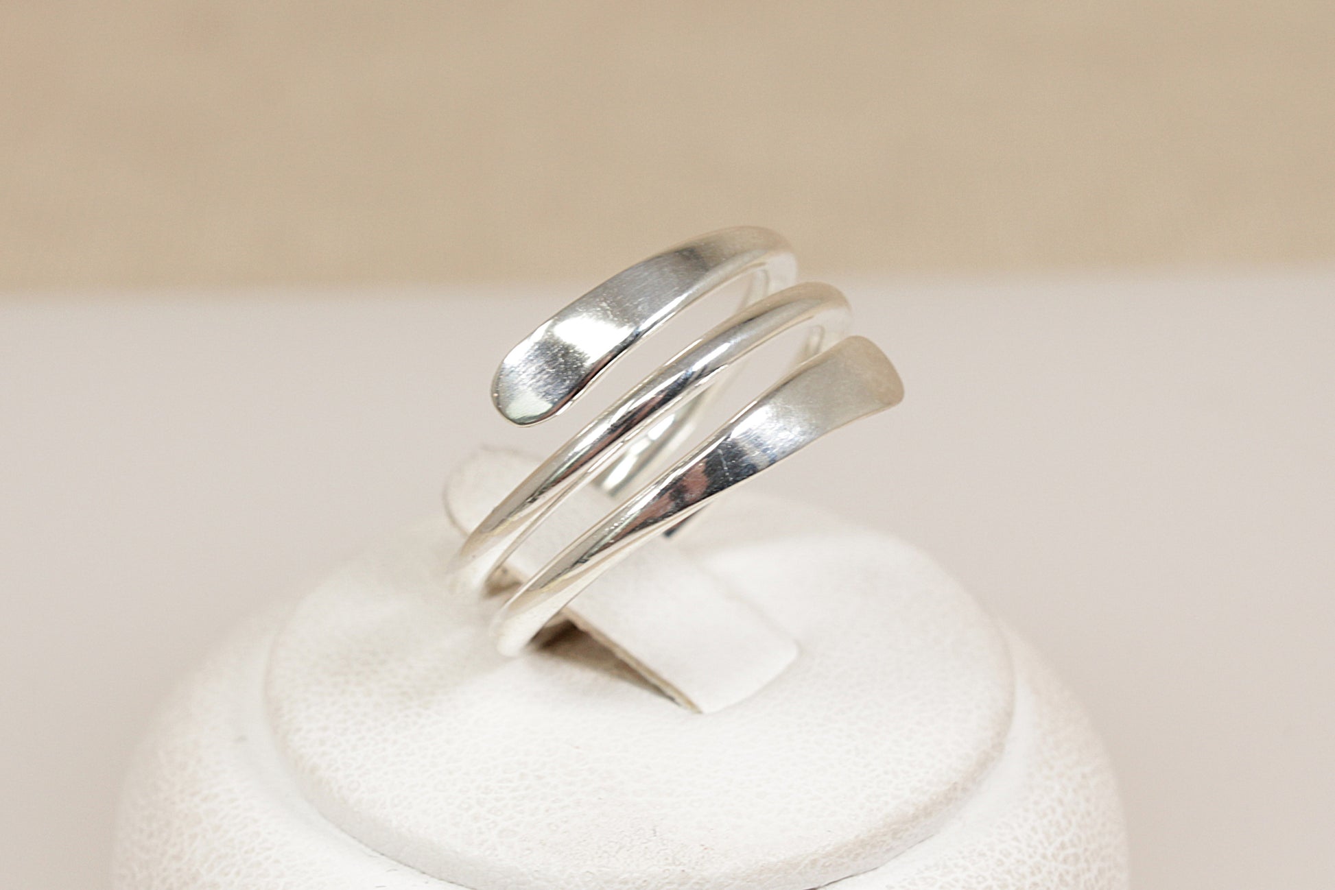 This elegant Silver ring features a graceful coil twist design that wraps around the finger, ending in three smooth bands at each end of the bands it is slightly flat that gives a modern sculptural look. Expertly crafted with a polished finish, it is stamped 925 inside the band for sterling silver.